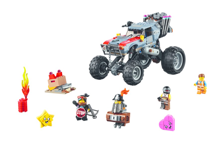 Kids can escape danger by building Emmet and Lucy's Escape Buggy, featuring seats for 2 minifigures, opening doors and hood, foldout arrow gun (non-shooting) and suspension. This fun-packed construction toy also includes a buildable base with an explode function, 3 minifigures and 3 buildable figures—MetalBeard, Star and Heart—with cool weapons and accessory elements.