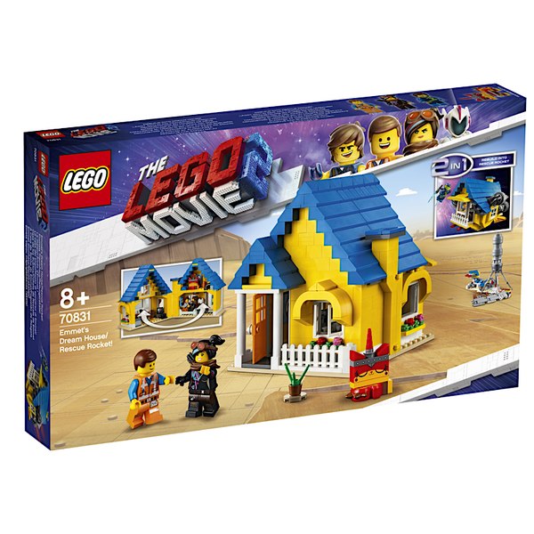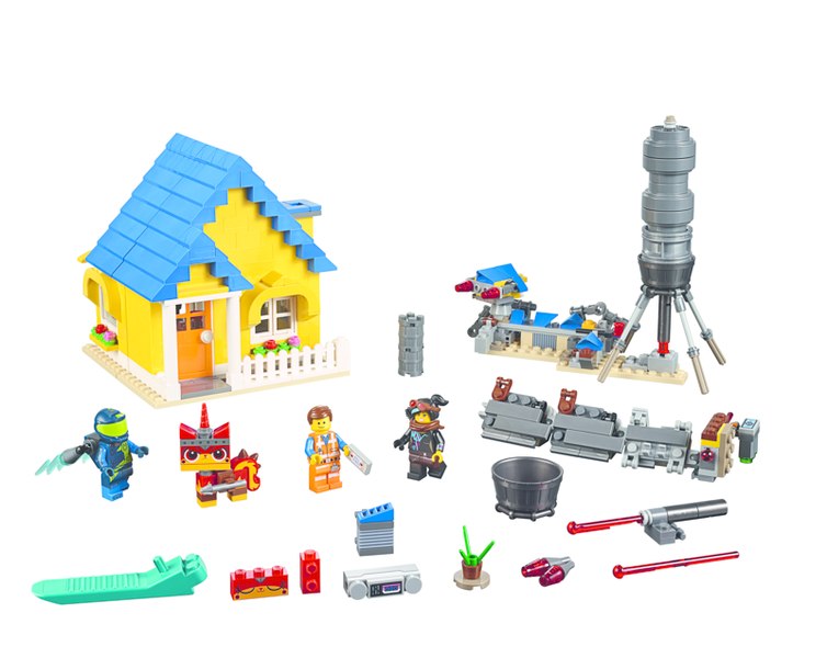 This 2-in-1 building set features Emmet's home which can be rebuilt into a rocket. The house toy opens out for easy interior play and has a detailed living room/kitchen and attic. Remove the roof and use parts from the water tower and barricade to create a rocket with spring-loaded shooters and adjustable engines. Includes Emmet, Lucy, and Rex Dangervest minifigures, plus buildable Planty and Warrior Kitty characters.