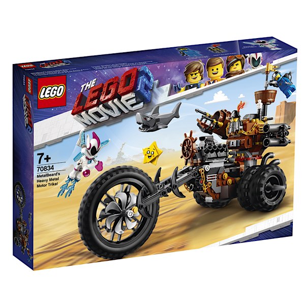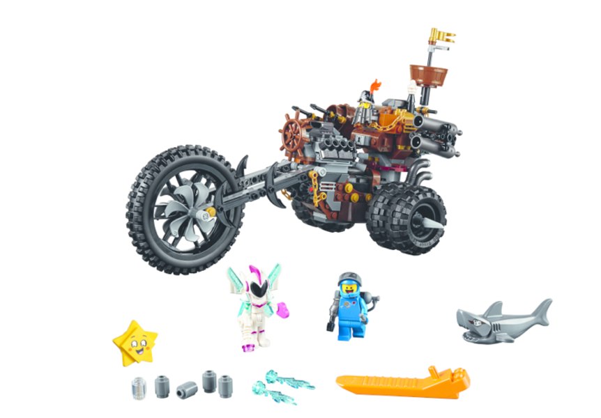 Builders can power into battle against Sweet Mayhem and Star with this fun set that features a built-in MetalBeard minifigure head, rotating turret with adjustable shooting cannons, adjustable shark shooter with snapping jaws, crow's nest and flag and a huge front wheel. Includes an Apocalypse-borg Benny minifigure and a Sweet Mayhem minidoll figure with cool weapons and accessories, plus a brick-built Star figure to recreate action-packed adventures from the film.