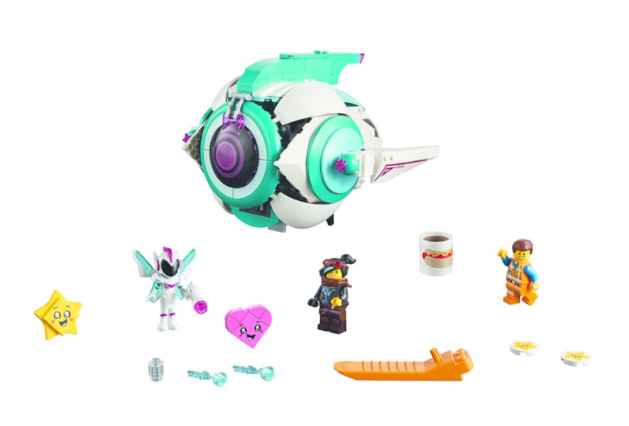 Kids can help Emmet and Lucy evade capture by Sweet Mayhem's Systar Starship, featuring an opening cockpit for a minidoll or minifigure, retractable landing gear, disc shooter, a roll of stickers and an opening prison cell. This fun construction toy includes 2 minifigures, a minidoll figure and buildable Star and Heart toy figures to role-play action from the film.