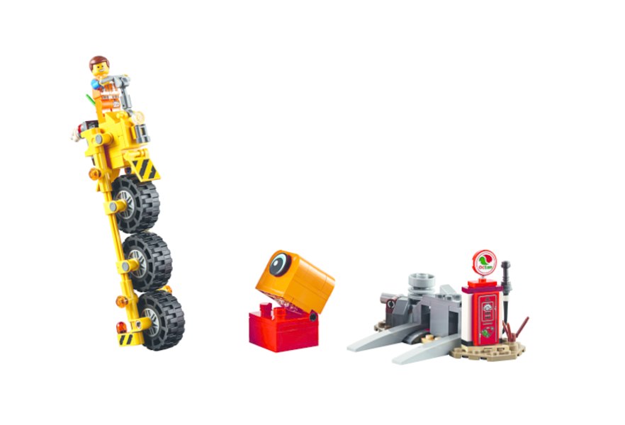 Kids can raise their master-building ability to another level with Emmet's Thricycle! This awesome building set features a minifigure seat, 3 vertically stacked rubber tires and foldout stabilizers. It includes a fuel station, with a buildable gas pump, catapult function and parking spot for the Thricycle, plus THE LEGO MOVIE 2 characters—an Emmet minifigure and a brick-built alien invader with a chomping mouth and rotating cyclops eye. Includes Emmet minifigure and buildable Alien Invader.