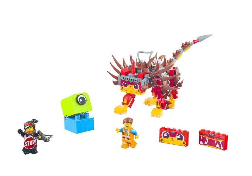 Kids can ride into battle against the alien invader with this building set. Ultrakatty features a minifigure cockpit, a posable head which can be rebuilt for 3 different facial expressions, and a posable tail and legs. This awesome building toy includes Lucy and Emmet minifigures, plus a brick-built alien invader with a chomping mouth and rotating eye, to recreate action-packed scenes from the film.
