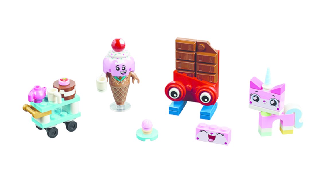 Builders can pretend to enjoy a drink and a snack with this fun building set featuring 3 buildable LEGO MOVIE 2 figures—Unikitty, Ice Cream Cone and Chocolate Bar—plus a tea trolley with teapot, coffee cup and cake accessory elements designed to inspire creative play.