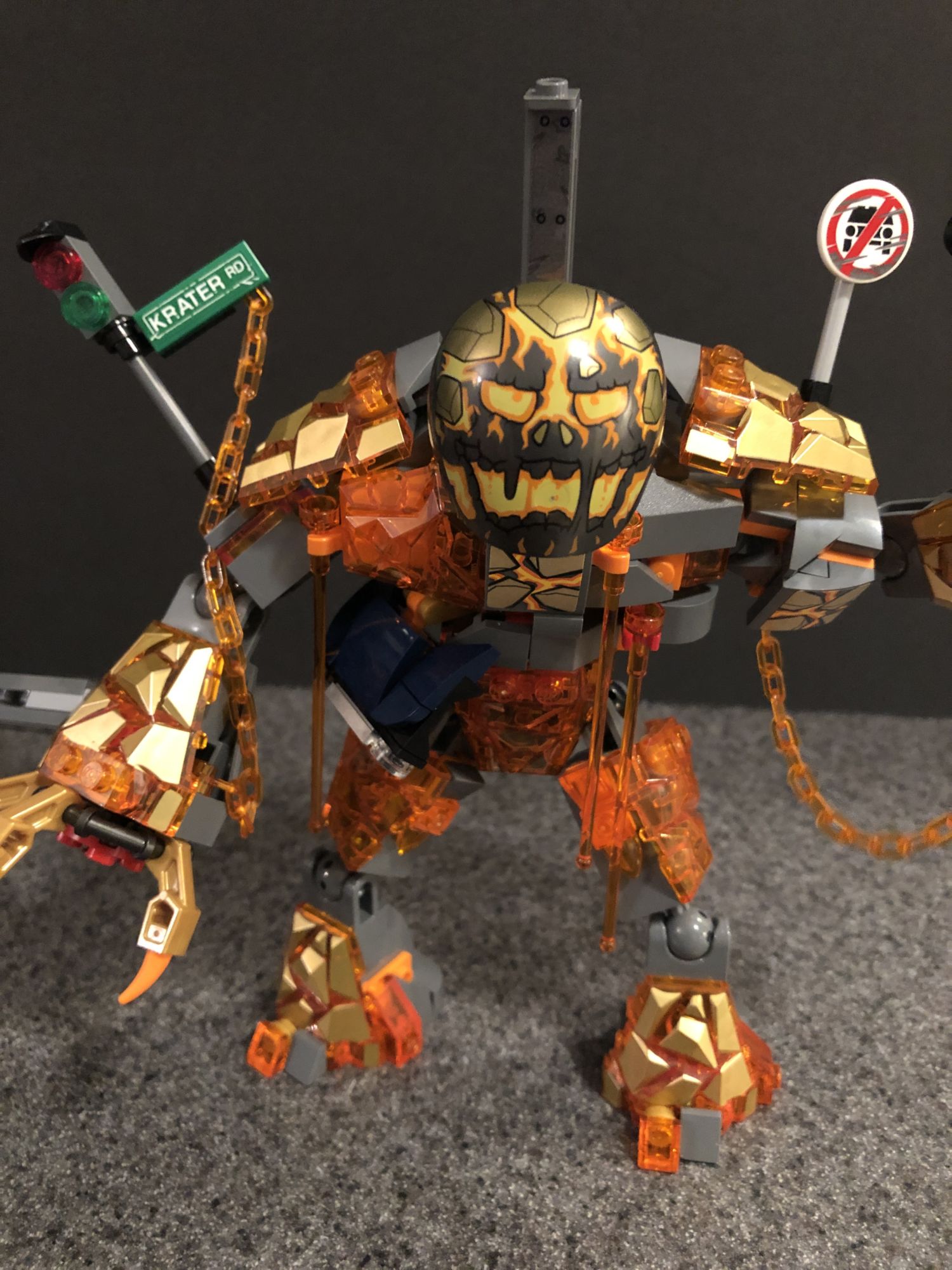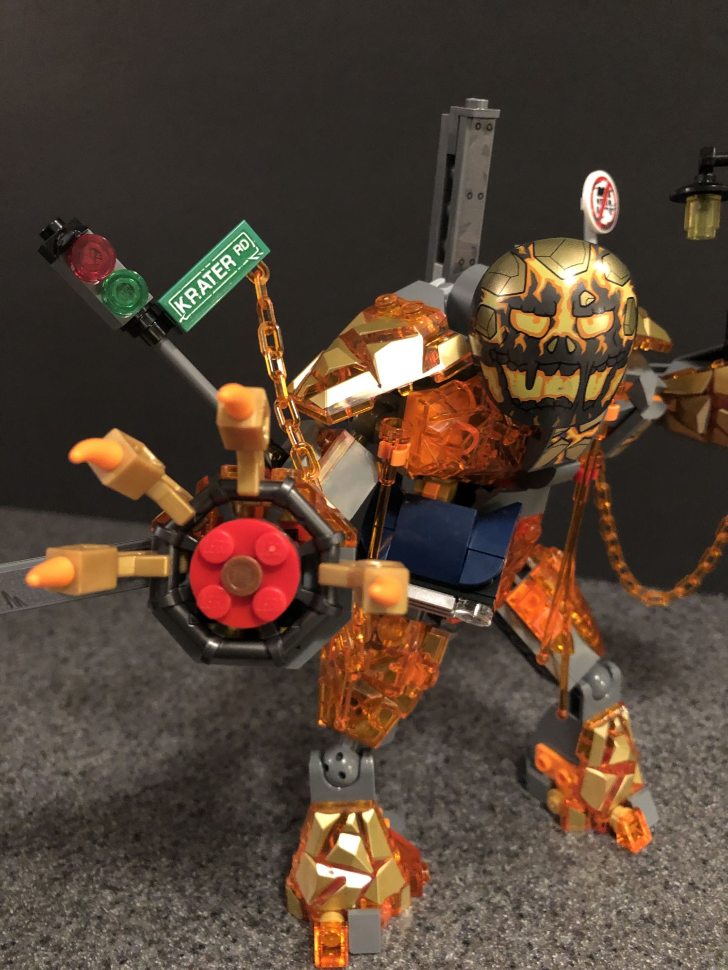 When he is all the way done, the little details are what sticks out the most. The road signs and such sticking out all over him are awesome looking, and stay anchored really well to his body. He is a little top heavy, so watch how you pose him in your displays, but he is easy to maneuver around. He looks so menacing and gnarly, one of my favorite features are the attached lava drips around his chest. It gives the figure so much depth and substance, and when you add in the chains and such, it brings the whole thing together.
