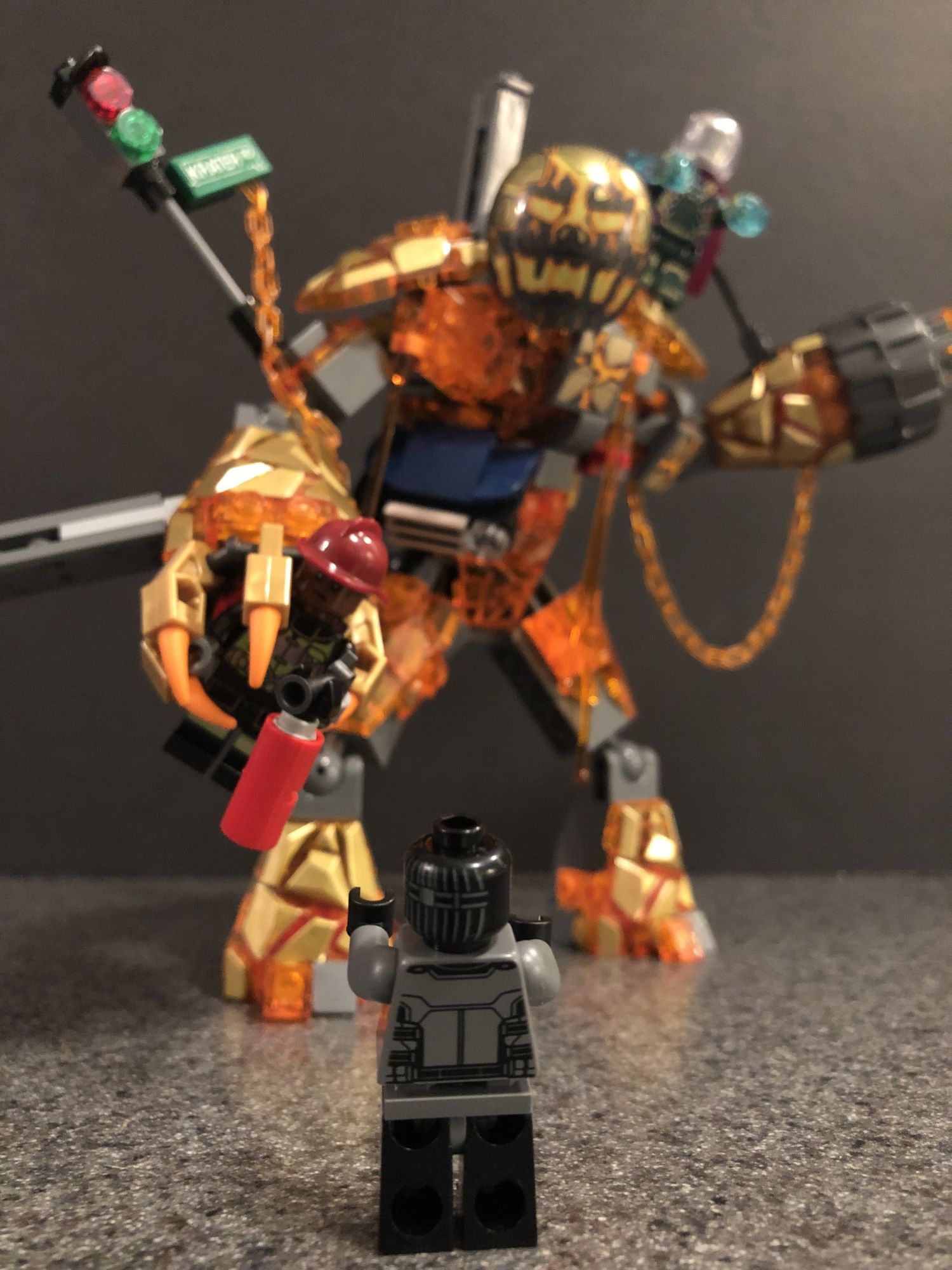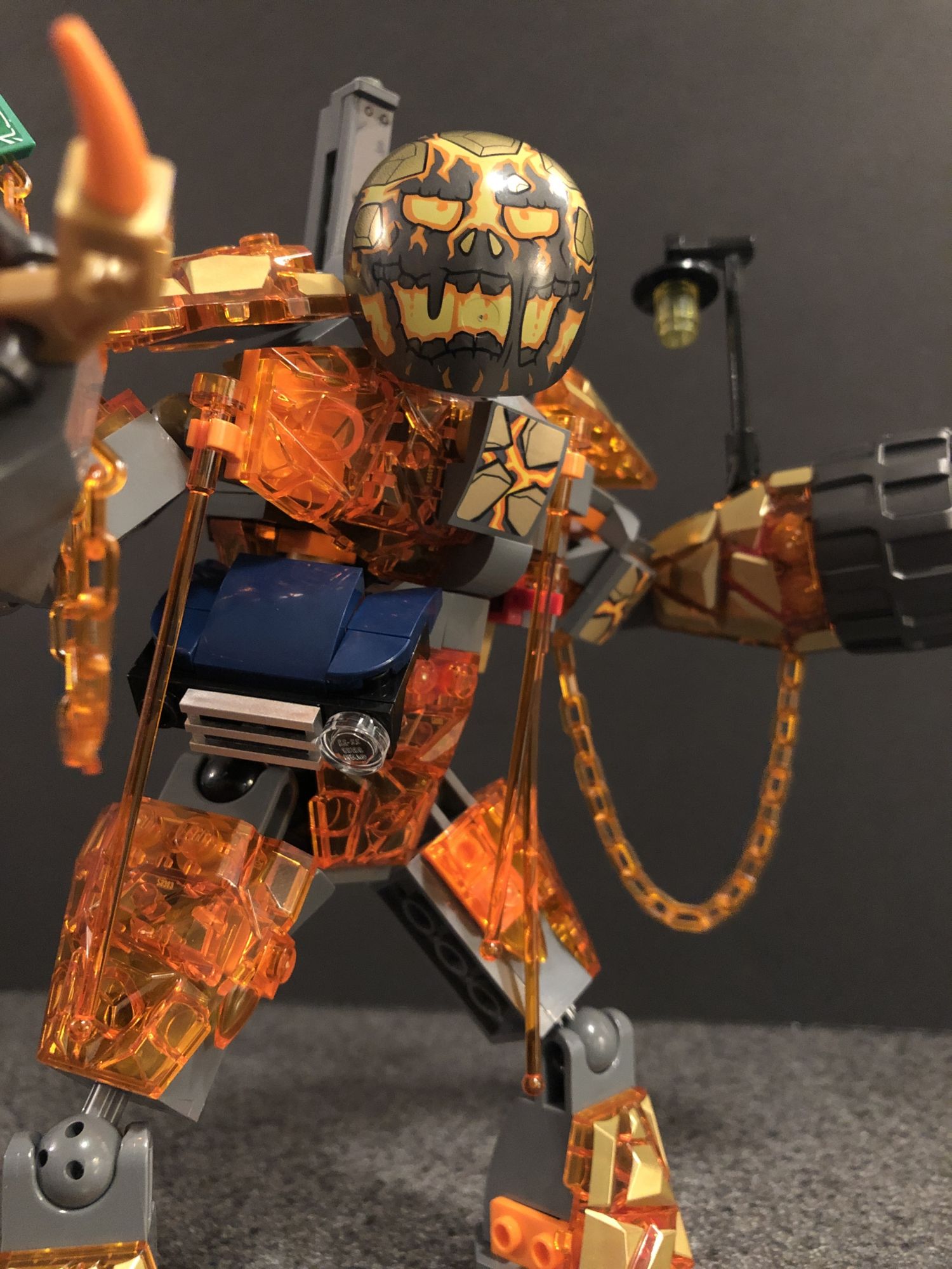 The mini-figs are spread through the two bags while you build out Molten Man. he consists of building a bunch of mini-bulids and combining them to form the body. These are repetitive builds, making you do most steps twice for both sides of the massive figure. The translucent orange bricks really pop on the build itself as well, making for some really striking angles when the light catches the bricks.