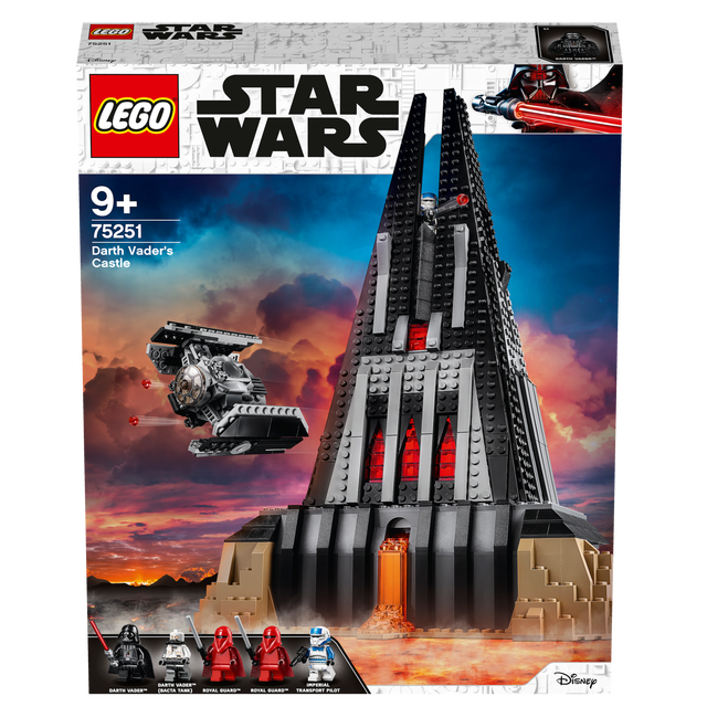 Battle with Darth Vader in his fortified castle!Set the scene for action on planet Mustafar with LEGO® Star Wars 75251 Darth Vader's Castle! This building set of Vader's mysterious stronghold features lots of great details, including a brick-built lava flow, an underground hangar with mouse droid and docking station, ancient Sith shrine with holocron, racks for extra ammunition, and secret compartments hiding more Sith relics. The hangar also houses a buildable TIE Advanced Fighter model with stud shooters and space to sit the Darth Vader minifigure. There's also a bacta tank, Darth Vader's meditation chamber with holographic communication unit, and a meeting platform at the top with a defensive stud-shooter cannon. As well as classic Darth Vader, the set also includes a bacta tank version of the Dark Lord, plus 2 Royal Guards and an Imperial Transport Pilot.