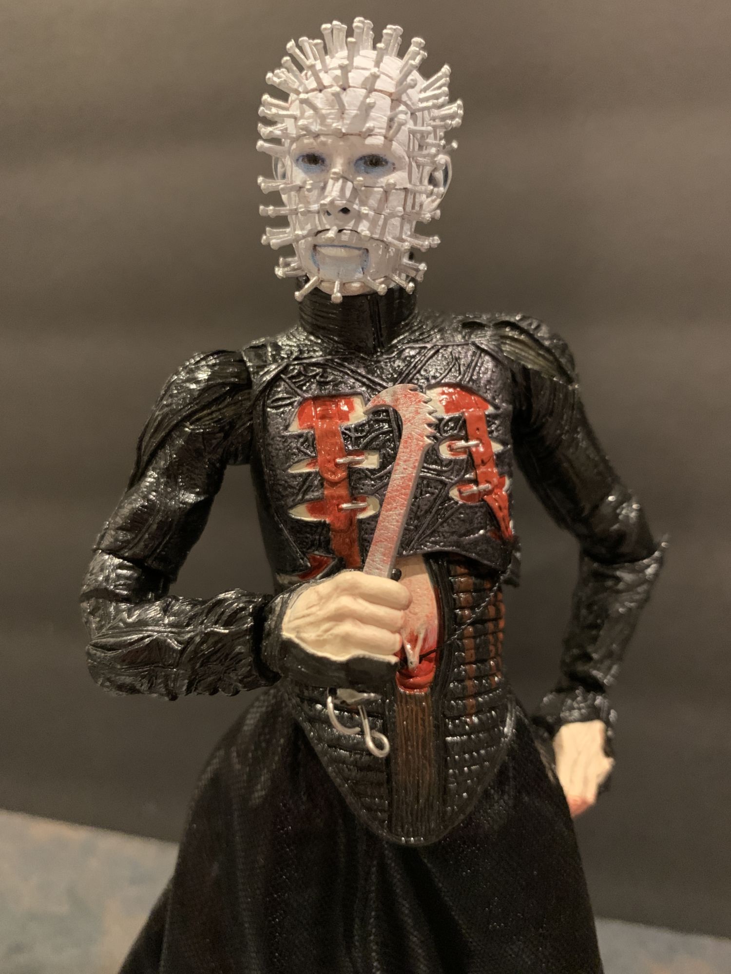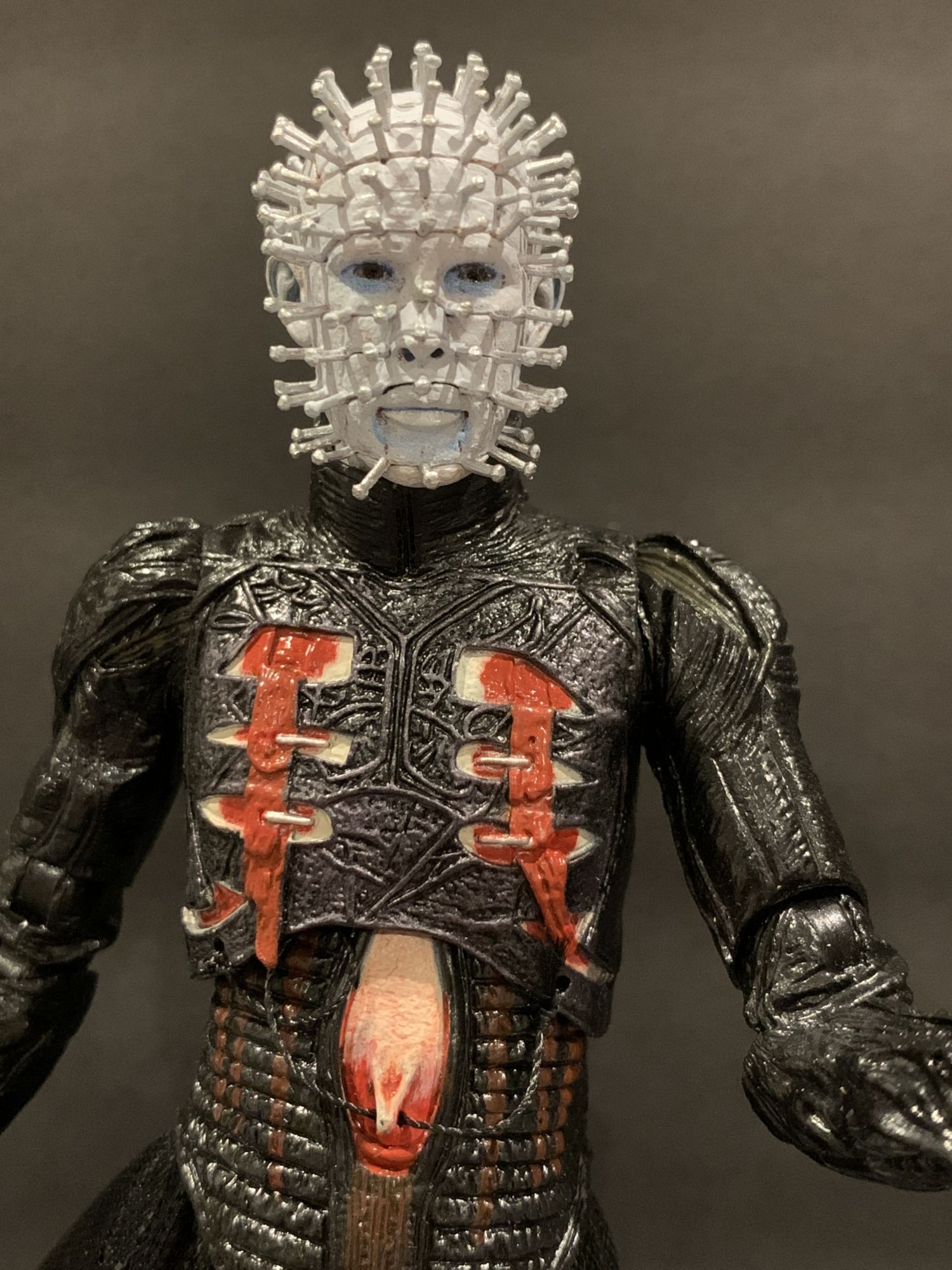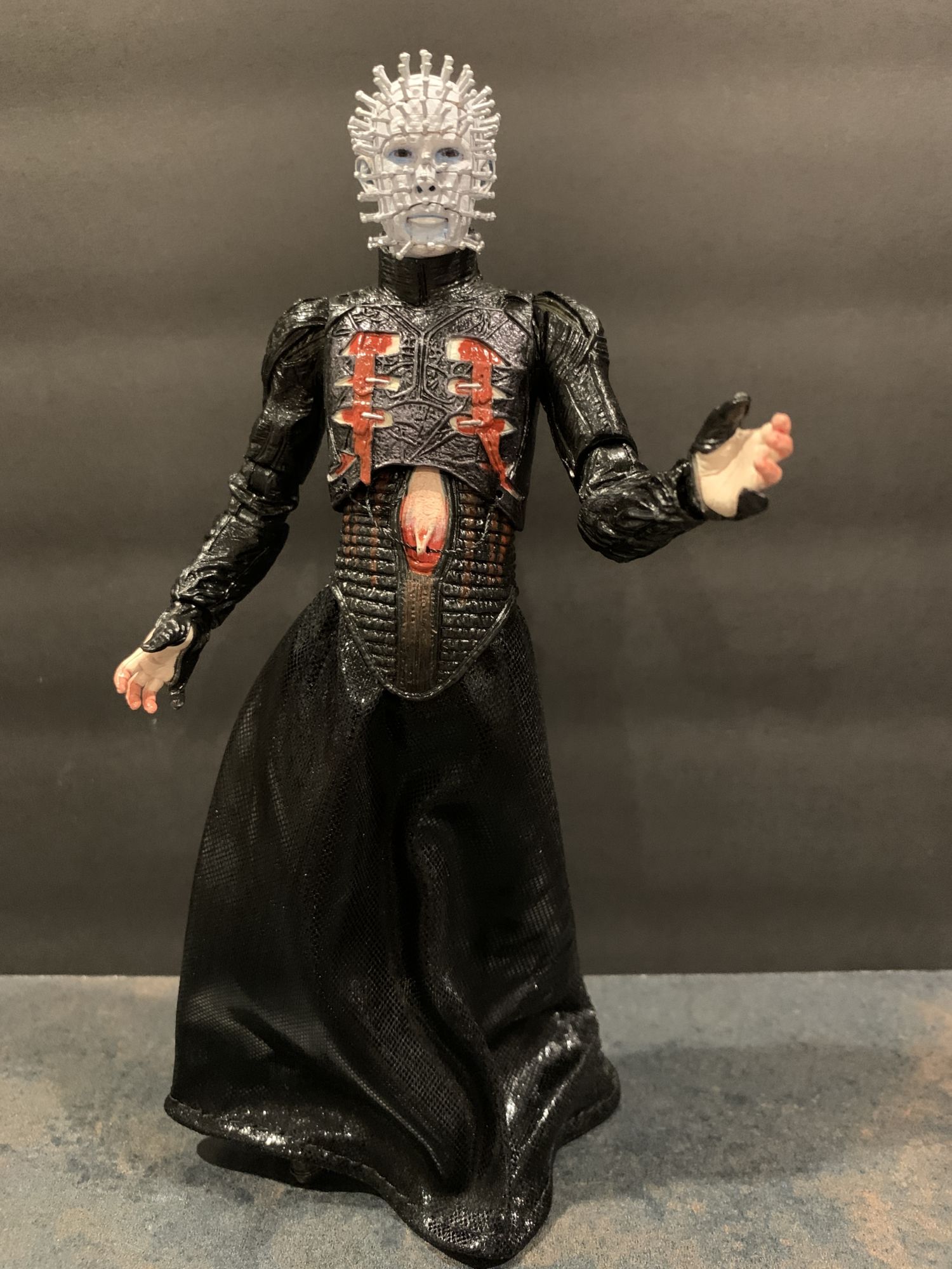 But until then, we open our toys around these parts. And once you get Pinhead out of the box, you instantly know you have something special on your hands. Fully articulated, it is super easy to make this new figure look more elegant than past releases. He has always been more regal than other horror characters, more finesse. That is present here, as he looks like he is almost levitating and inviting you in. That has everything to do with the amazing detail on the headsculpts and long legs under the soft goods skirt. His fetish garb has a great sheen to it, the way the light hits the black and blood wash feels menacing and cold. The high collar neck piece is non-restrictive. It just feels special in your hand.