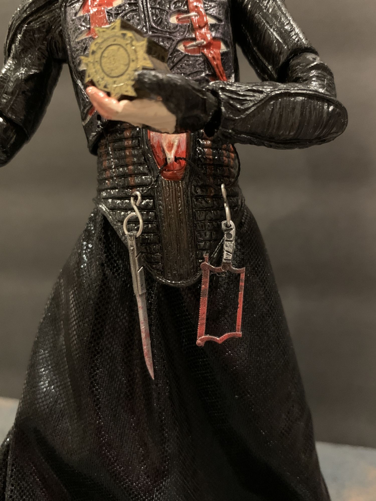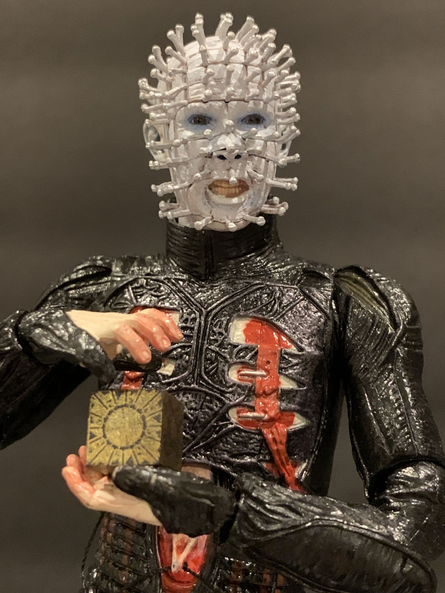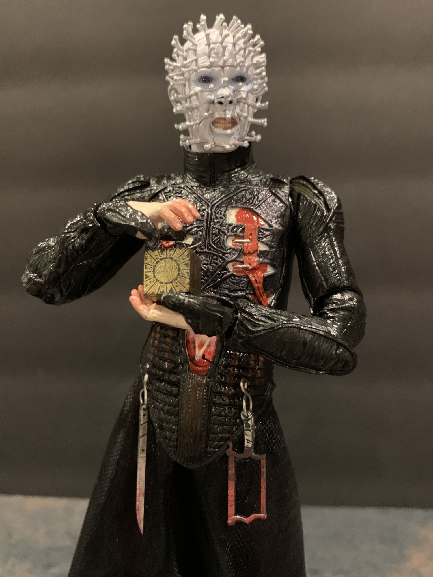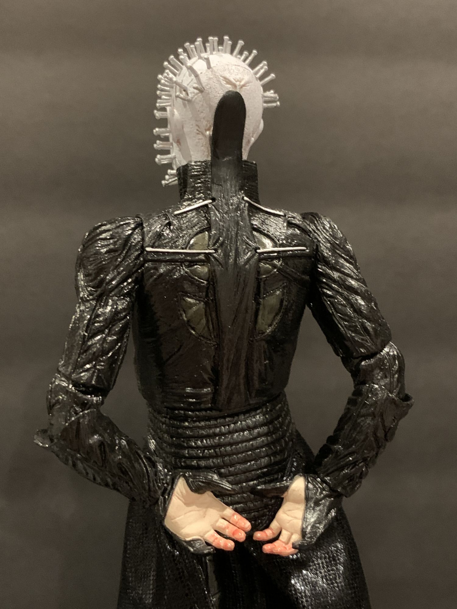 But until then, we open our toys around these parts. And once you get Pinhead out of the box, you instantly know you have something special on your hands. Fully articulated, it is super easy to make this new figure look more elegant than past releases. He has always been more regal than other horror characters, more finesse. That is present here, as he looks like he is almost levitating and inviting you in. That has everything to do with the amazing detail on the headsculpts and long legs under the soft goods skirt. His fetish garb has a great sheen to it, the way the light hits the black and blood wash feels menacing and cold. The high collar neck piece is non-restrictive. It just feels special in your hand.