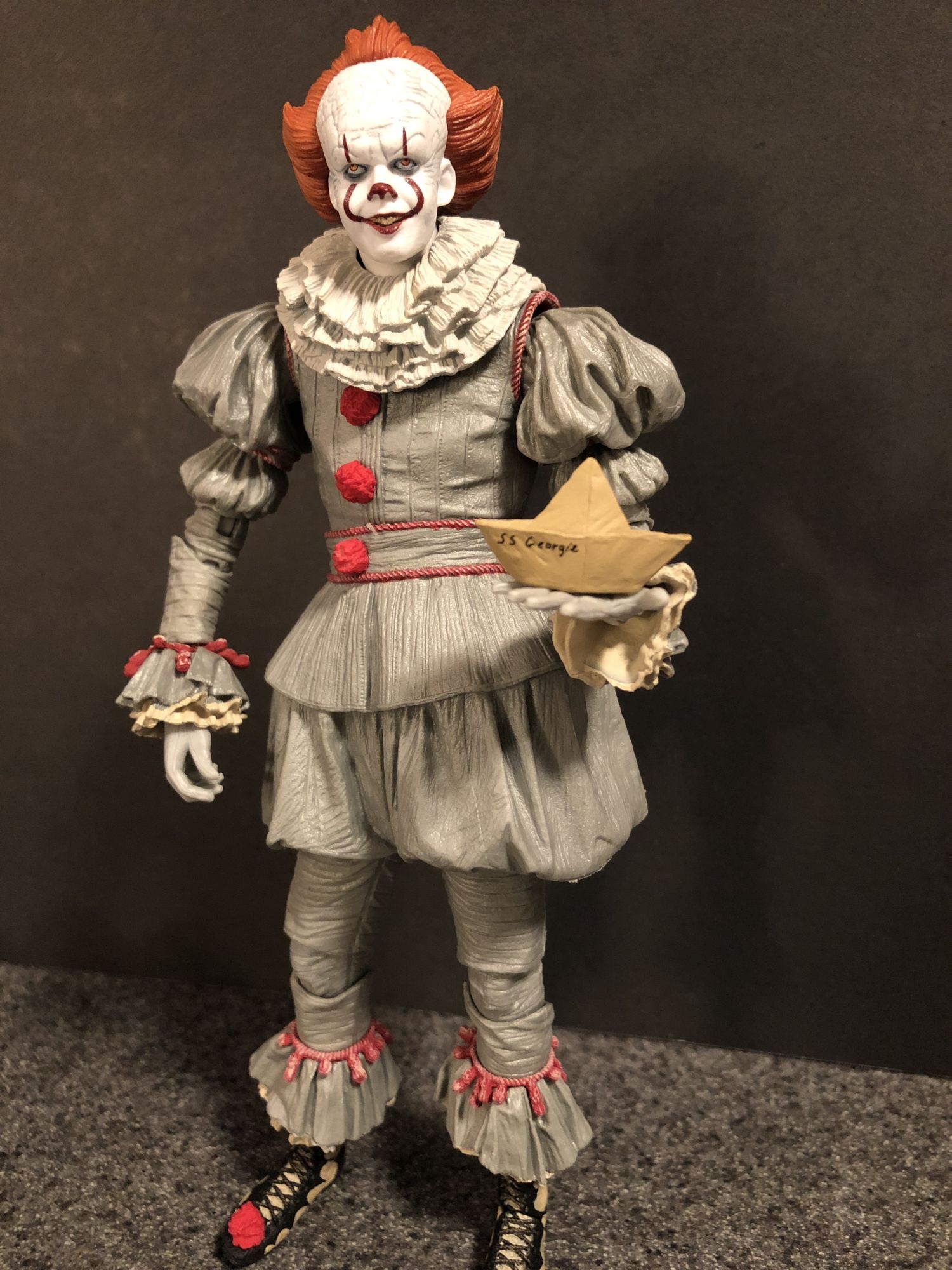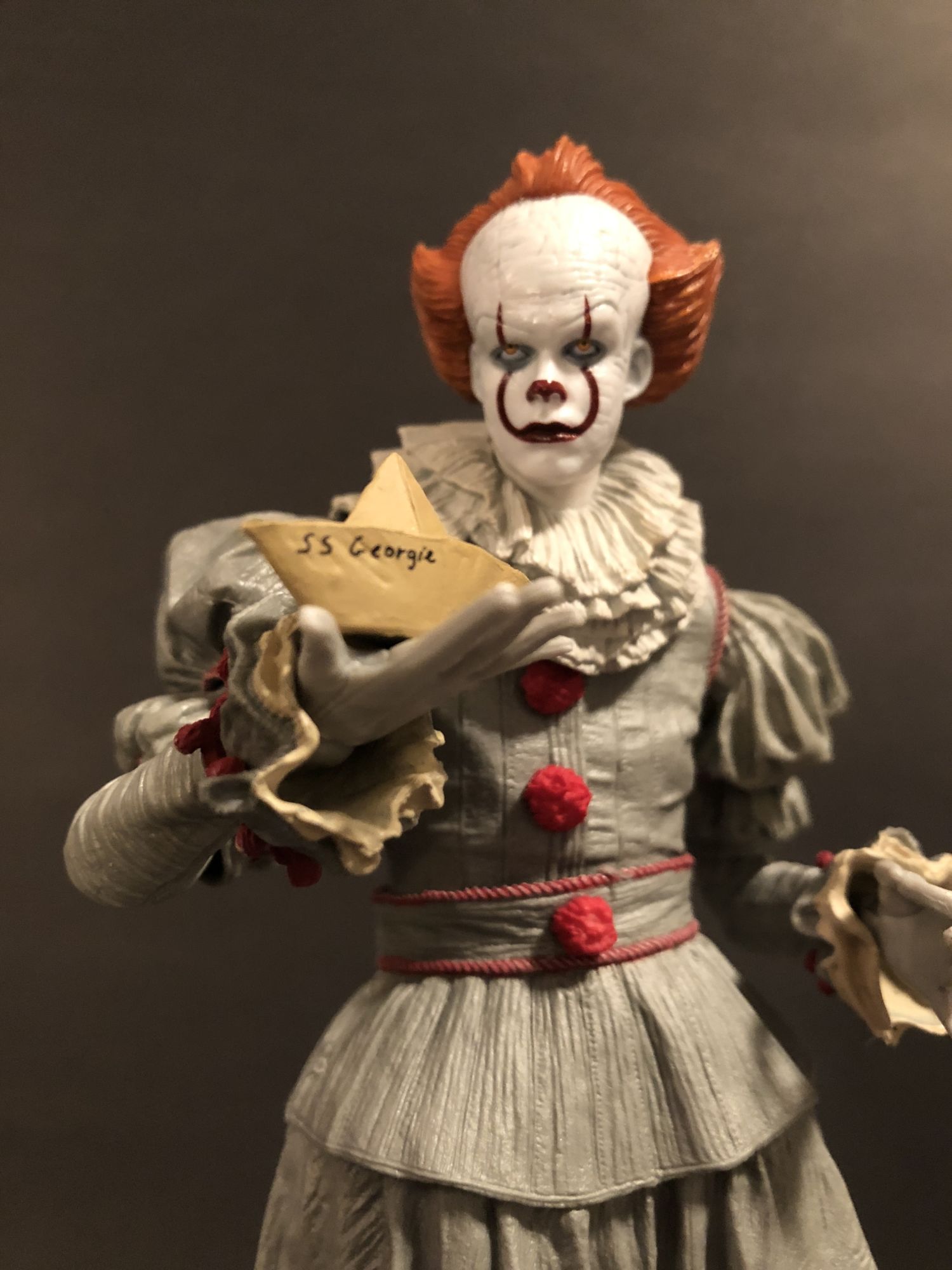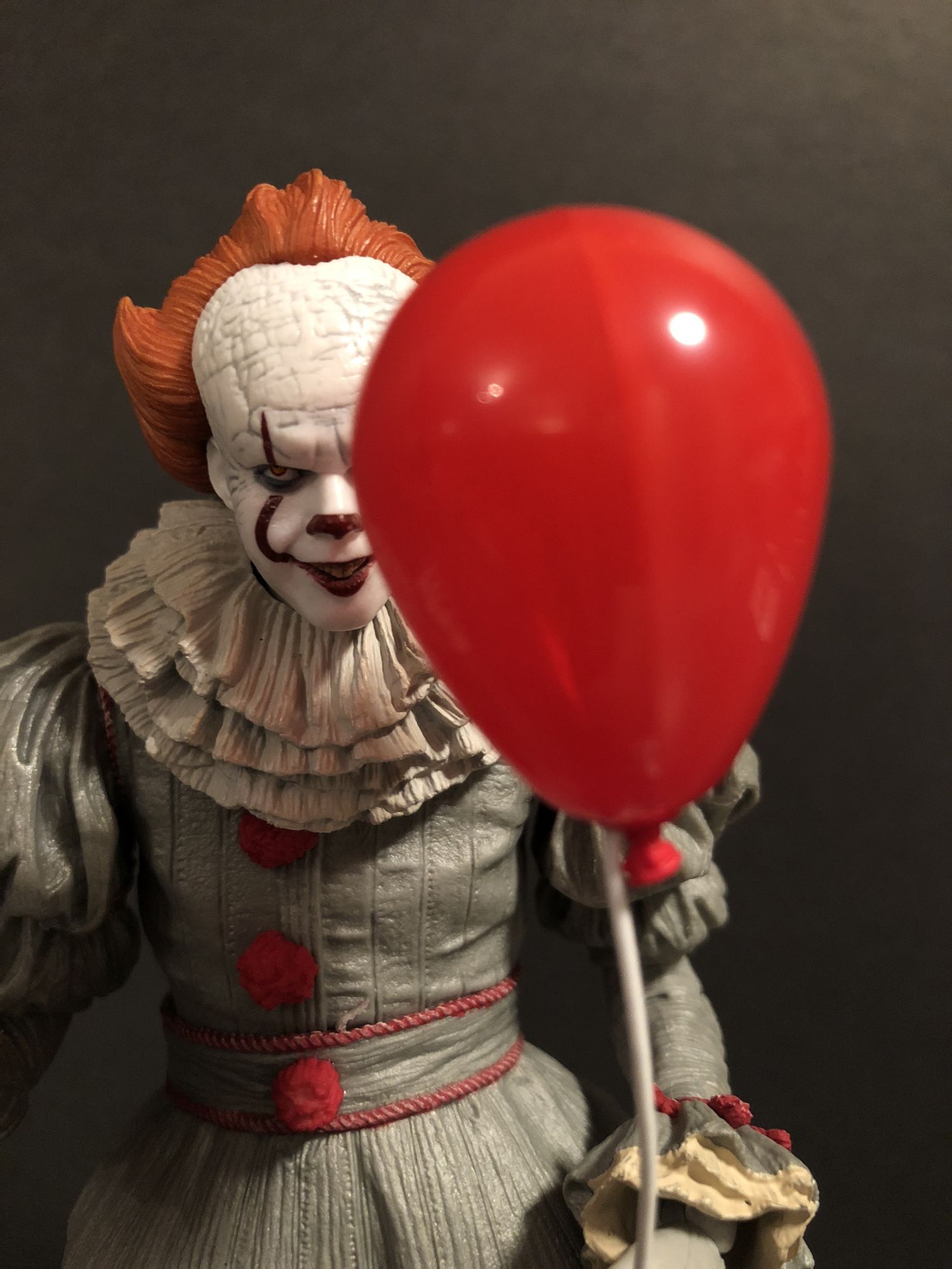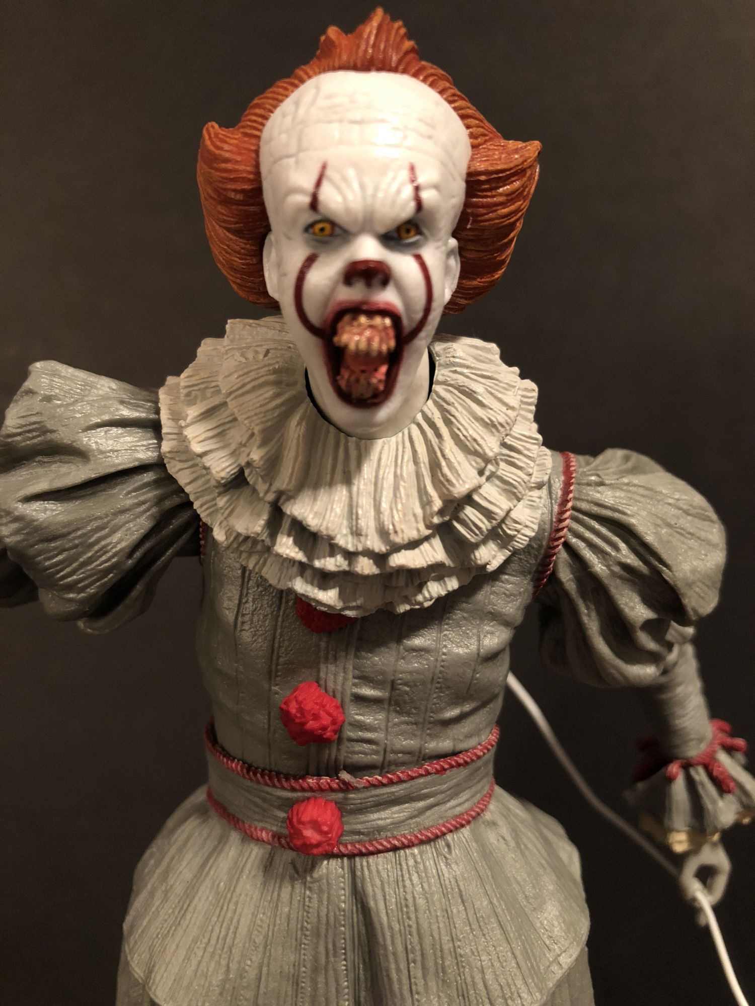 But, I open my figures. And once you get Pennywise out of the box, you get a true appreciation of the sculpting work done on this guy. The amount of detail on the outfit is incredible, I actually forgot that this was not real fabric until I got him out of the box. Even the three red poof balls look real. The gray used on his costume really shines the more shadows hit the figure, it gives everything a more sinister, realistic effect. Great, great stuff there. Articulation is everywhere, and while in the past that has been an issue with keeping some of my Xenomorphs upright, that is far from the case here. no matter how you choose to pose him, Pennywise looks menacing and creepy.