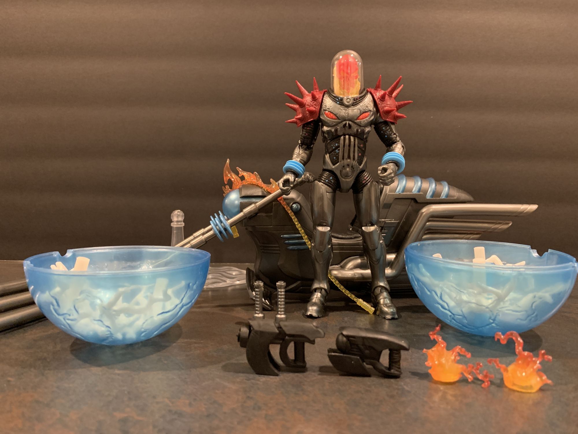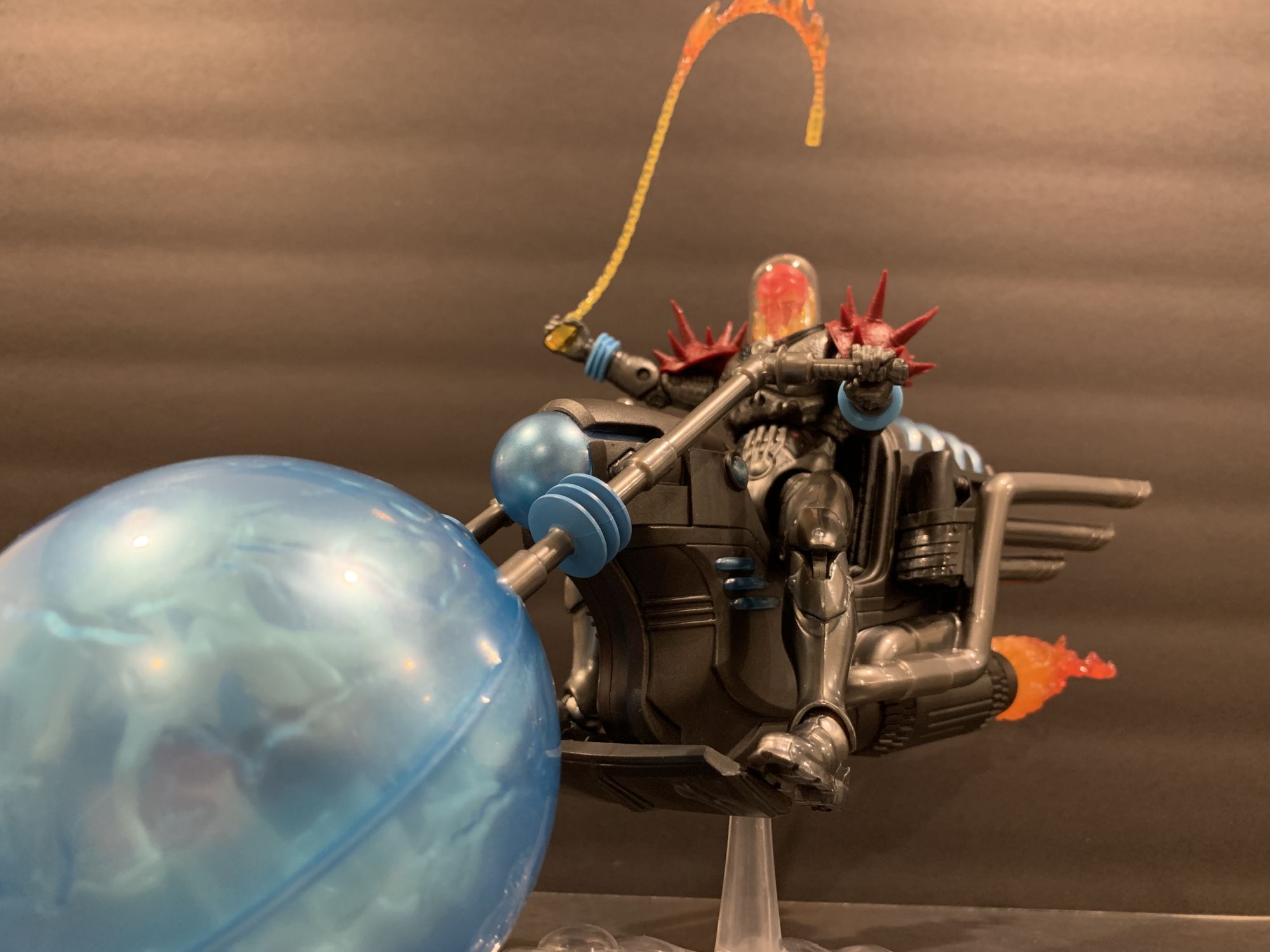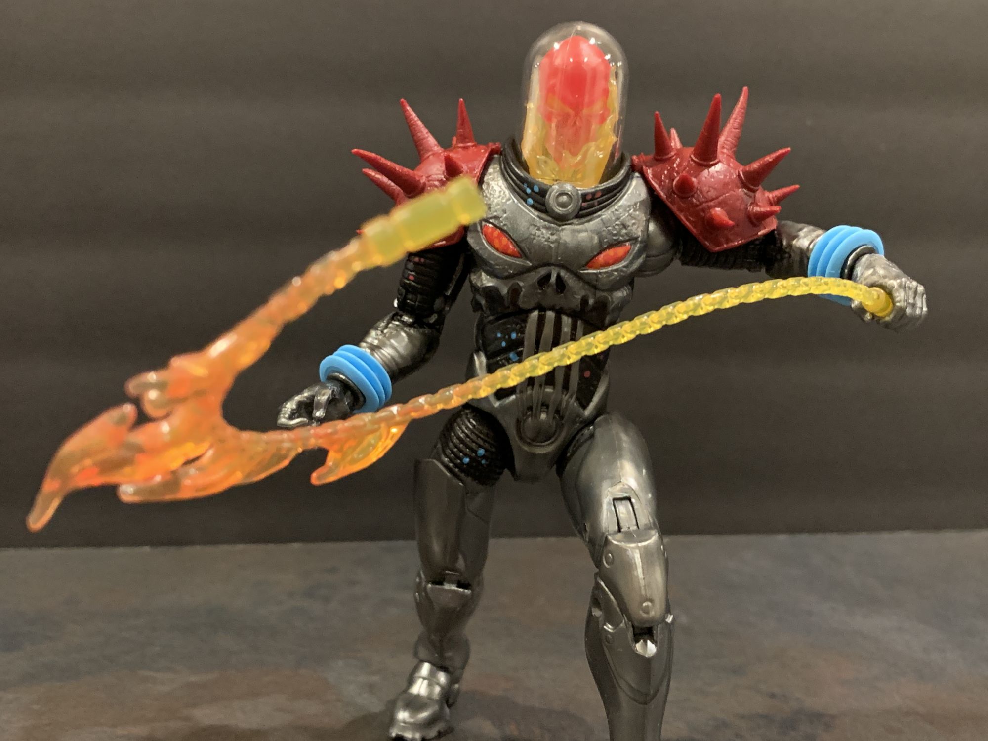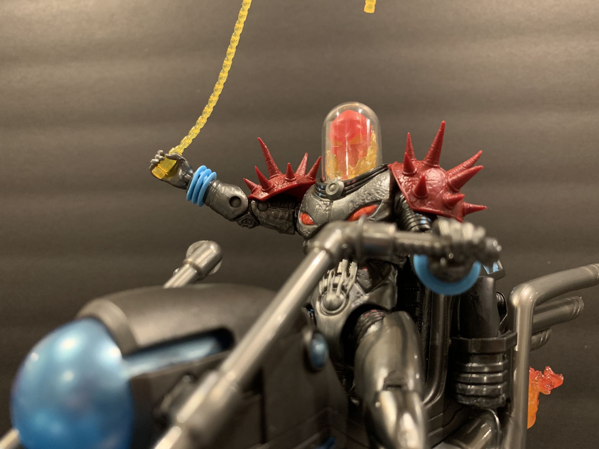 As for Cosmic Ghost Rider himself- he takes his rightful place with the recently released Doctor Doom as Marvel Legends Figure of the Year so far. This thing is flawless. He has great articulation and balance, and I absolutely love that you can remove his dome and adjust the flaming skull head. The armor looks incredible as well, and his spiked shoulder pads are not a hinderance at all while posing. That includes when he is on the bike, he easily reaches the handlebars while in the sitting position and can achieve great poses with both his blasters and chain. The chain this time is also a bit better to work with, and doesn't sag as much as it did with the original Ghost Rider Marvel Legends Deluxe figure from a while ago. He looks menacing, and is a perfect add to your shelf with or without the bike.