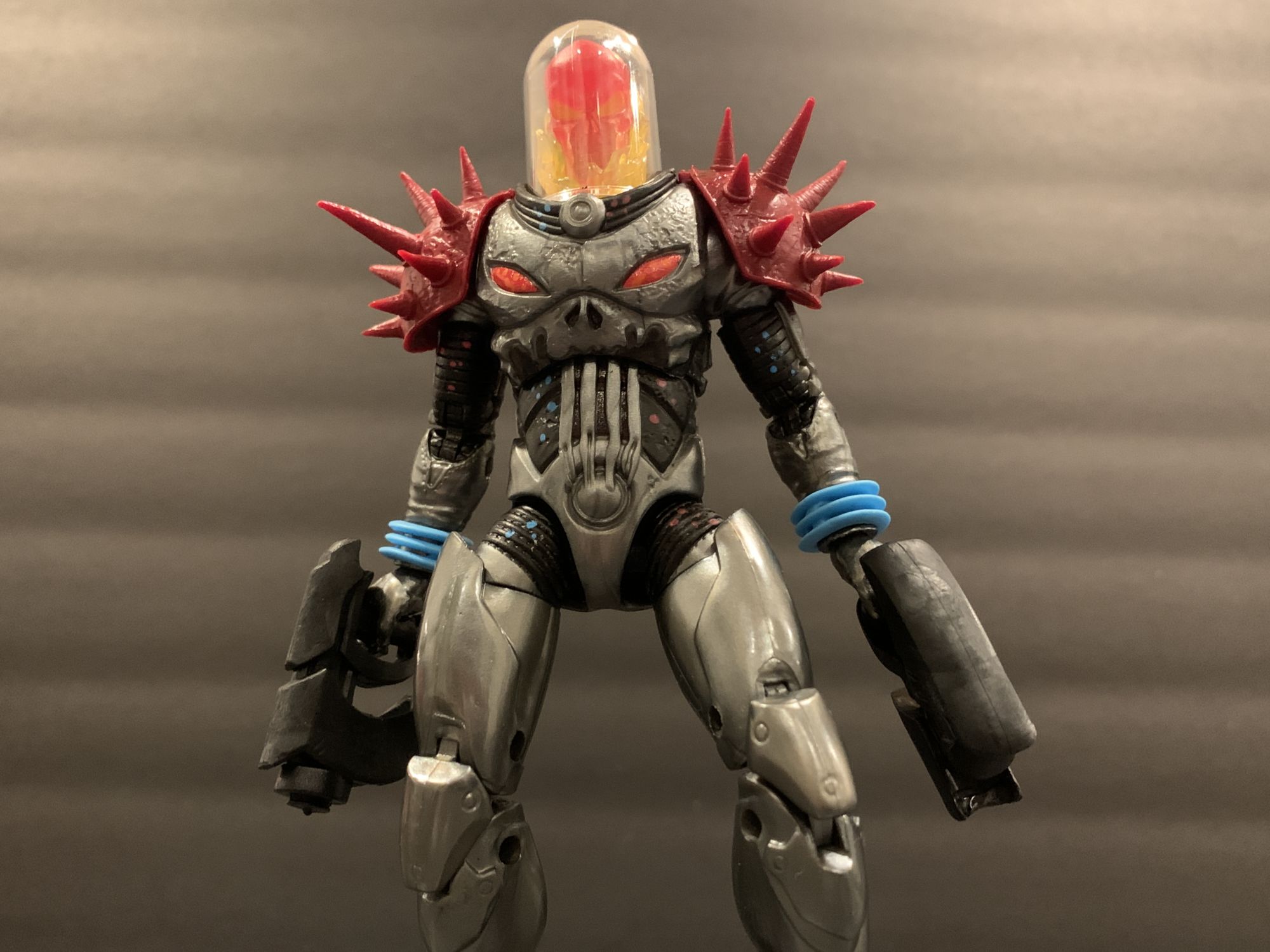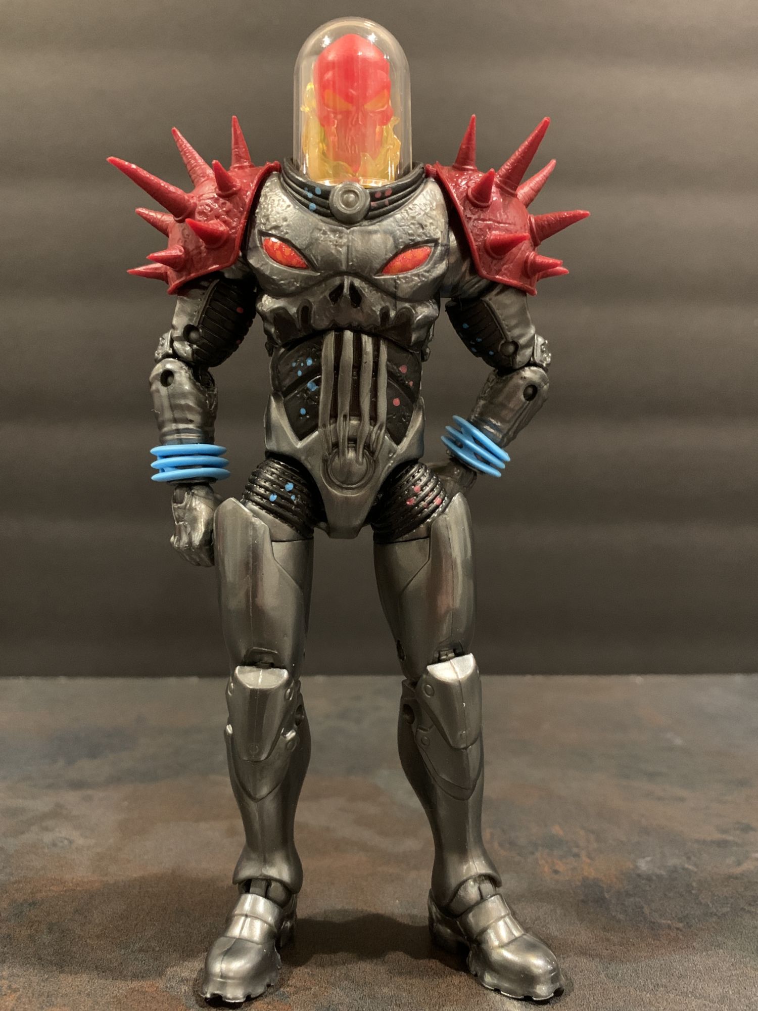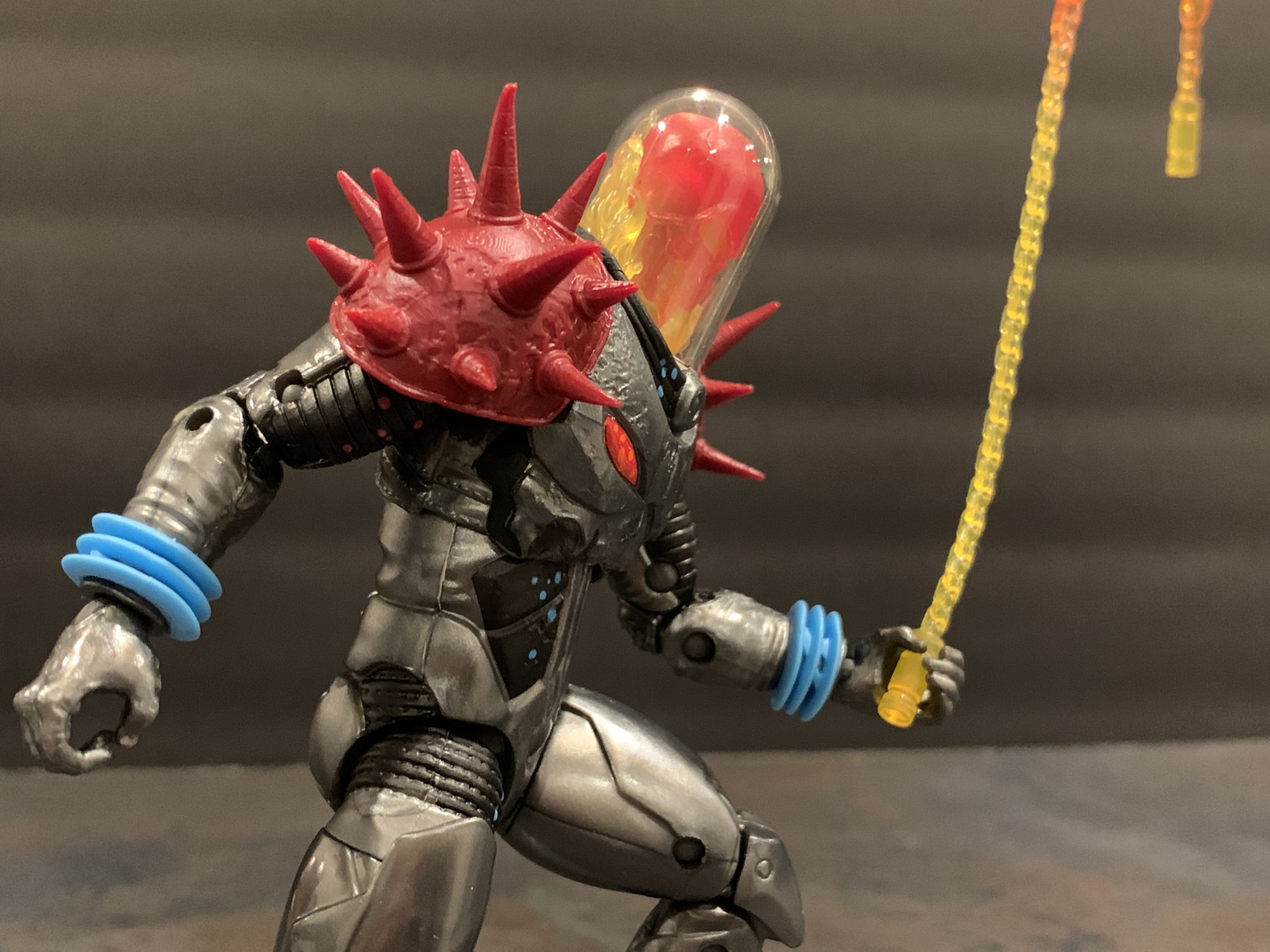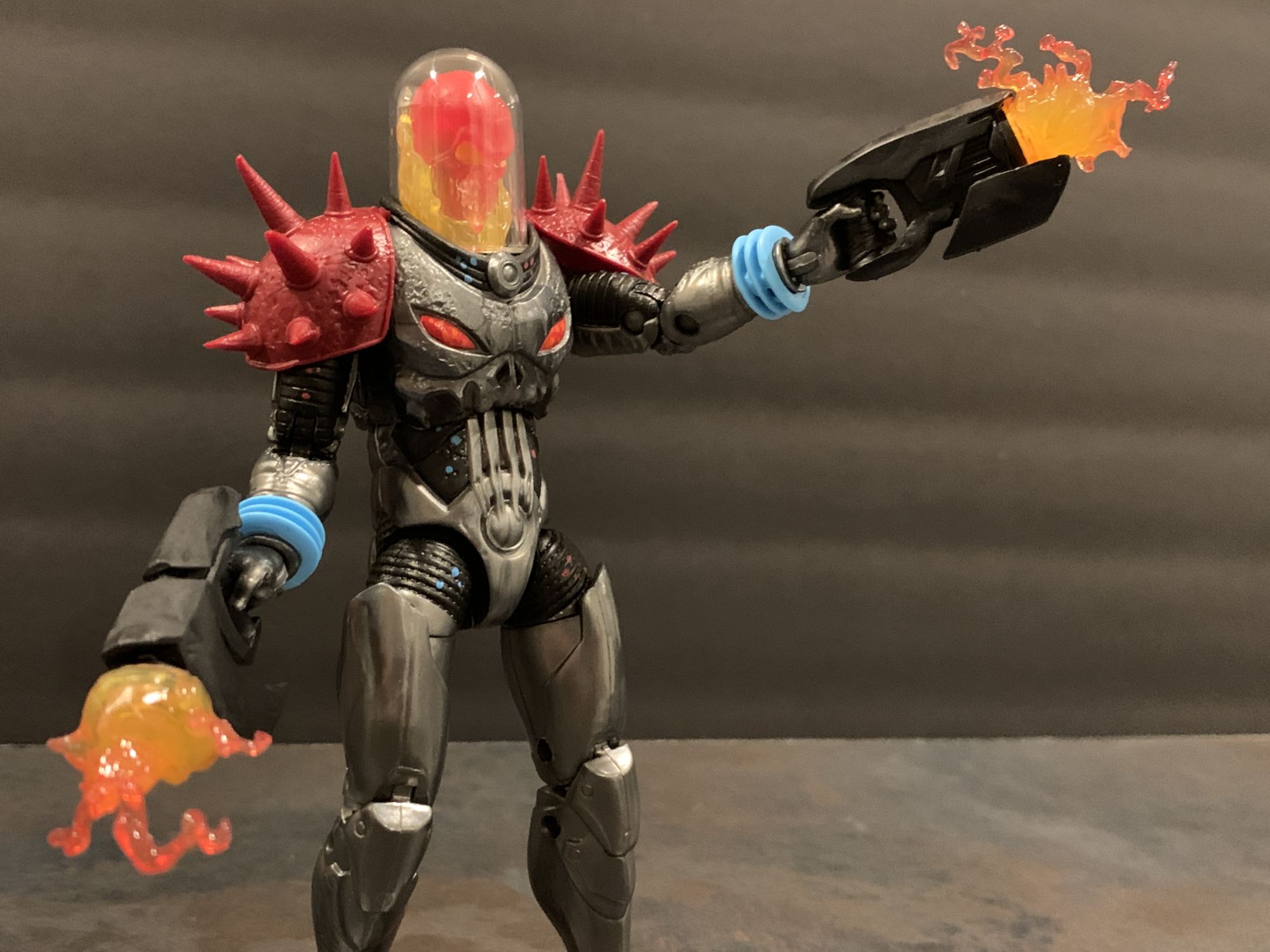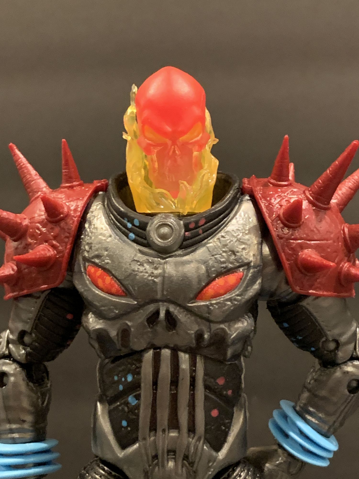 As for Cosmic Ghost Rider himself- he takes his rightful place with the recently released Doctor Doom as Marvel Legends Figure of the Year so far. This thing is flawless. He has great articulation and balance, and I absolutely love that you can remove his dome and adjust the flaming skull head. The armor looks incredible as well, and his spiked shoulder pads are not a hinderance at all while posing. That includes when he is on the bike, he easily reaches the handlebars while in the sitting position and can achieve great poses with both his blasters and chain. The chain this time is also a bit better to work with, and doesn't sag as much as it did with the original Ghost Rider Marvel Legends Deluxe figure from a while ago. He looks menacing, and is a perfect add to your shelf with or without the bike.