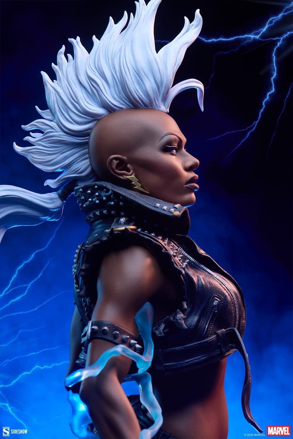 - The statue stands 25 inches tall, featuring Storm wielding lightning and donning her mohawk hairstyle.