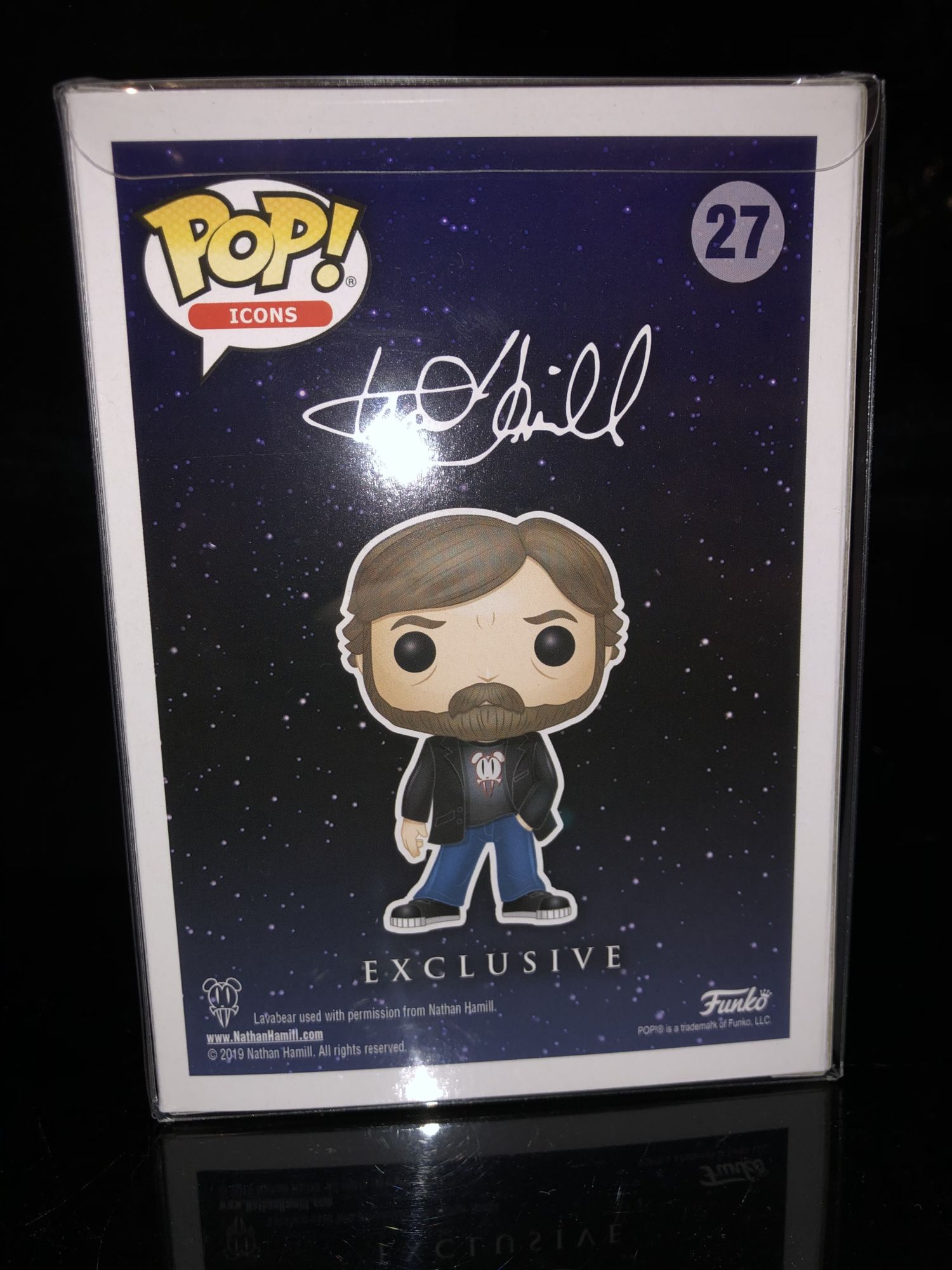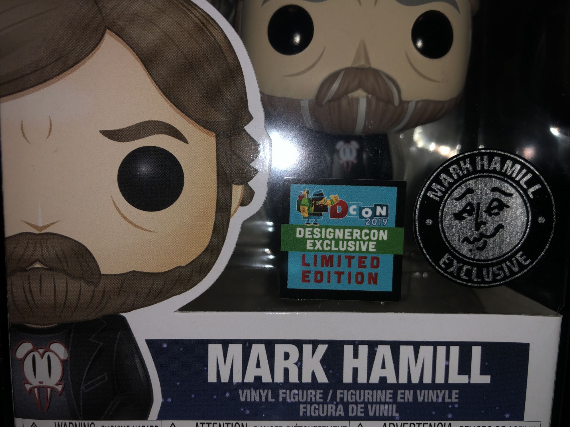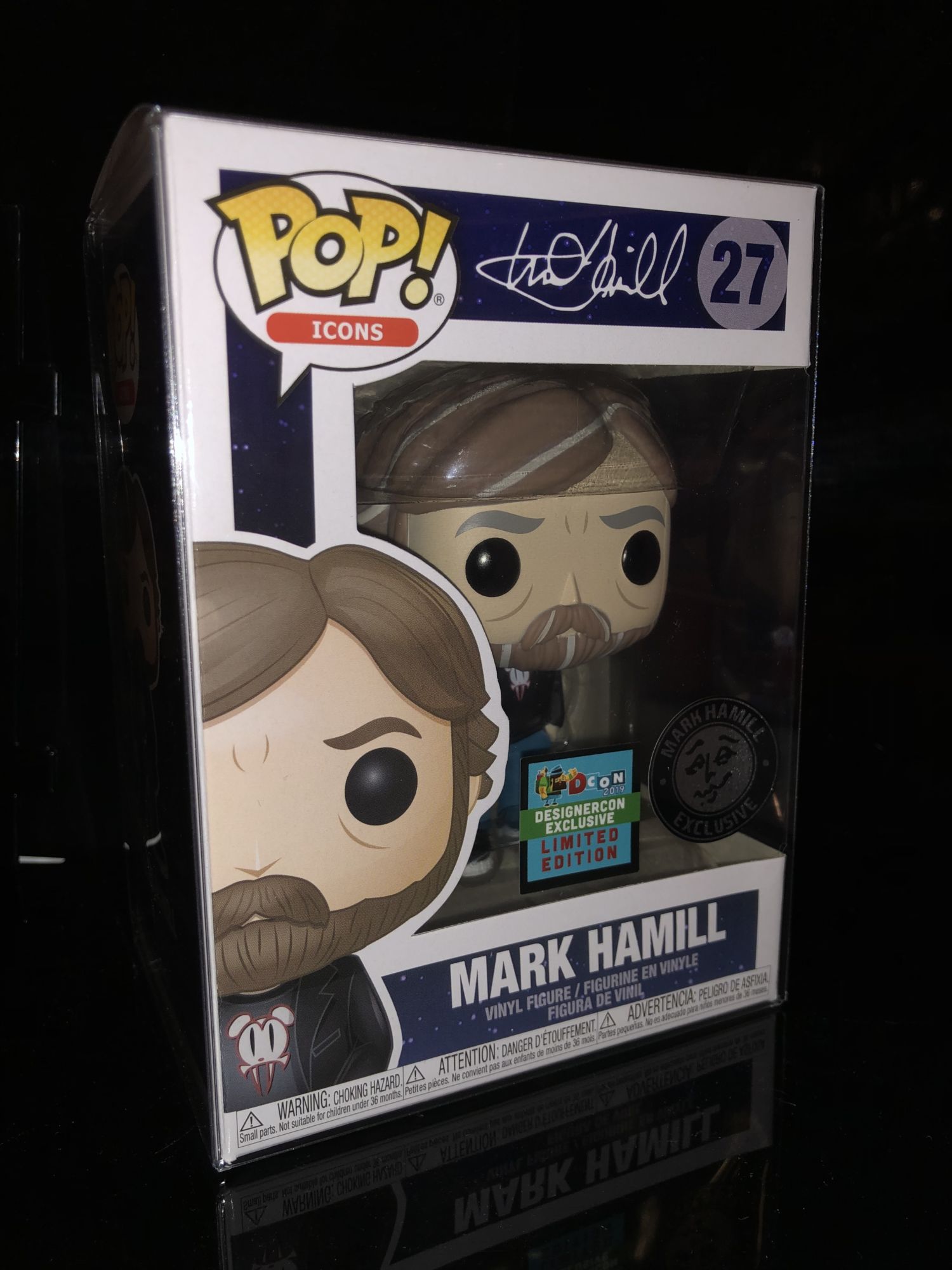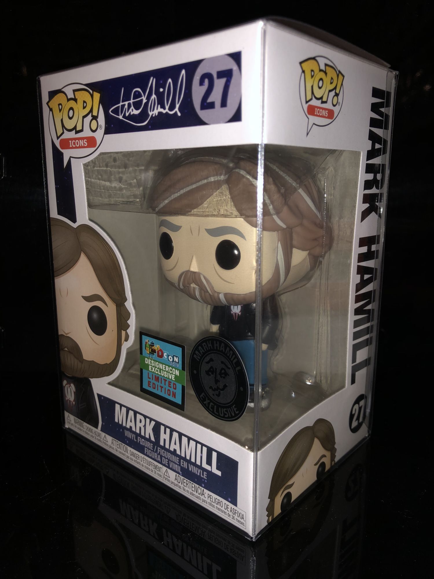 If you're a fan of the actor, voice actor or Luke Skywalker then this is a perfect collectible for you. Right off the bat if you look at the packaging it has two special stickers on the front line is Designer Con 2019 exclusive sticker and the other is a Mark Hamill exclusive company sticker. The box is pretty simple with Mark Hamill's signature on the top for the name as well as the back.
