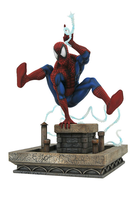 A Diamond Select Toys Release! Thwip! The spaghetti webs make a comeback in this new PVC Diorama inspired by the classic Spider-Man artwork of the 1990s! Leaping over a rooftop with his webline wrapped around him, this sculpture of Spidey stands approximately 8 inches tall and is cast in high-grade plastic with highly detailed sculpting and paint applications. Packaged in a full-color window box. Designed by Caesar, sculpted by Alterton! (Item # JUN192391, SRP: $49.99)