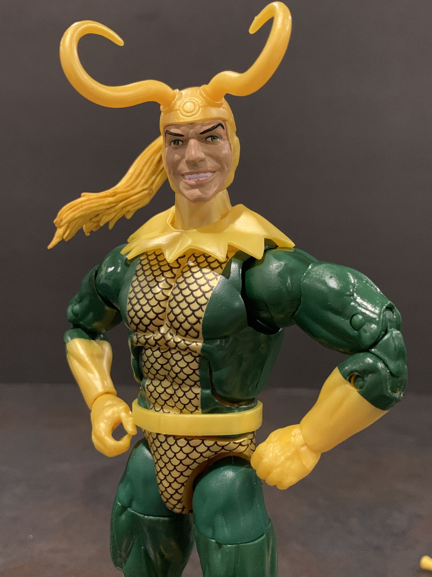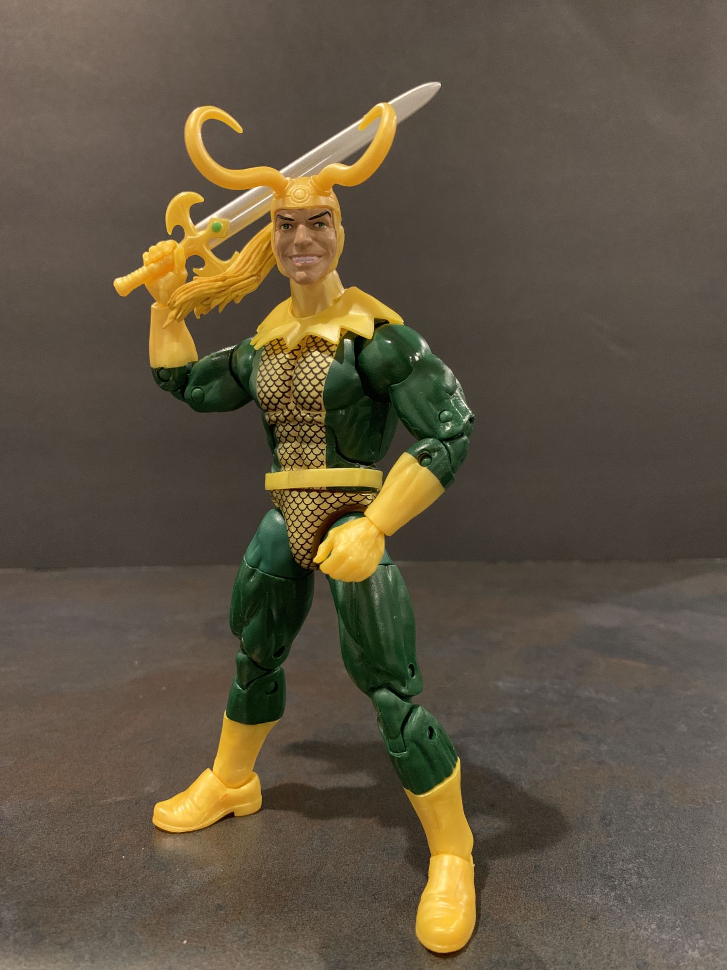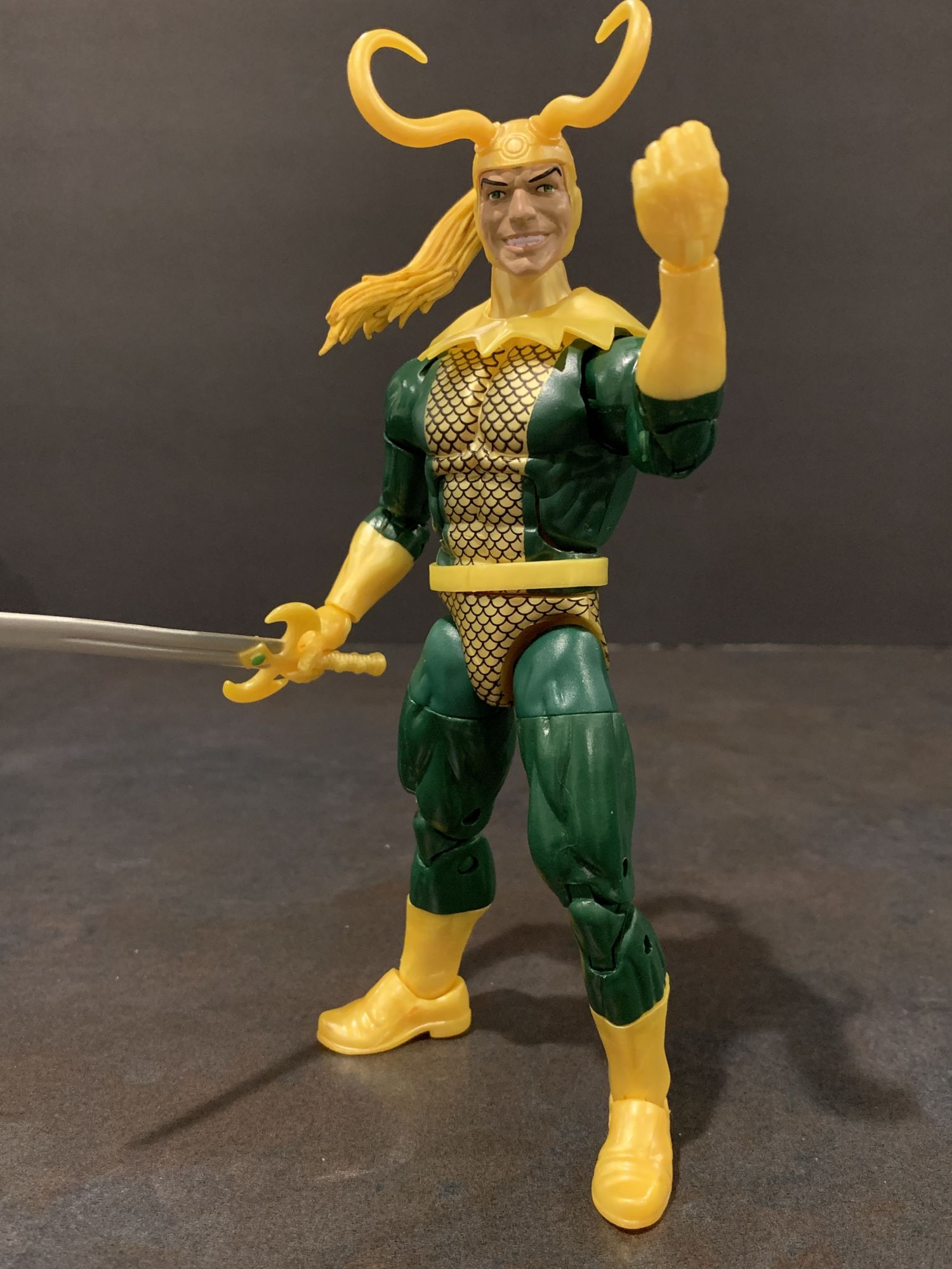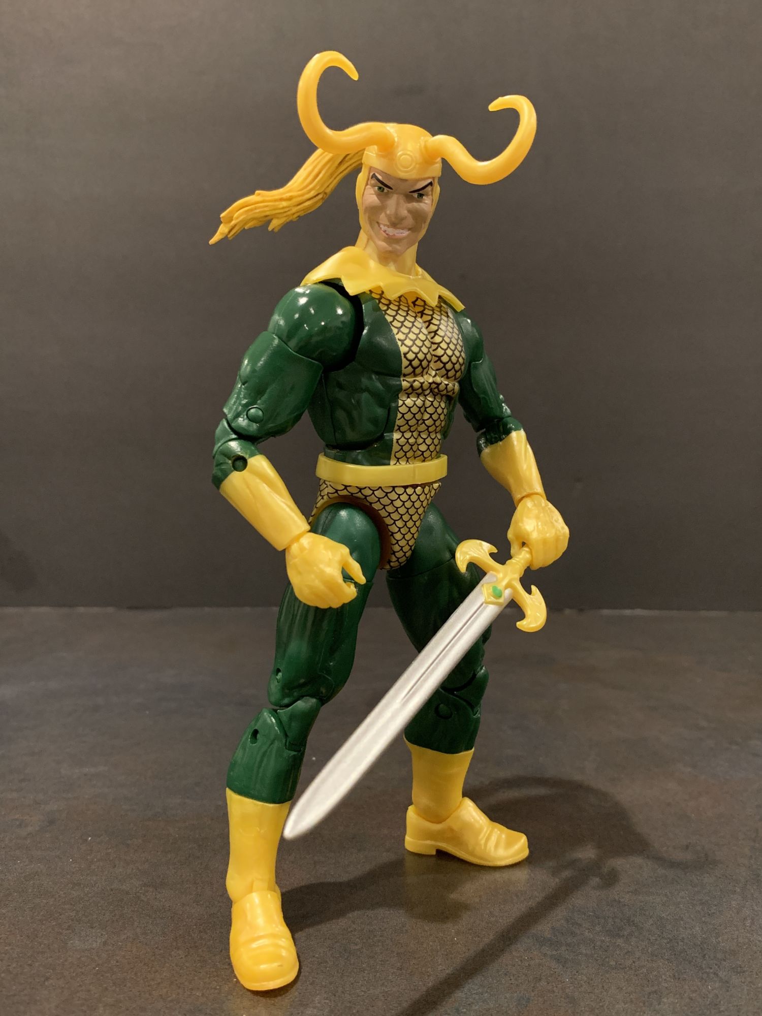 First up, two comic Marvel Legends. A new classic version of Loki that comes with crazy horns and hair and a sword. While this sculpt is great, the neckpiece drove me nuts. It refused to stay straight, and became a quick nuisance. Other than that, he is a cool figure, he holds his sword well, and the smirking face is so great. he looks sinister, and that is how I have always seen Loki.