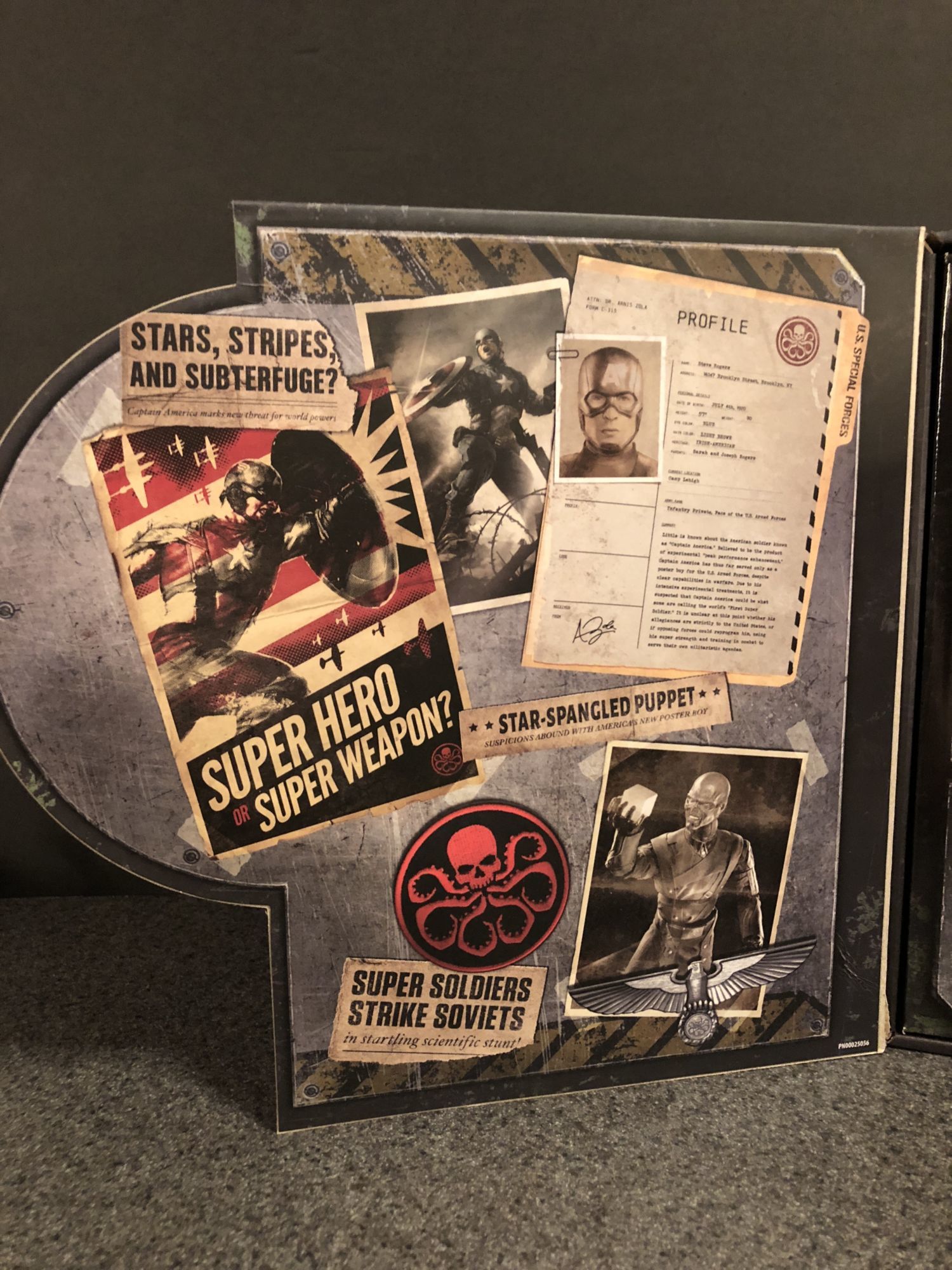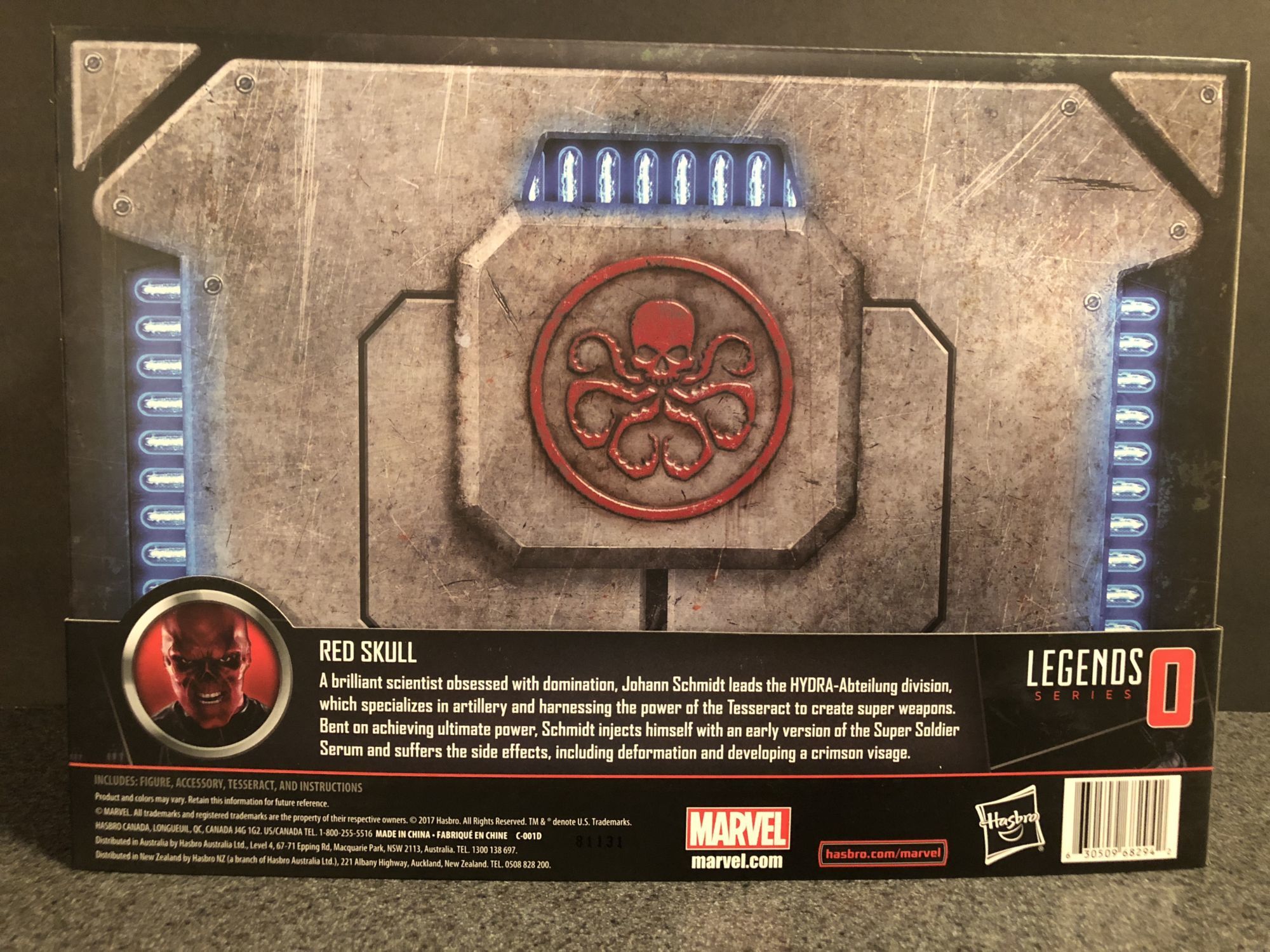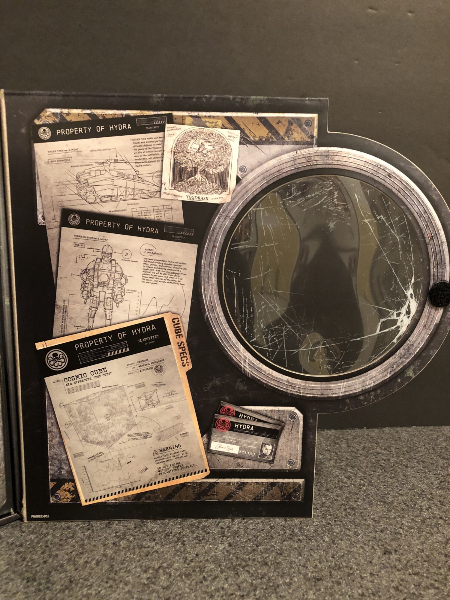 First, as with all of their Marvel Legends SDCC exclusives, the packaging is fantastic. The Tesseract carrying case is decked out in Hydra symbols and has a slipcover that goes over the outside and gives you info on the Red Skull. This set is #0 in the line, fitting for the MCU film that comes first chronologically, Captain America: The First Avenger. Once you remove the slip, the front of the box opens up to reveal the figure and Tesseract, along with box flaps that reveal secret Hydra files on Cap, the Tesseract (Alias: Cosmic Cube. Nice touch.), Hydra tanks, and Yggdrasil the world tree. It is all very well done, with lots of easter eggs to pour over.