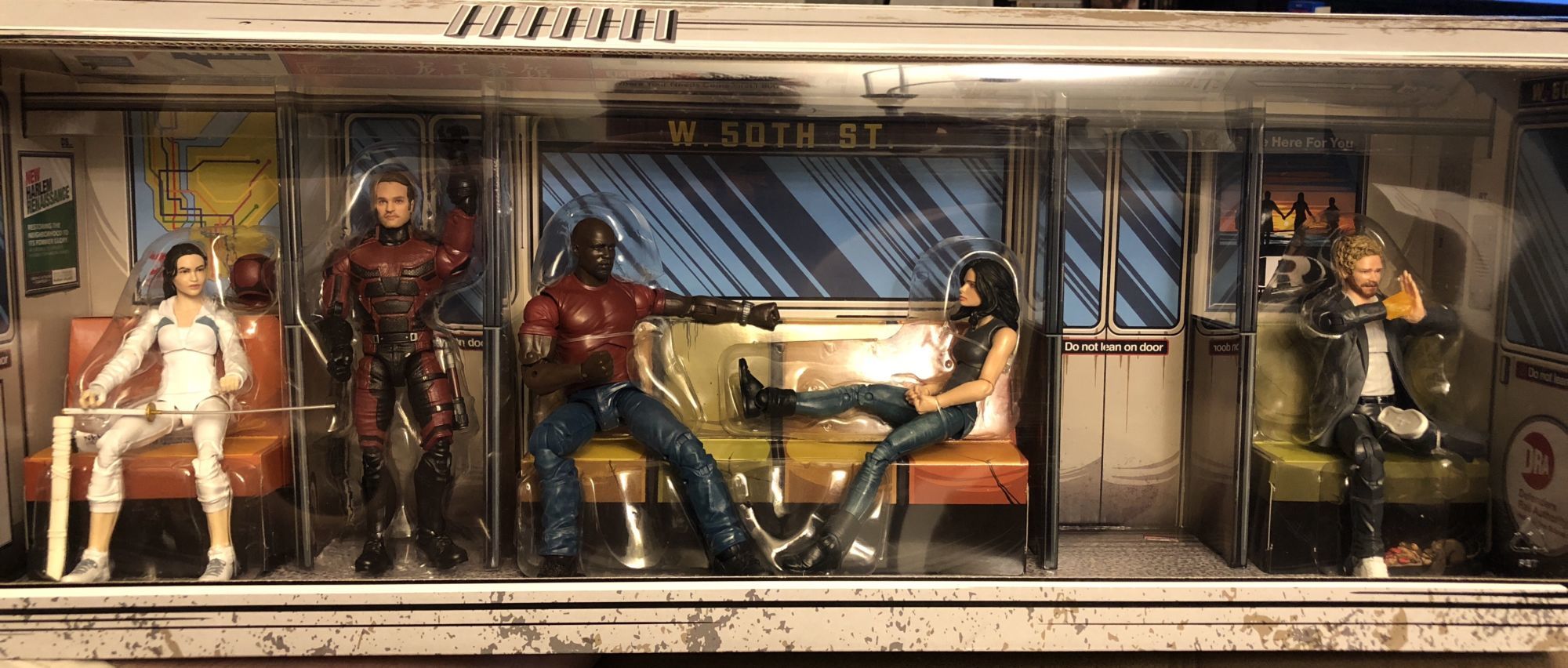 All of the little touches inside the subway car are awesome. Tons of little nods to the Netflix Universe in the MCU, including ads for the Red Dragon restaurant, Alias Investigations, Chikara Dojo, Trish Talk (I kinda wish there was a Patsy Walker figure in here, but oh well), and more. There is even debris strewn about the floor and such.