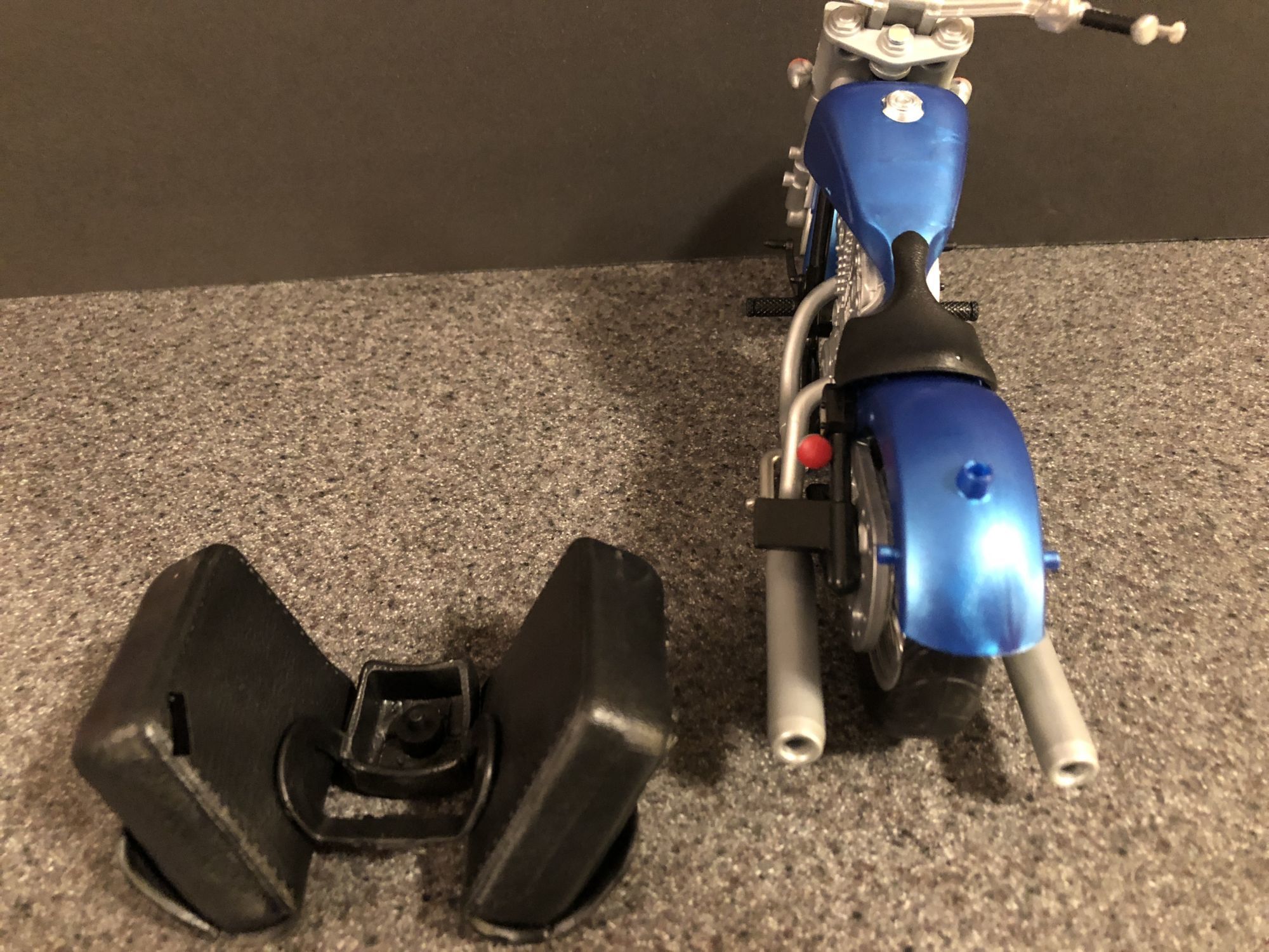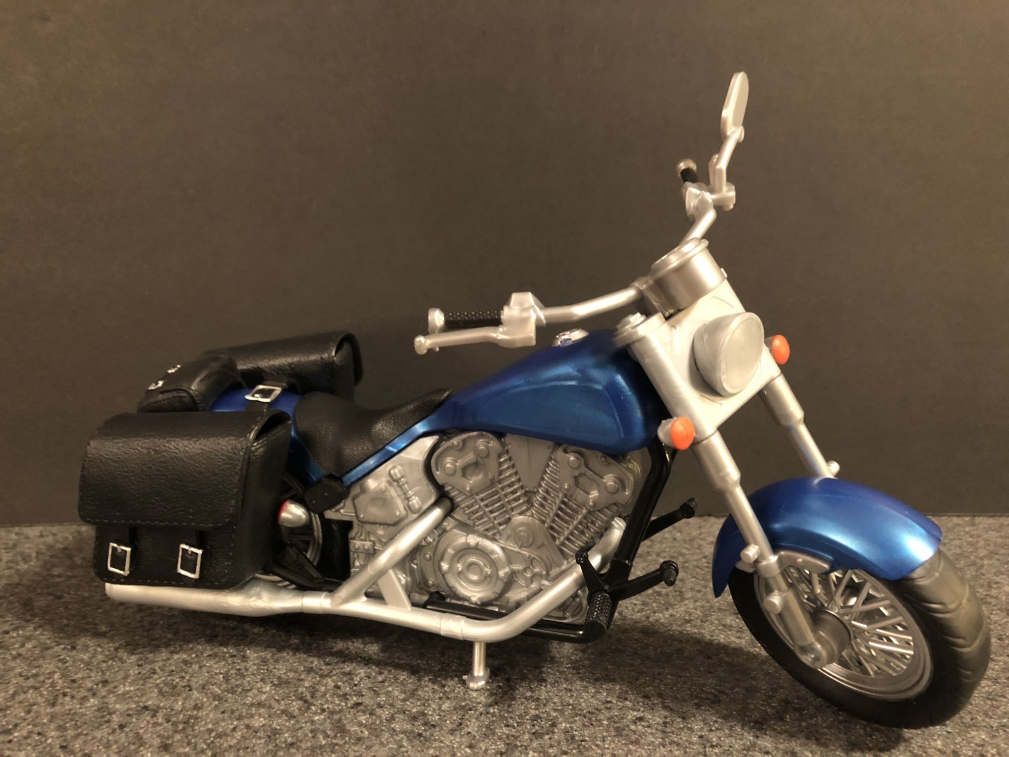 The leather cases on the back are only connected by one loose peg on the back, and getting it to stay on is almost impossible. They don't open either, even though they are hollow and look like they should. The bike even looks cheap — especially the front. Couldn't they have at least painted the front side of the mirrors? The only way this looks good in my eyes is posing Logan next to the bike. Really disappointing.