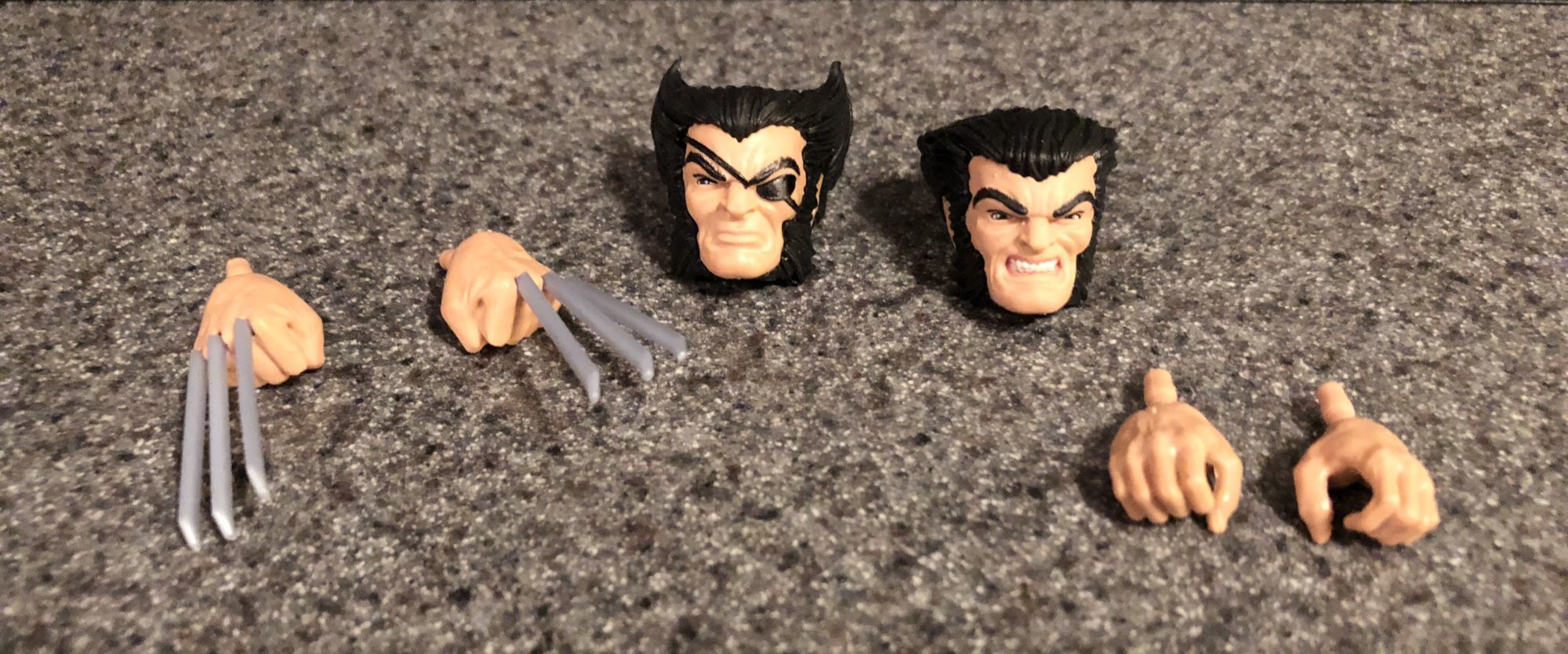 Since I am a loose collector, I open my figures. This is where the problems begin with this one. Starting with Logan himself, let's get the good out of the way. The Patch head is perfect. From the scowl to the pointy hair poof, this is for sure the better of the two included head sculpts. The modern one looks too scrunched, almost more like Popeye — not a fan of that modern head. The included hands without the claws are okay, but the claw hands are way better. if yours comes out with bent claws, have no fear. These are way more malleable than previous releases. Wolverine is also in scale; the little runt is the perfect height.