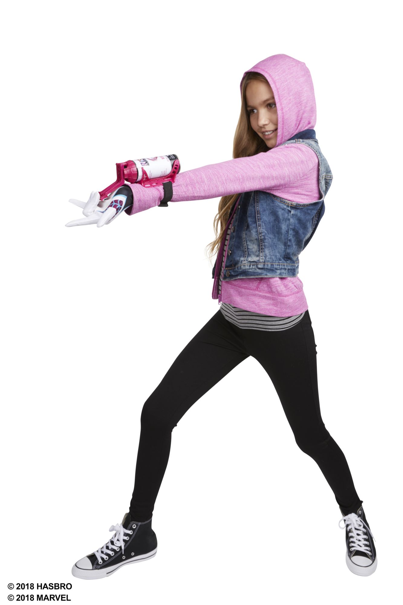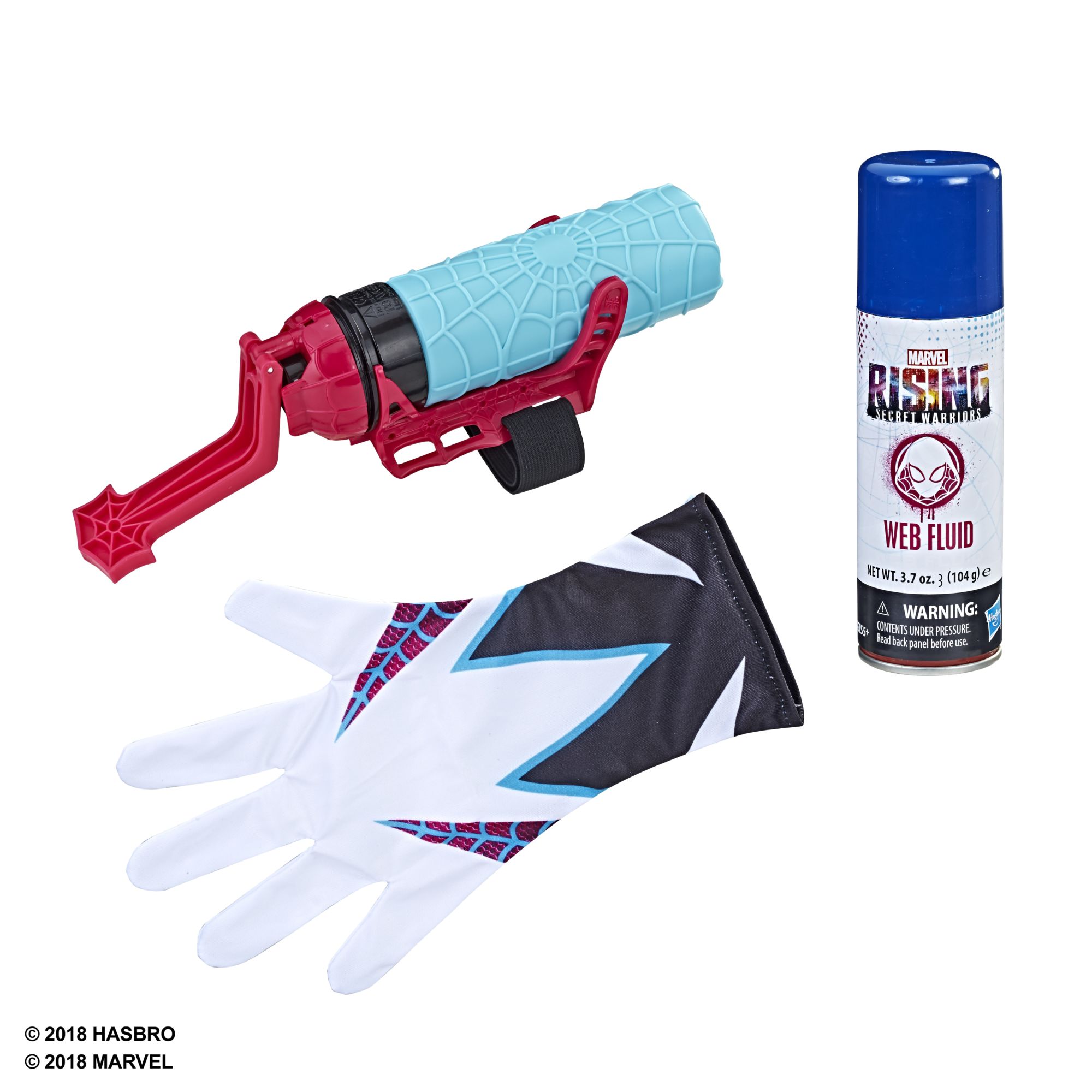 Imagine slinging webs like GHOST-SPIDER with this awesome WEB SLINGER! Includes fabric glove featuring Ghost-Spider design, gauntlet, 3.7 ounce can of web fluid, and water canister. Compatible with standard SPIDER-MAN web fluid refill cans, sold separately.