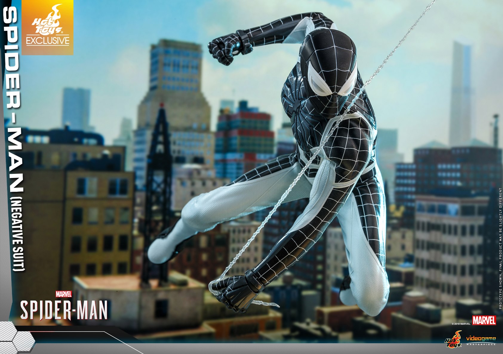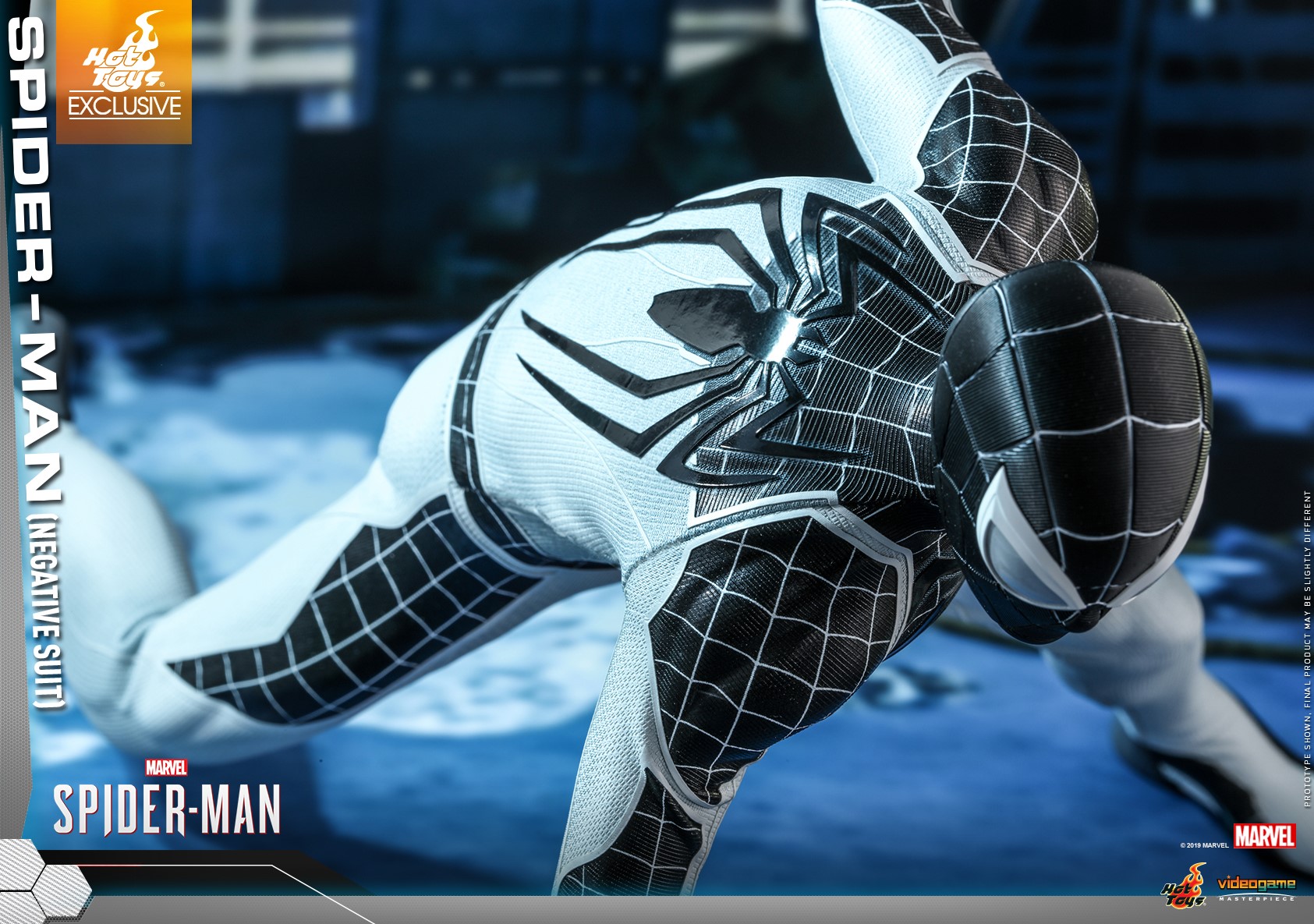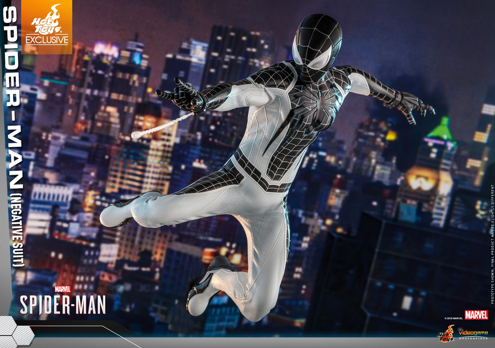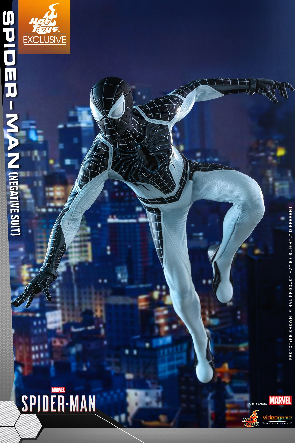The figure is carefully crafted based on the Negative Suit in the Marvel's Spider-Man video game, featuring a newly developed masked head sculpt with three pairs of interchangeable eye pieces; a specialized body with terrific range of movement; a monochromatic Spidey suit with a negative version of the games iconic white spider emblem, now black, on chest; matching interchangeable hands for different signature postures; Web-Shooters; a Spider-Drone; trip mines; web bombs; Vulture Jammer; a variety of web accessories; and a stylishly designed dynamic figure stand.
