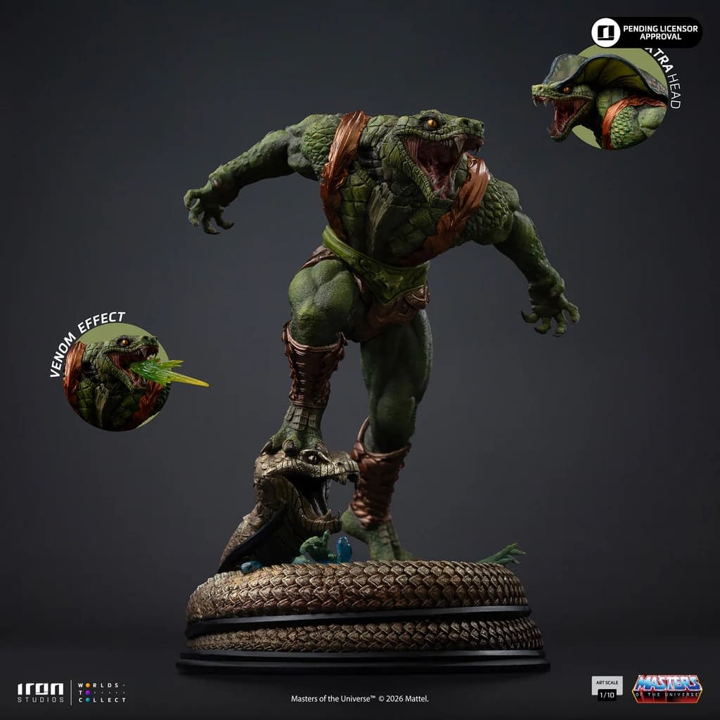 Coming in at 8" tall, this villain is ready to sssstrike with an impressive, realistic sculpt that is packed with hand-painted detail and texturing. Iron Studios' Masters of the Universe line beautifully captures a more realistic take on these heroes and villains, with him getting some wicked details. Iron Studios has included some swappable parts with an extra Cobra-themed head and an attachable venom effect. Pre-orders for the new Kobra Khan Masters of the Universe 1/10 statue are already live on the Iron Online Store for $249.99 with a Q4 2026 release.