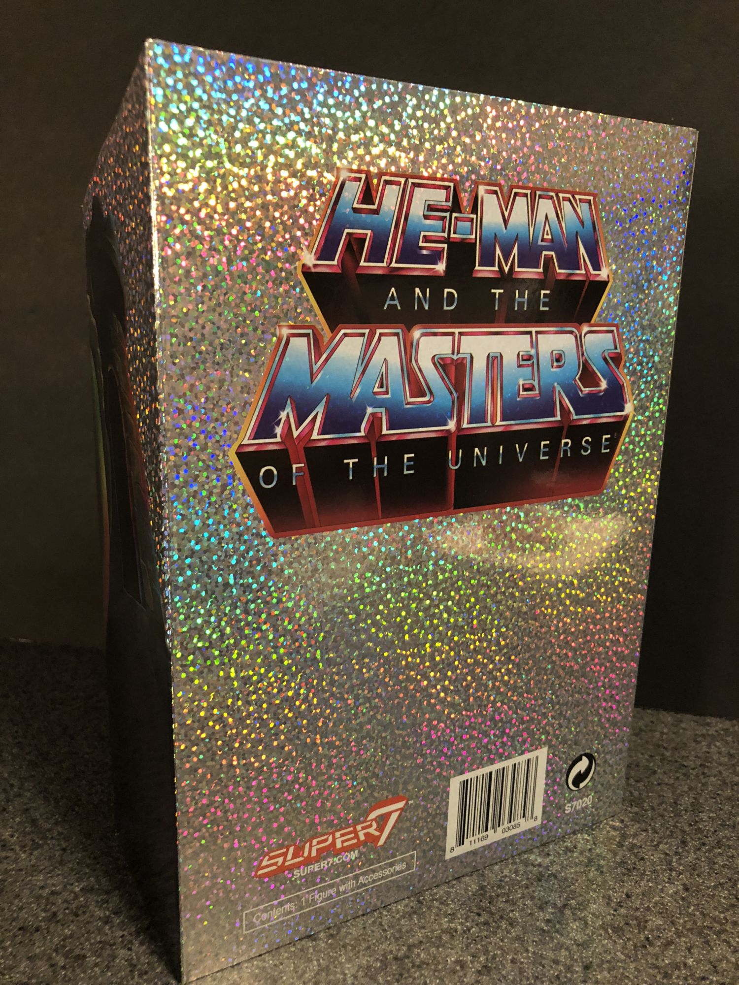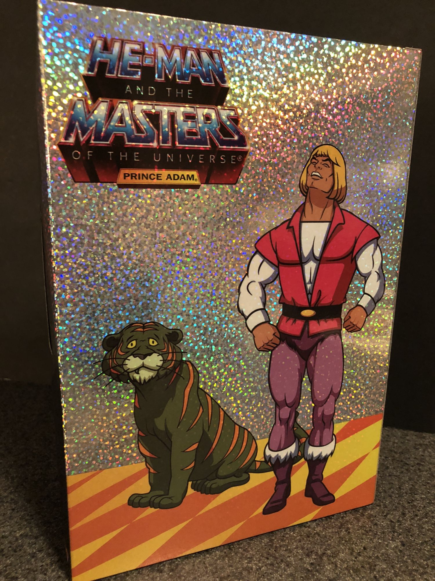 Let's start with the packaging. Prince Adam comes with the standard Super7 MOTU packaging, but with a twist. Featuring glitter galore and all the shine this figure deserves, the window box in the front shows off the Prince in all his glory. The back features Adam with his trusty companion Mr. Cringer Pants. I bought two of these. One to open, and one to keep in this glorious packaging for all-times.