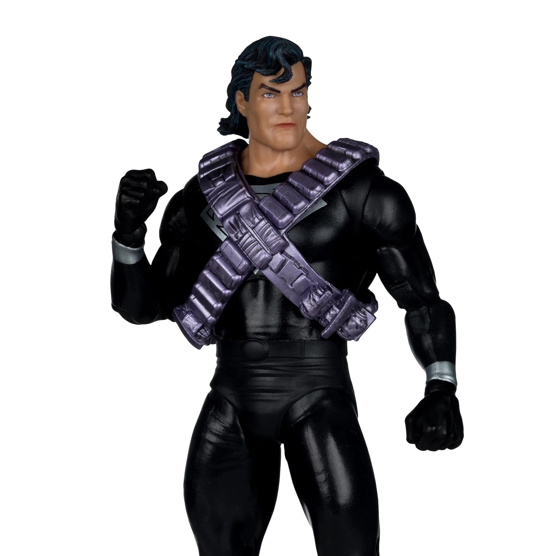 - Superman is featured in his black suit with mullet and bandolier, complete with swappable hands and blasters.