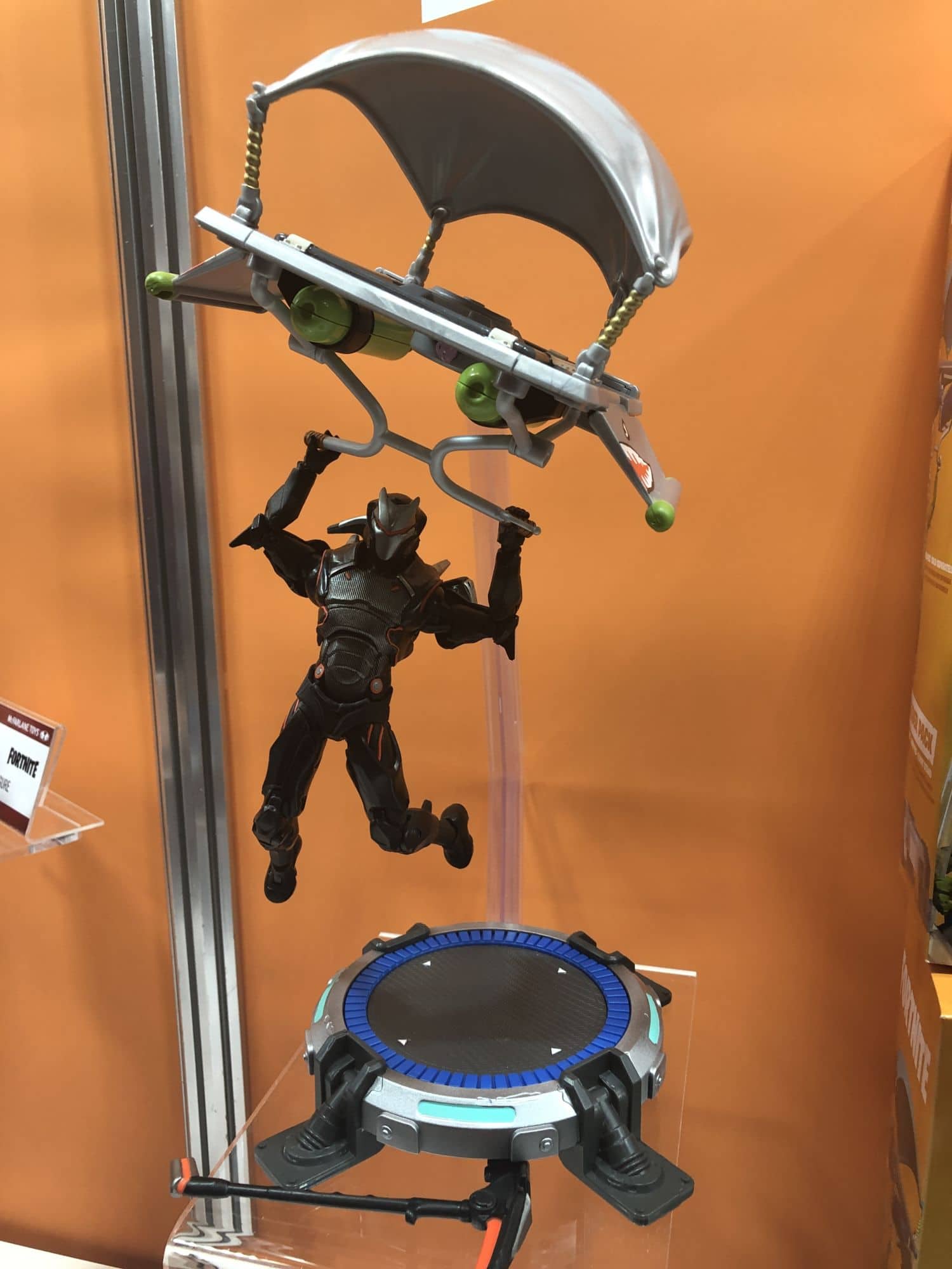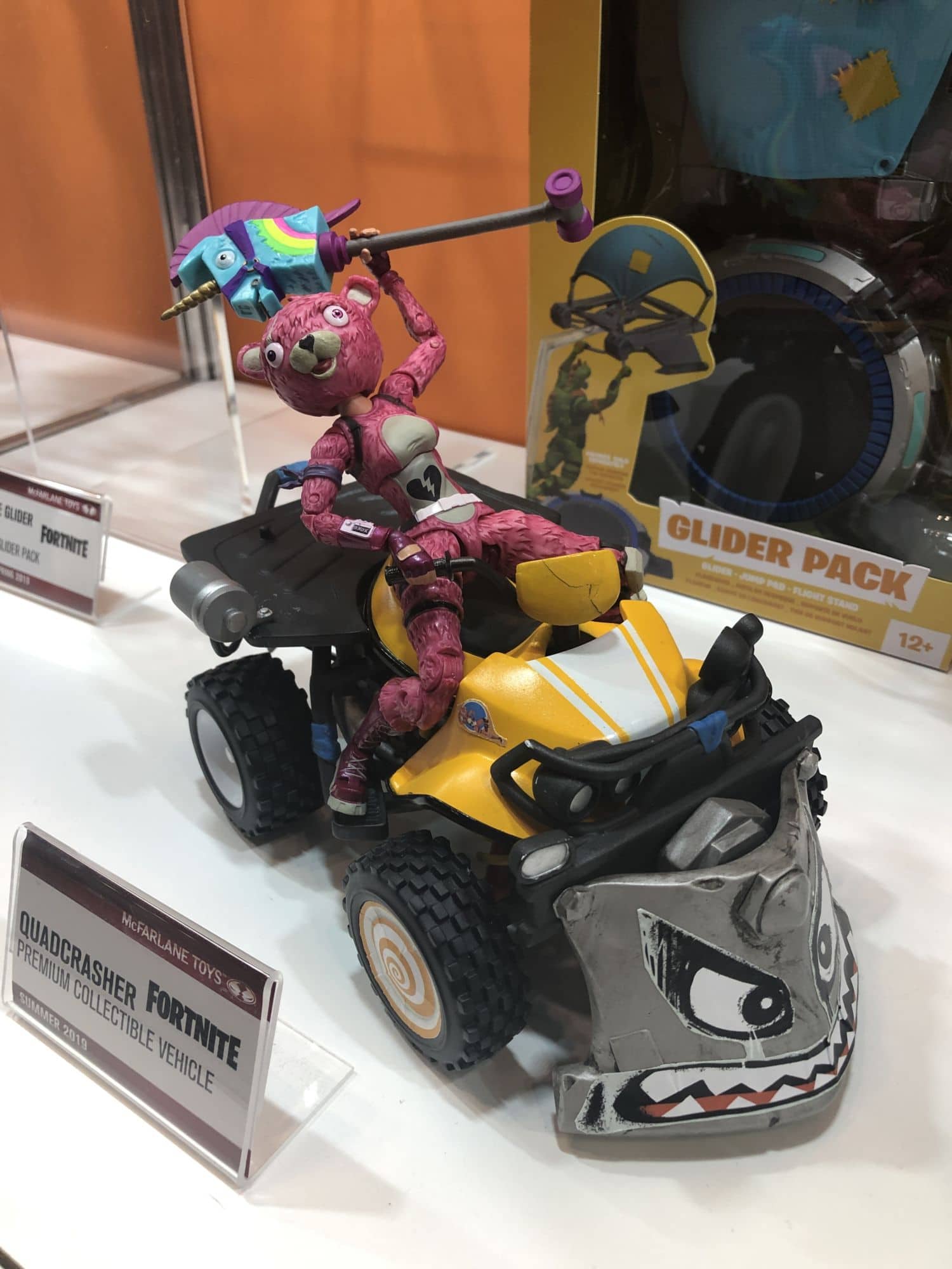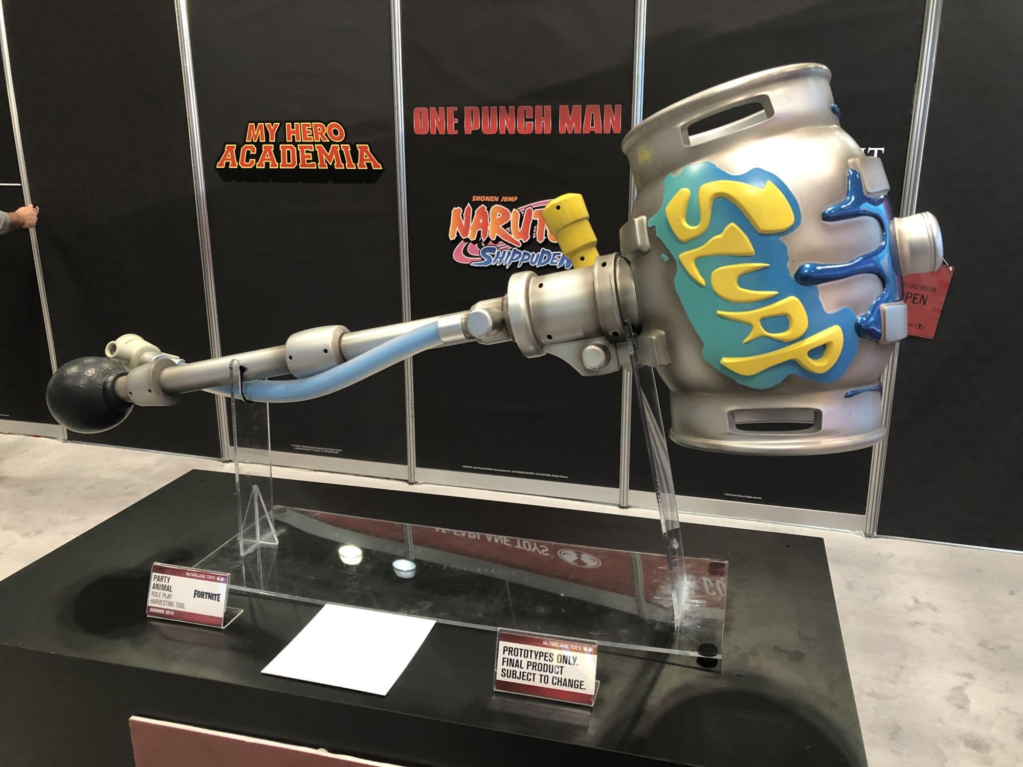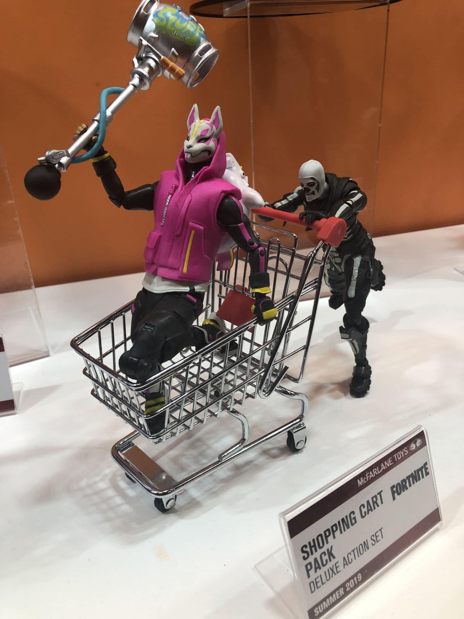 Of course, the biggest displays were saved for Fortnite. They have many, many new figures on the way, and they like to stay up to date and such by releasing figures at the same time the game has new seasons debut. Also coming to the line are vehicles, like the awesome glider pack! Or the quadcrasher! Or the shopping cart? Yep, a shopping cart! They also had the first two bigger scale figures on display, along with a new giant role play item: a slurp hammer.