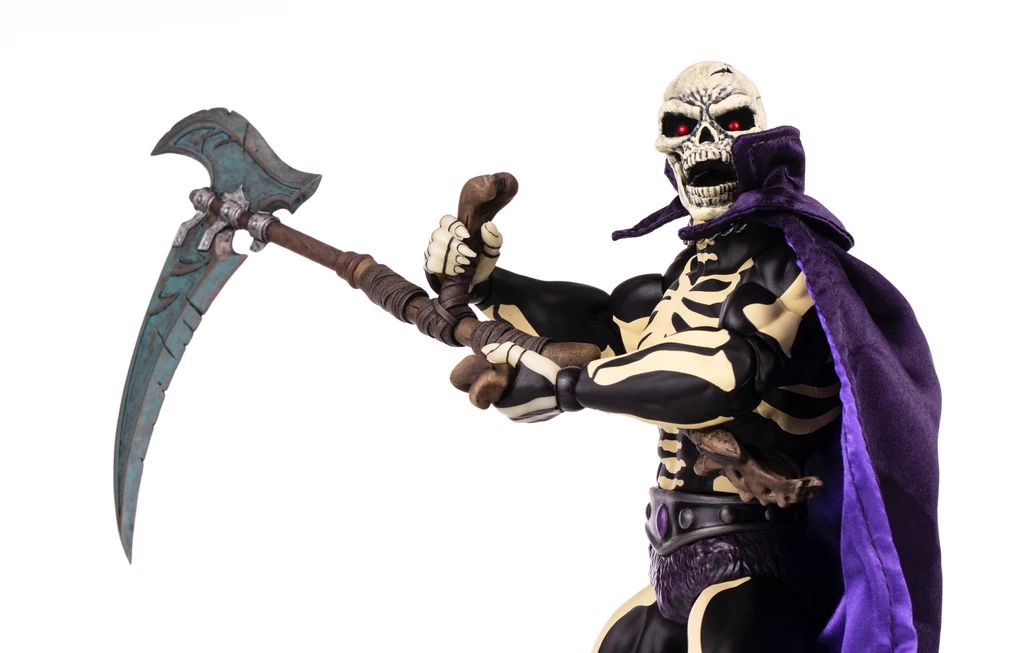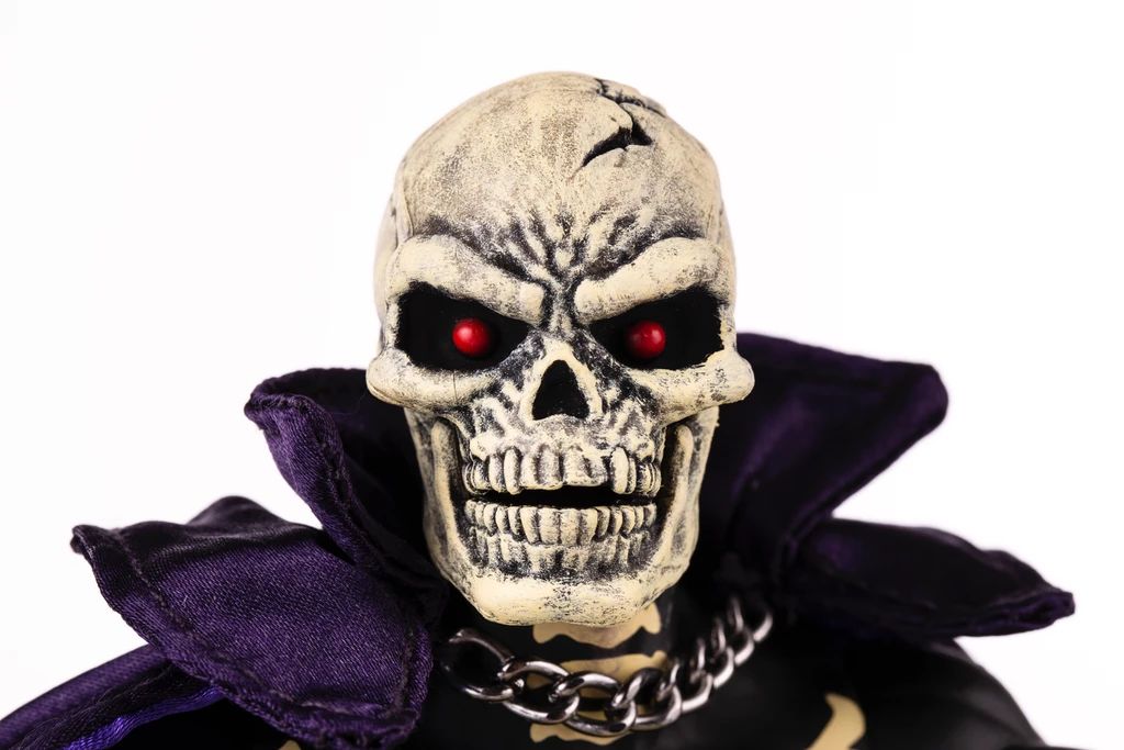 Cursed in life, frightening in death, and glowing in the darkness! Mondo is proud to bring you the next in our Masters of the Universe 1/6 scale figure line- Scareglow! Featuring over 30 points of articulation, removable/poseable fabric cape, GLOW IN THE DARK skeleton, Scythe of Doom, and more, Scareglow is the most terrifying figure this side of the 5 dimensions!