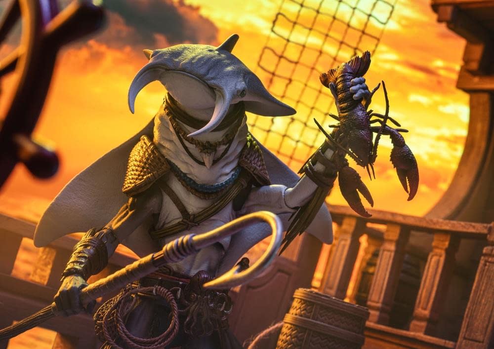 This Mythic Legions figure is revered by his crewmates for an almost mystical affinity with the sea and its bounty. He has sailed the waters of Mythoss longer than anyone can remember, and now he sets sail into your collection. This humanoid Manta Ray comes in at 6" tall with a sweet sculpt as well as two swappable heads and a variety of hands. Other accessories will consist of a rope, a pouch, a water container, a fisherman's hook staff, a satchel, and a selection of fish. Mobu is a necessary member of any Mythic Legions: Dawns of Discovery team, and pre-orders are already live for $54.99 with a Q3 2026 release date.