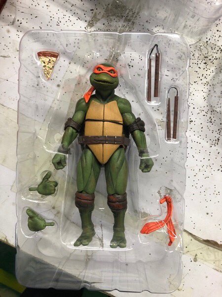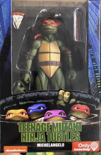 One of the best figure sets ever made period, the NECA 1990 TMNT movie figure set from SDCC this past summer was a HUGE hit for them, and they are doing collectors a solid by releasing the Turtles individually exclusively at Gamestop in 2019. They won't come with every accessory the SDCC one did, but still: as someone who waited in line and got one of these sets, you NEED to own these. They are hands down four of the best action figures ever made. Here we see Mikey in his packaging and what he will look like in the figure tray when they are released.