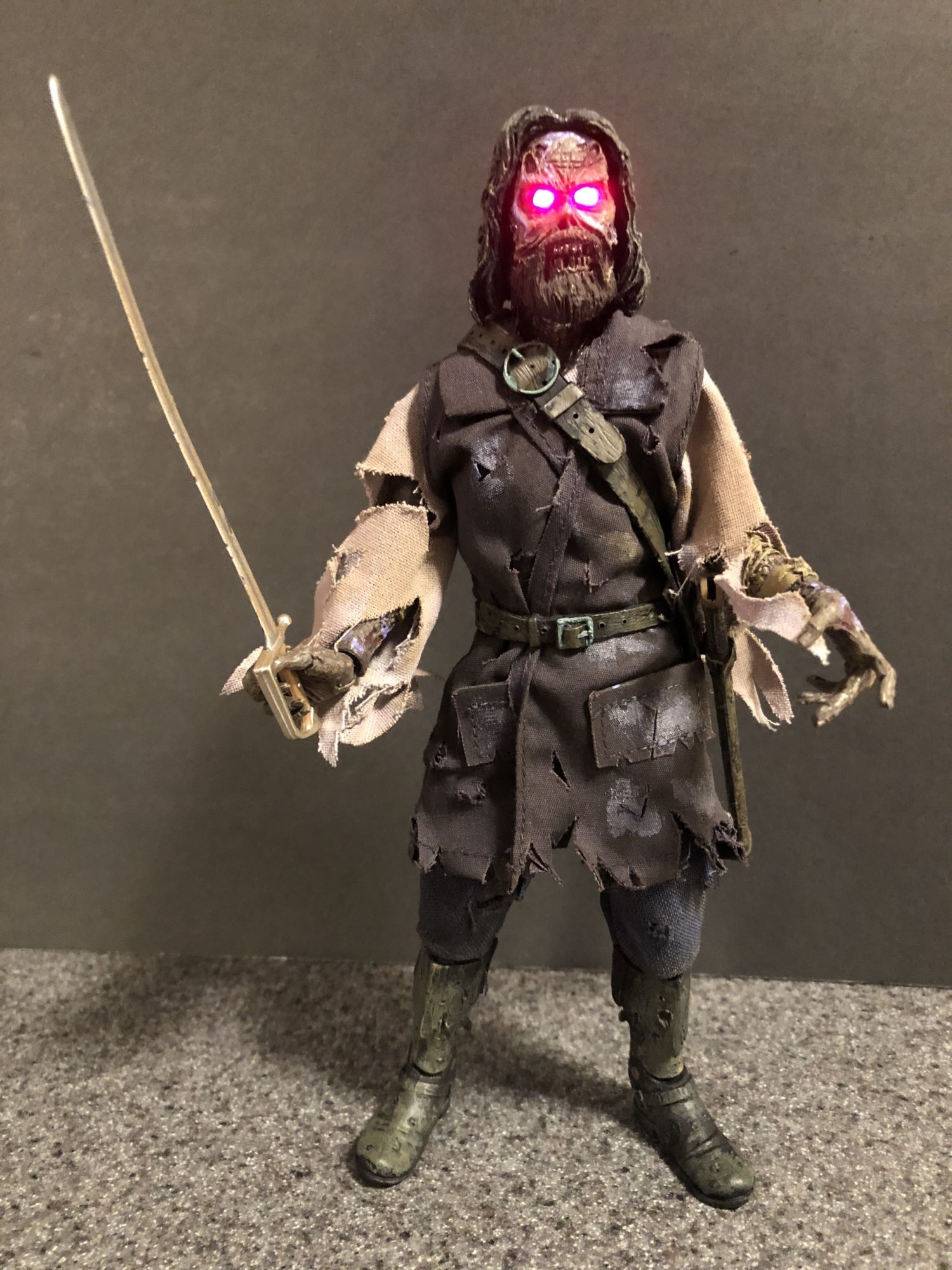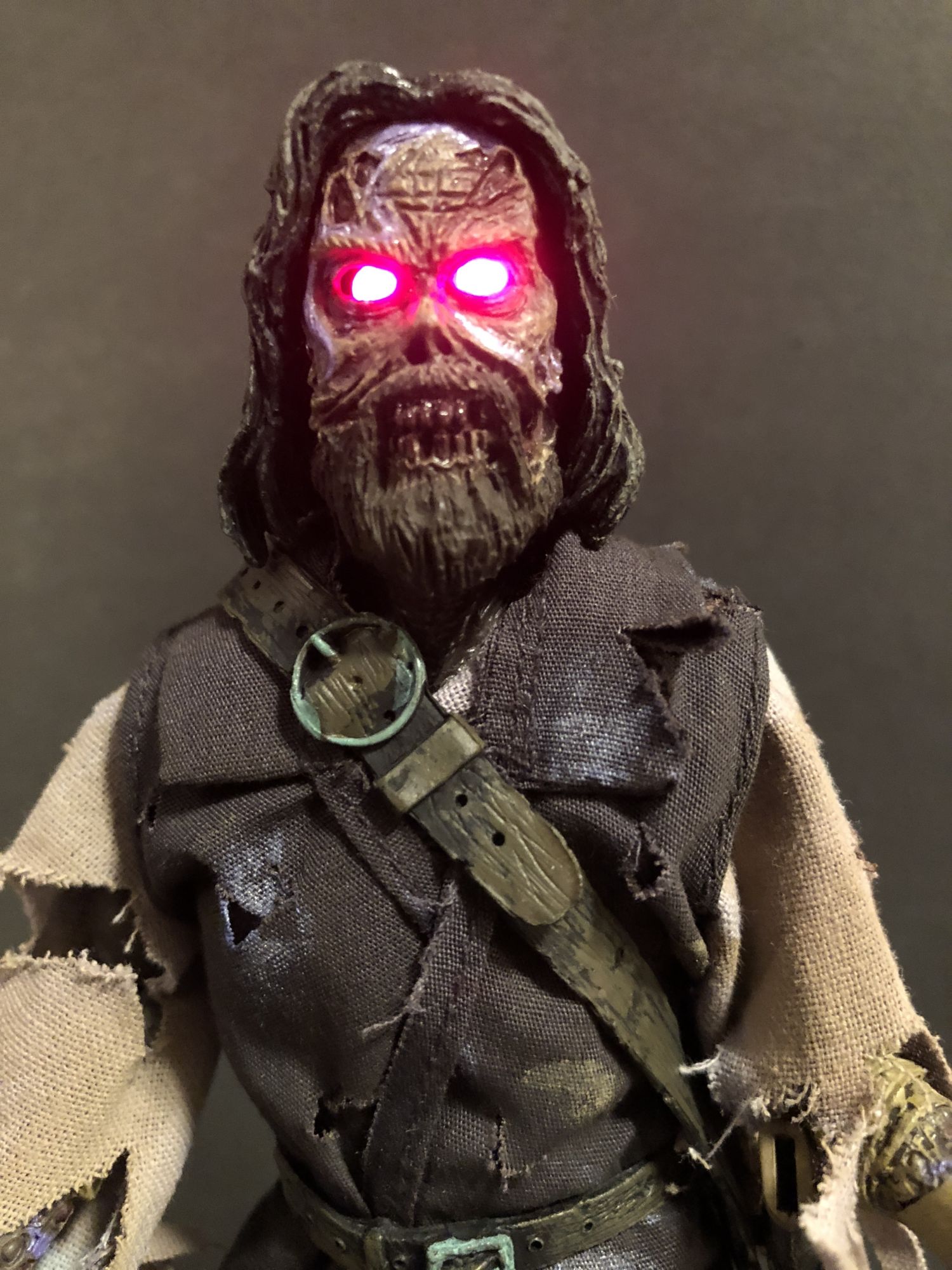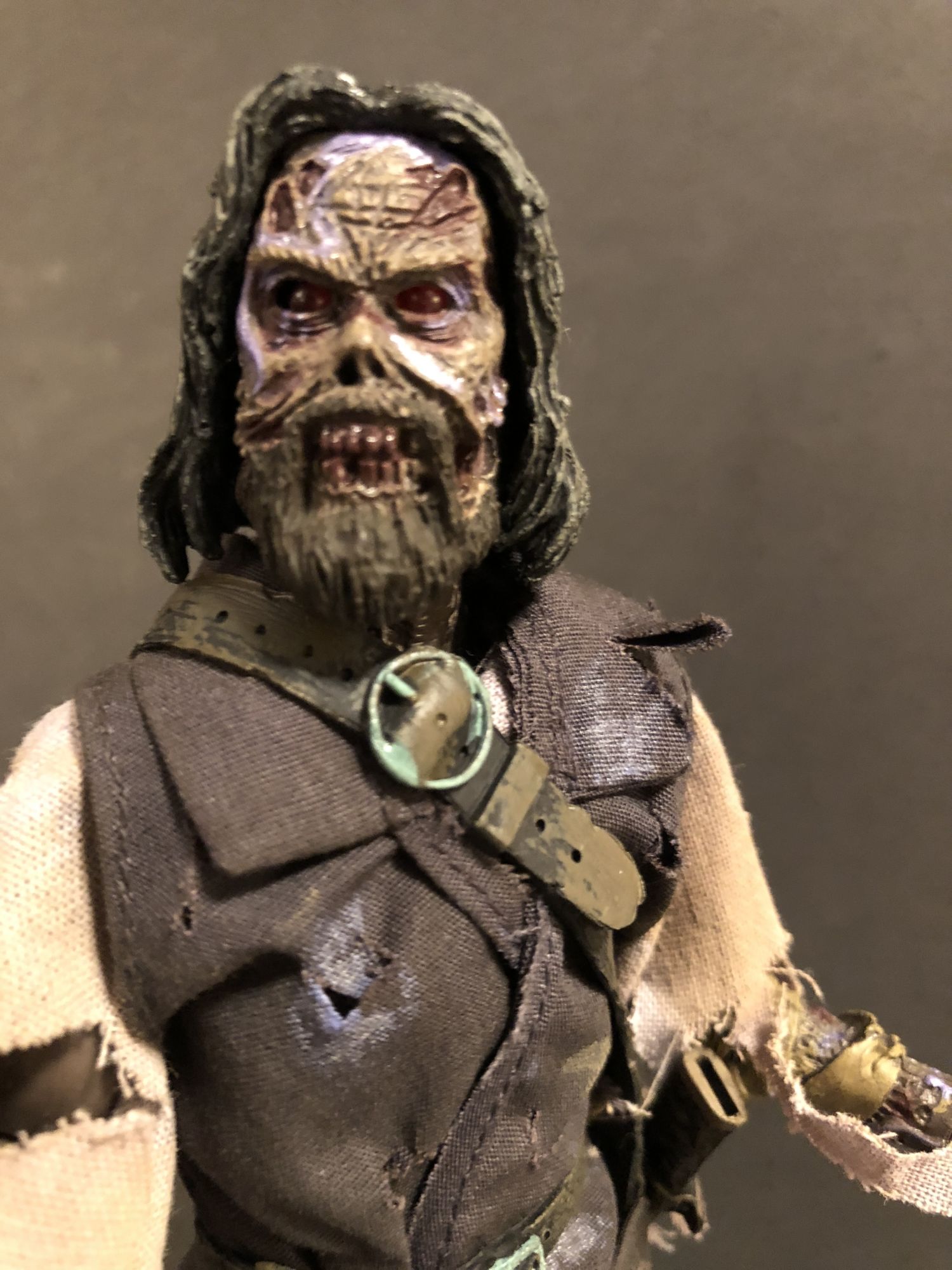 The fabric outfit and sculpt are both top notch. Even with the eyes off, Blake's sunken eye sockets and toothy snarl are a joy to look at. The tattered clothing and buckles everywhere are fun to pour over, i notice something new every time I look the figure over. This looks like he walked right out of The Fog and onto my shelf. I will say that the sheath is a little harder to attach than I would like, and the sword could be made of harder material, but that is nitpicking.