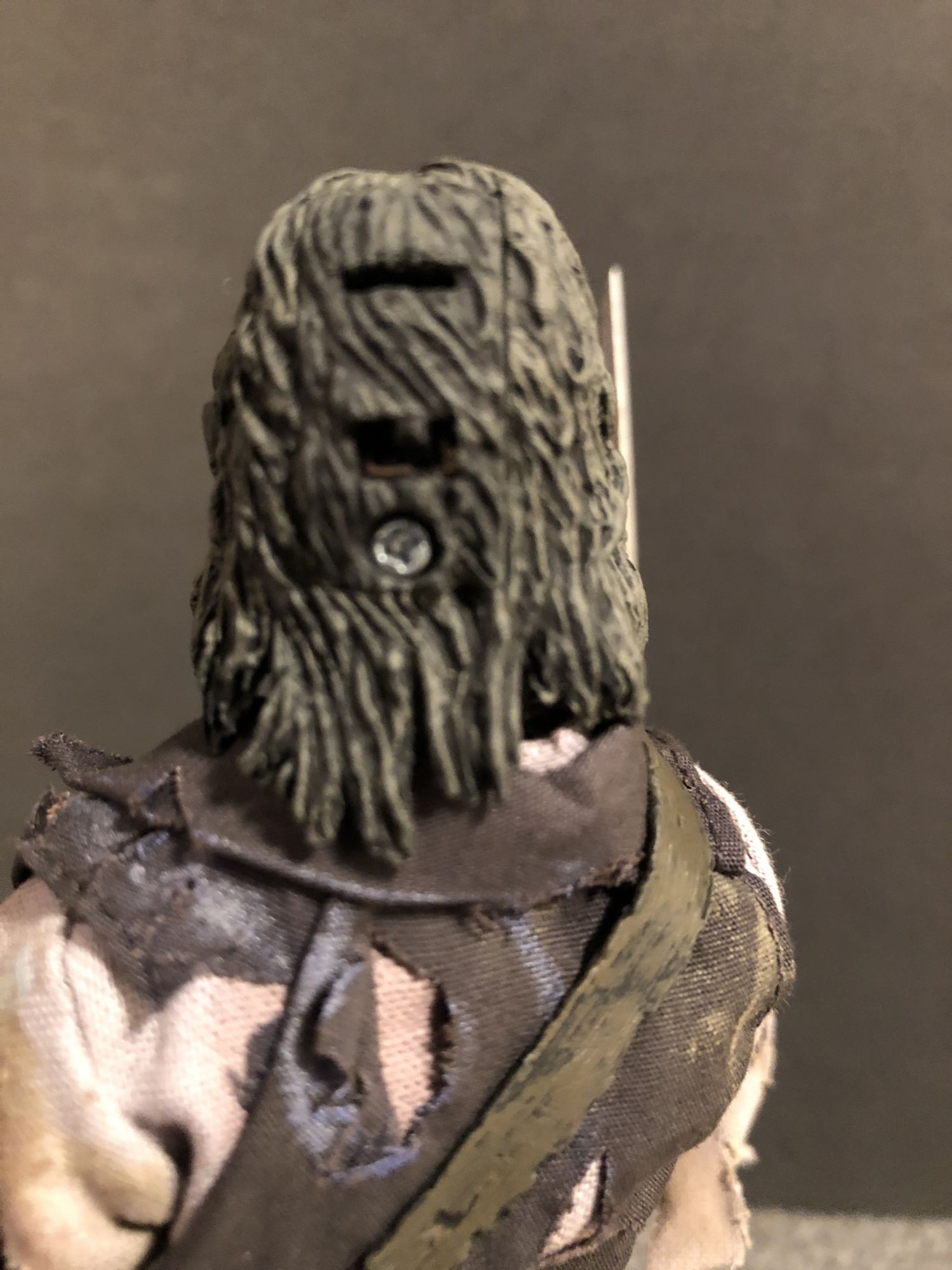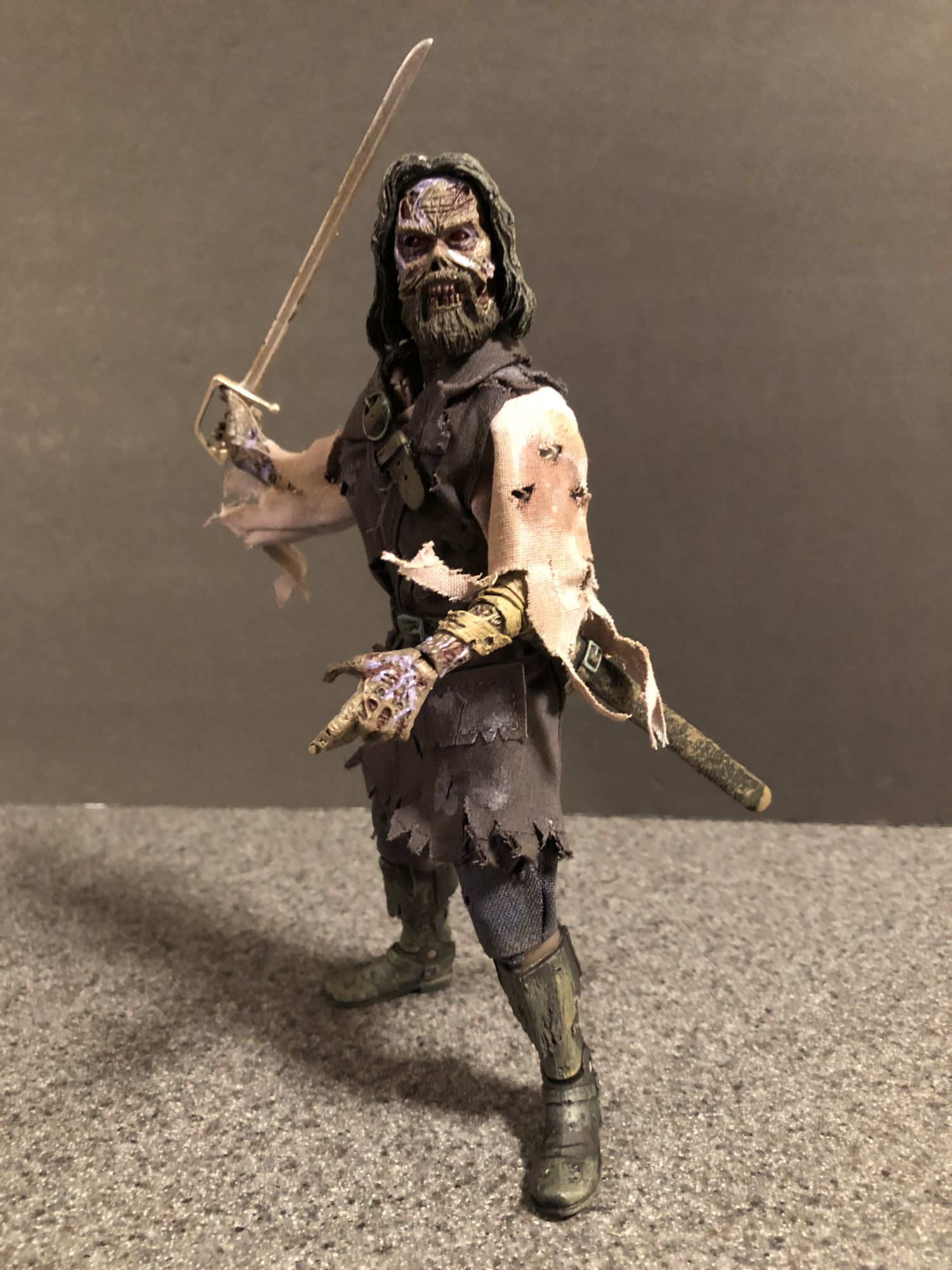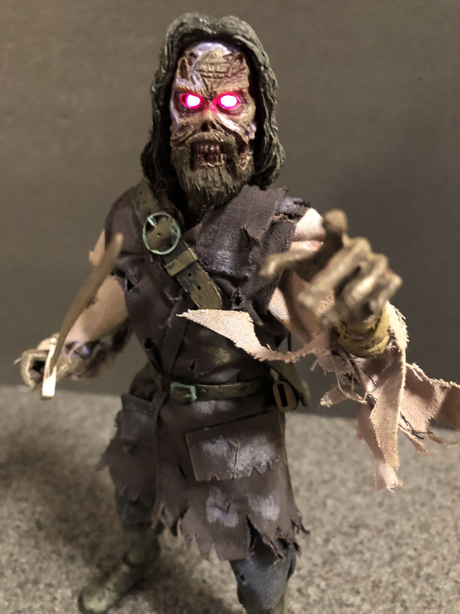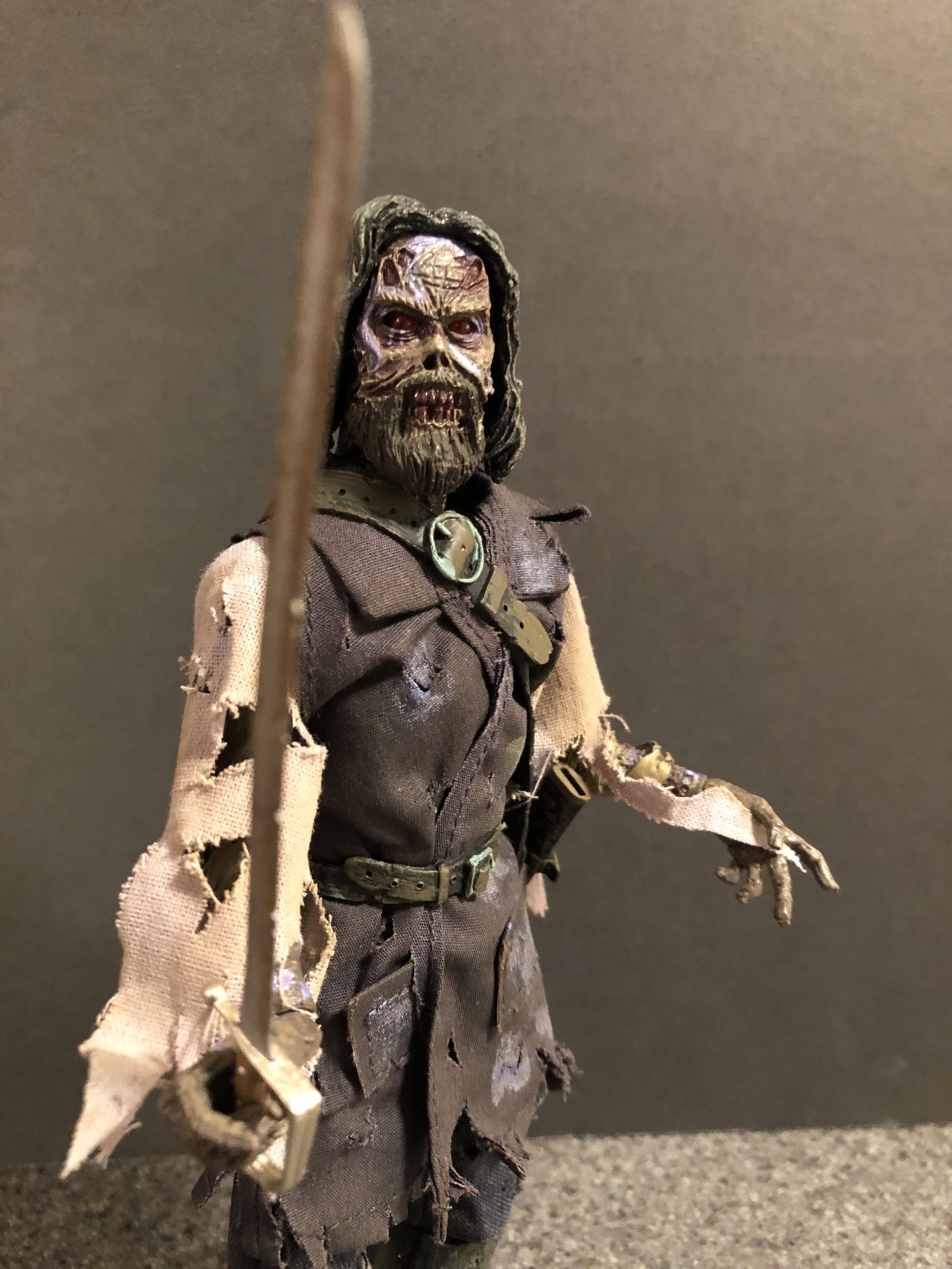 The fabric outfit and sculpt are both top notch. Even with the eyes off, Blake's sunken eye sockets and toothy snarl are a joy to look at. The tattered clothing and buckles everywhere are fun to pour over, i notice something new every time I look the figure over. This looks like he walked right out of The Fog and onto my shelf. I will say that the sheath is a little harder to attach than I would like, and the sword could be made of harder material, but that is nitpicking.