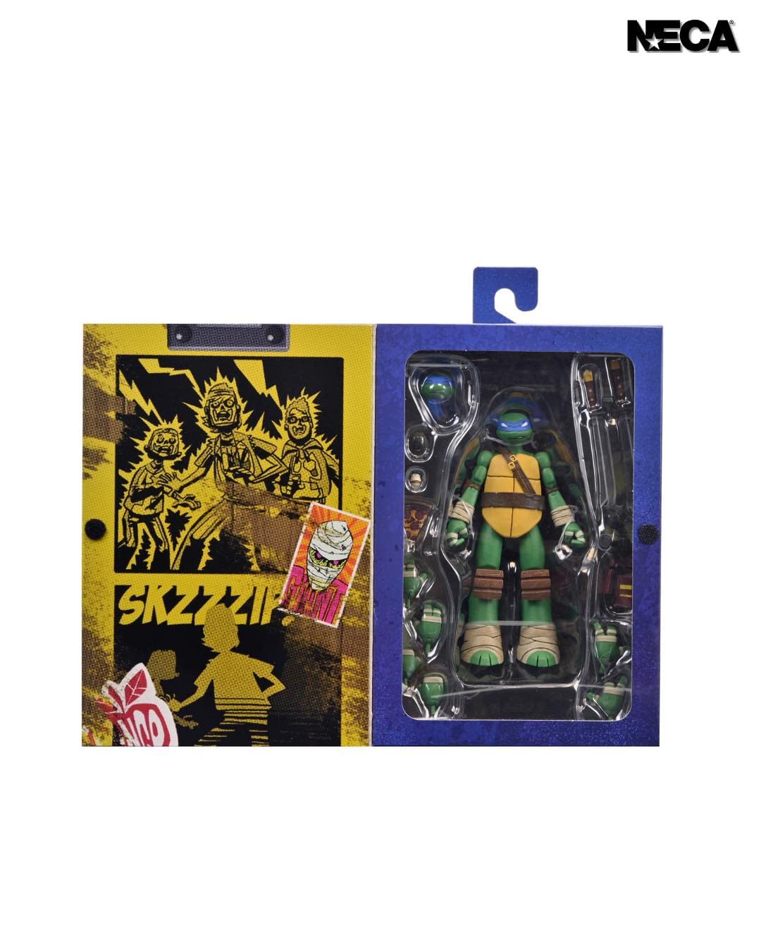 "This 7-inch scale Leonardo figure captures the fearless leader of the turtles with incredible painted details to replicate his animated appearance. He includes an array of episode-specific accessories: interchangeable heads and hands, katanas, Mircrofission Omni-Disintegrator, pizza slice, smoke bomb, and Turtlecom. The figure comes in collector-friendly packaging with illustrations by TMNT artist Ciro Nieli."