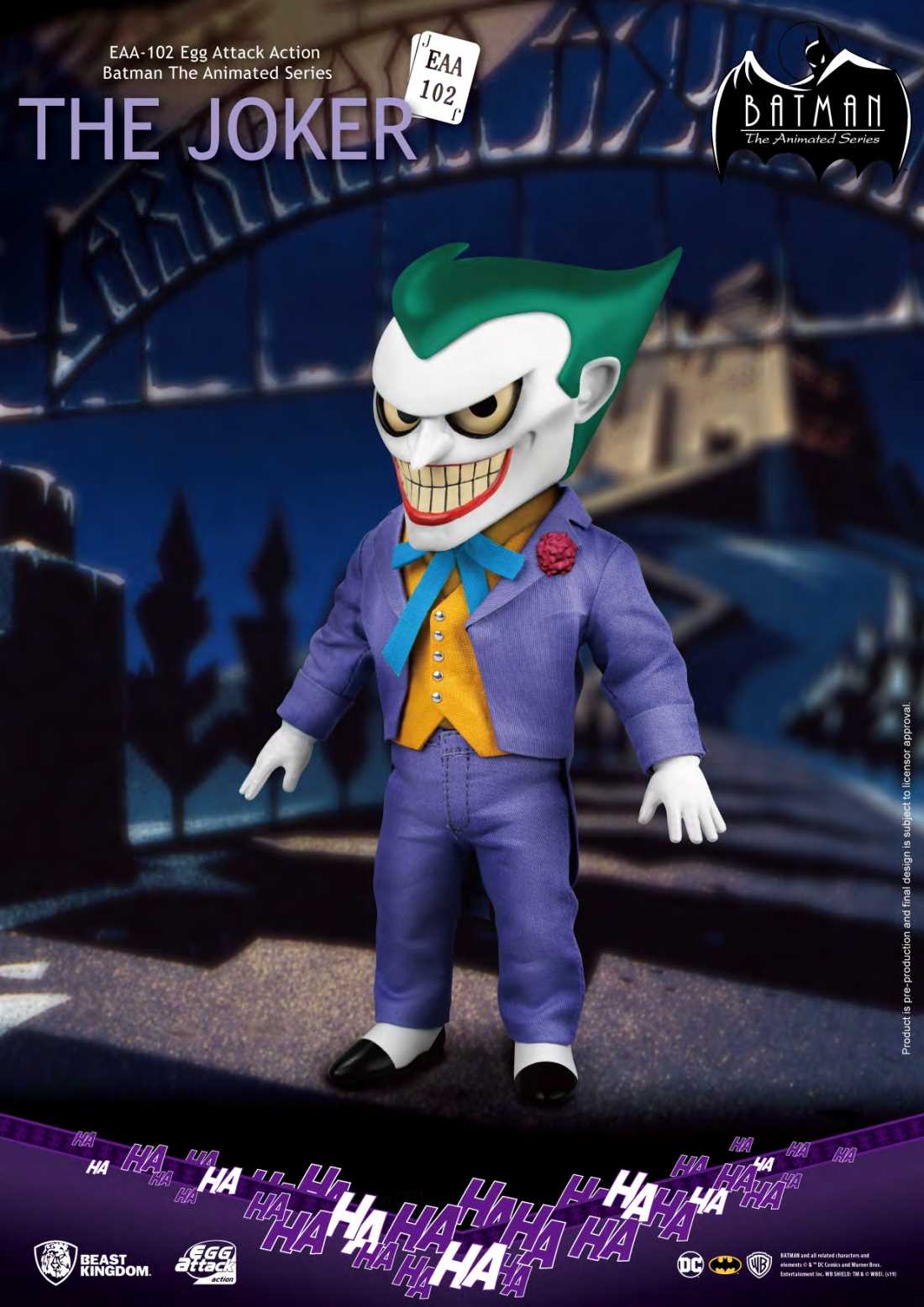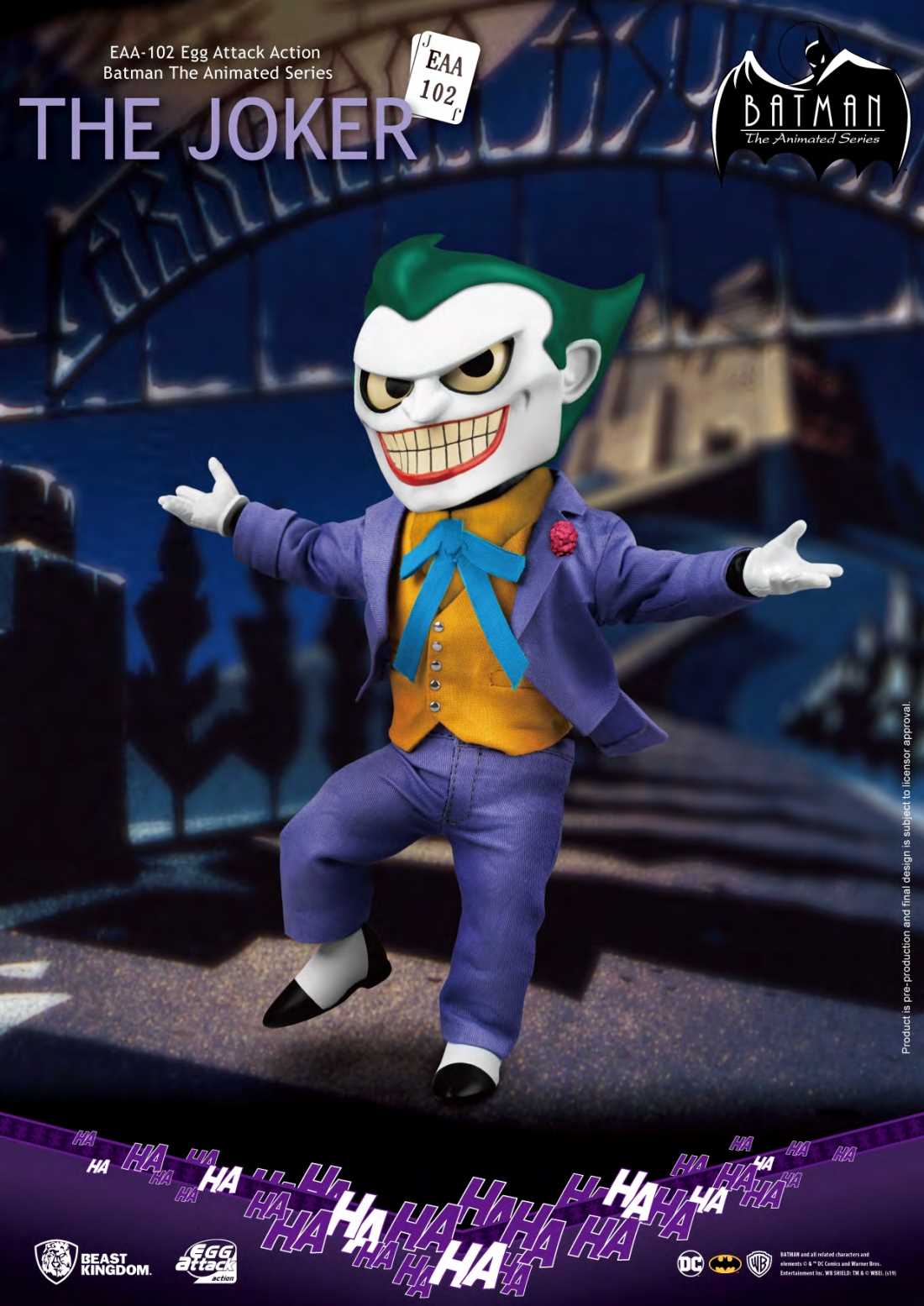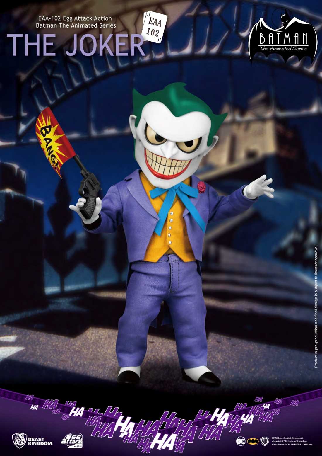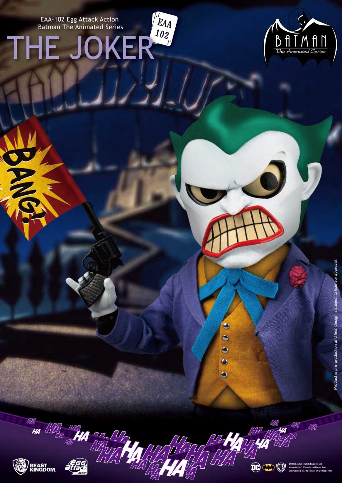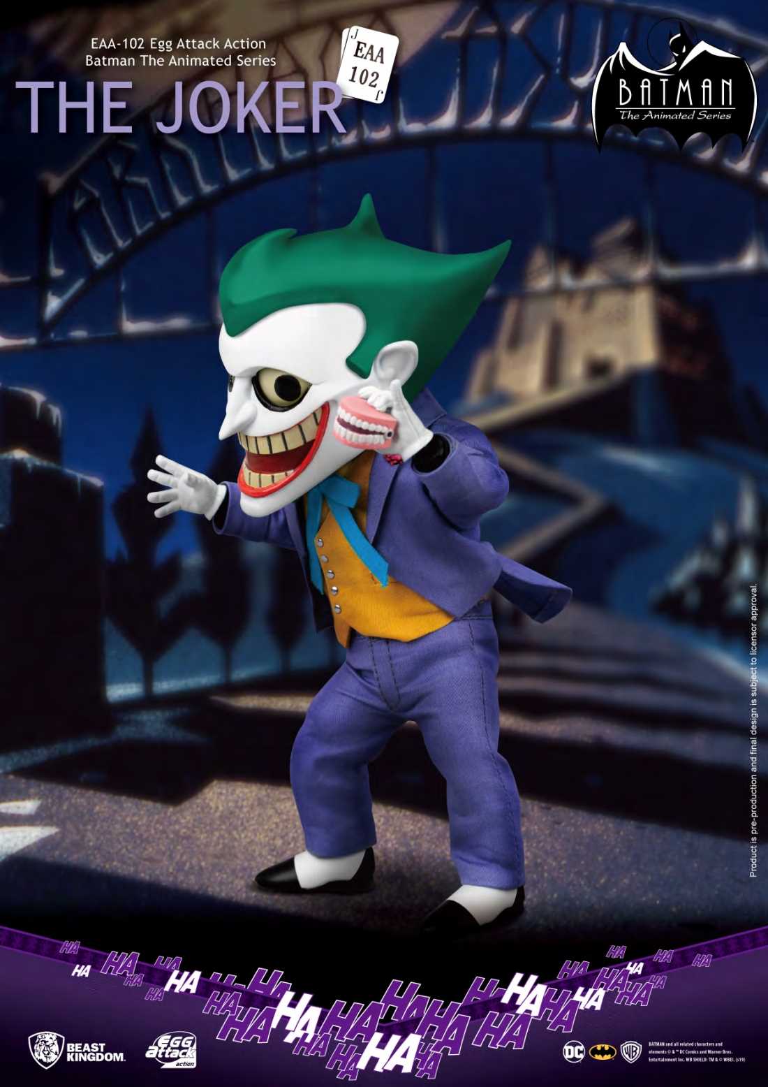 From Beast Kingdom A PREVIEWS Exclusive! Following the release of the EAA-Batman, Beast Kingdom is proud to introduce the Egg Attack Action Joker from Batman the Animated Series! Befitting of any crazed villain, the Joker is seen with his classic purple suit, orange vest, bow tie and 3 replaceable facial expressions fit for any occasion! Collectors can now reenact any of his signature ultra-creepy expressions as well as having the ability to pose him with a high degree of articulation. The figure packs a series of accessories including: four pairs of replicable hands, a clown grenade to fight off his enemies, a Batman Doll for those lonely clown nights, a mutated clown fish, clown dentures and the infamous pistol that shoots out a bang to scare any foe! With a great selection of accessories, high mobility and the use of real cloth for clothing, make sure you don't miss out on this Joker figure!