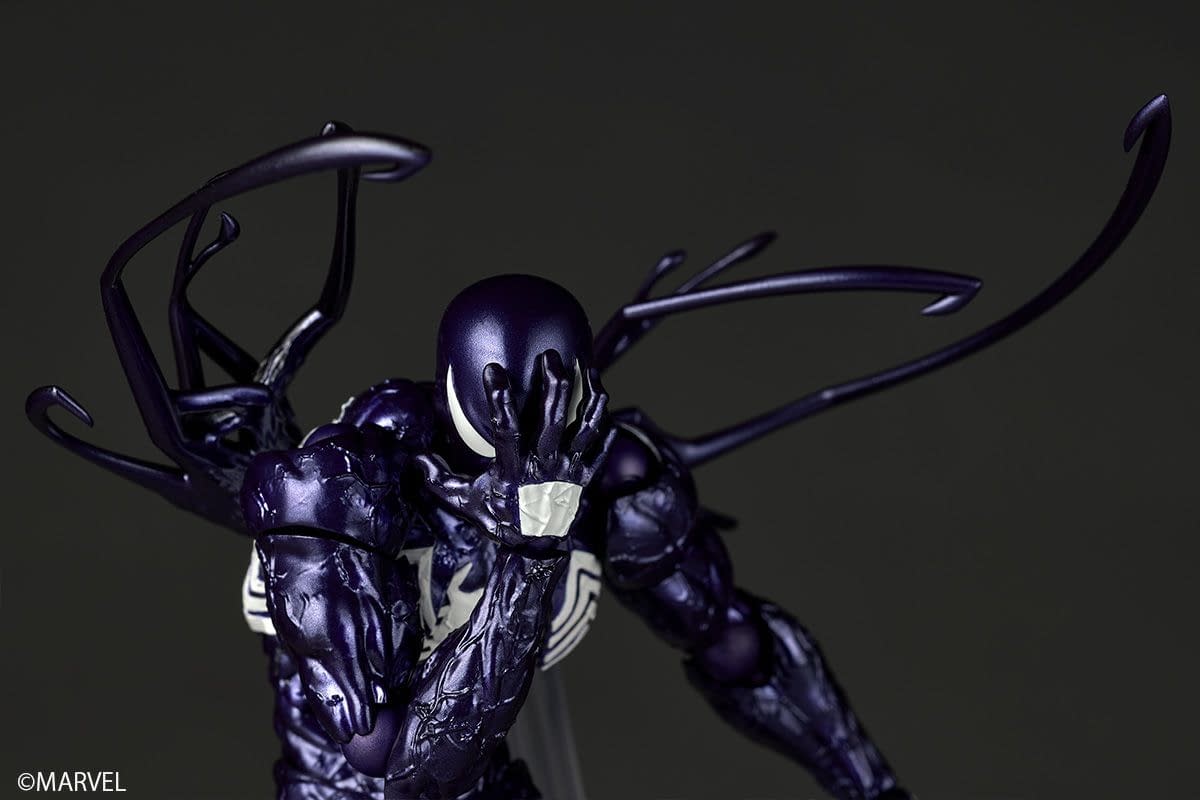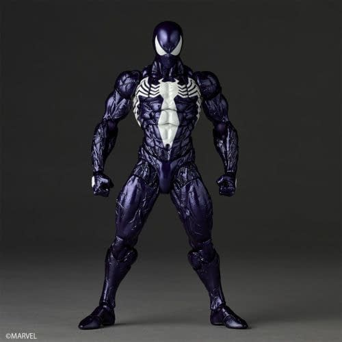 - Marvel Revoltech Symbiote Spider-Man debuts in a striking purple deco inspired by classic comic art.
