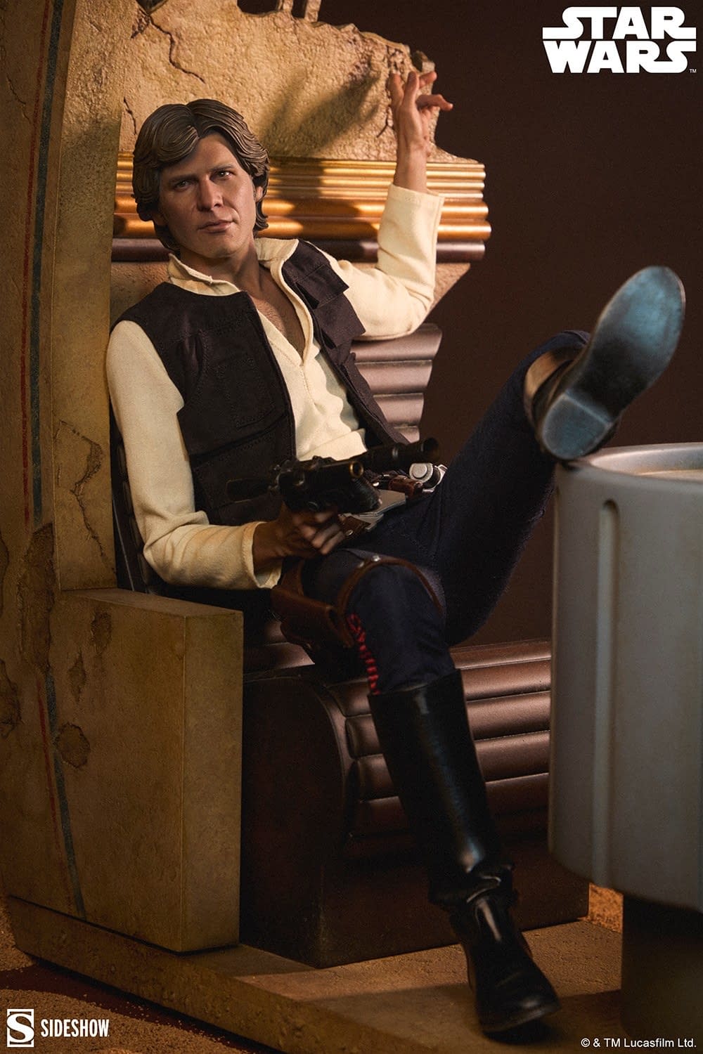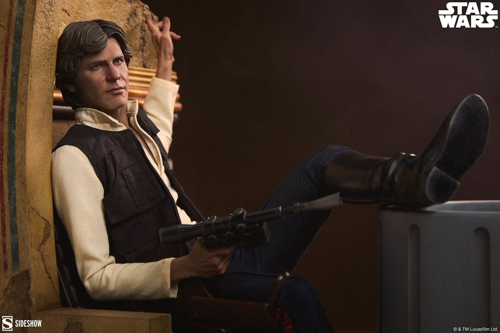 "Sideshow presents the Han Solo: Sorry About the Mess Premium Format Mixed Media Figure. This officially licensed Star Wars collectible presents a picture of dashing, roguish confidence. Even he gets boarded sometimes! Measuring 12.5 inches (31.75 cm) tall, 13.1 inches (33.2 cm) wide, and 7.3 inches (18.5 cm) wide, the Han Solo™: Sorry About the Mess Premium Format Mixed Media™ Figure finds this suave smuggler in Tatooine's seedy underworld."