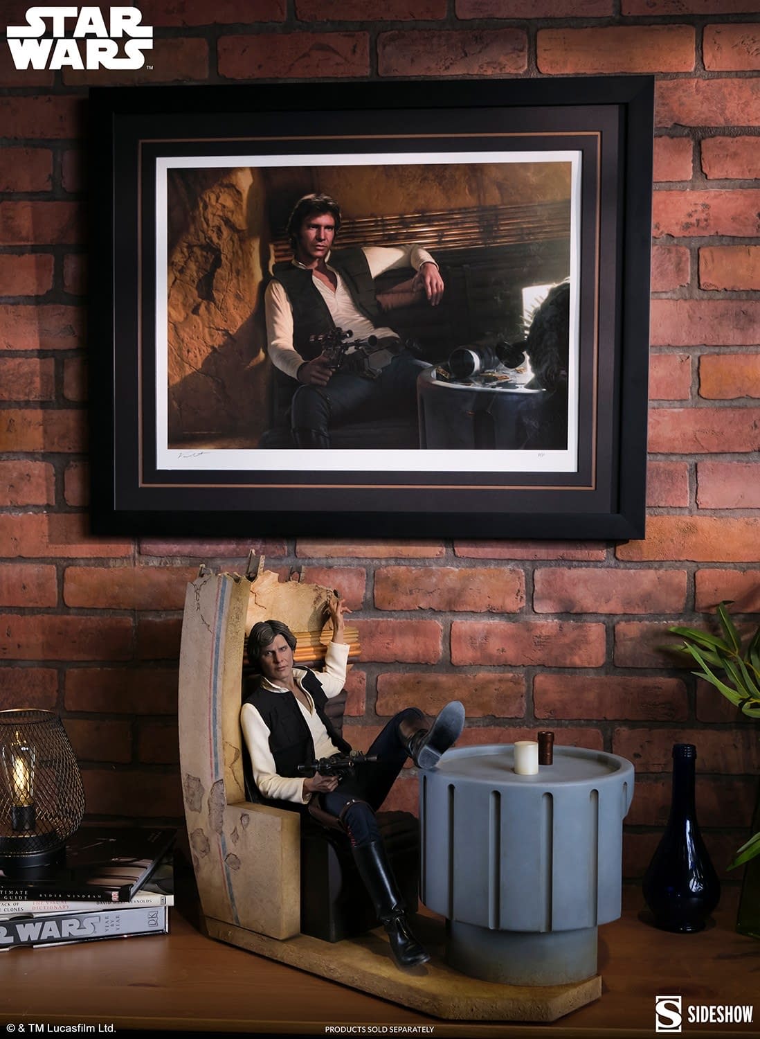 "Han Solo is cool and composed while lounging in a Mos Eisley cantina booth, one leg up on a round table, one hand reaching casually toward the wall. Meanwhile, his right hand carries all the exciting action as he wields a quick-drawn blaster — and we all know who shot first."