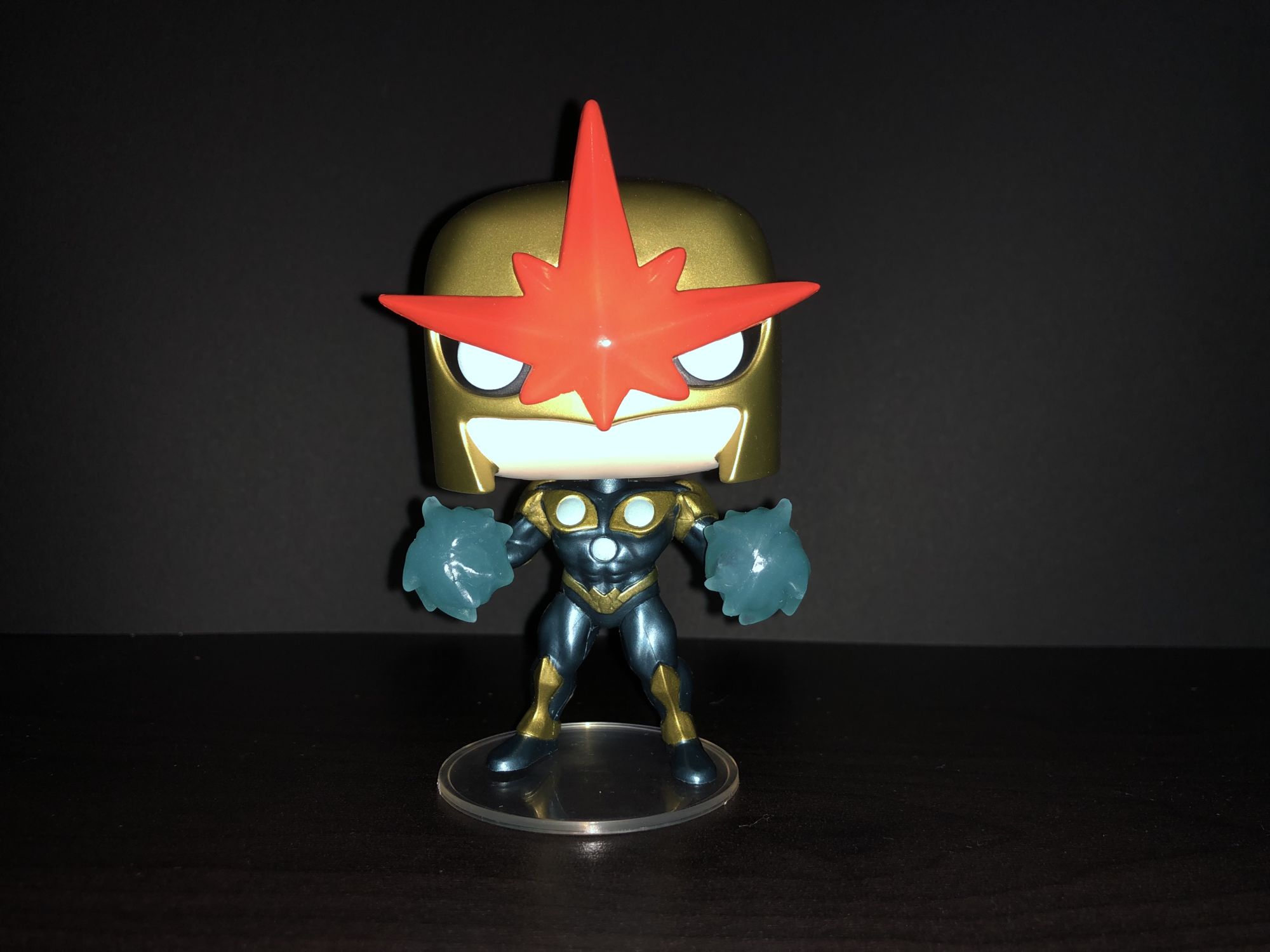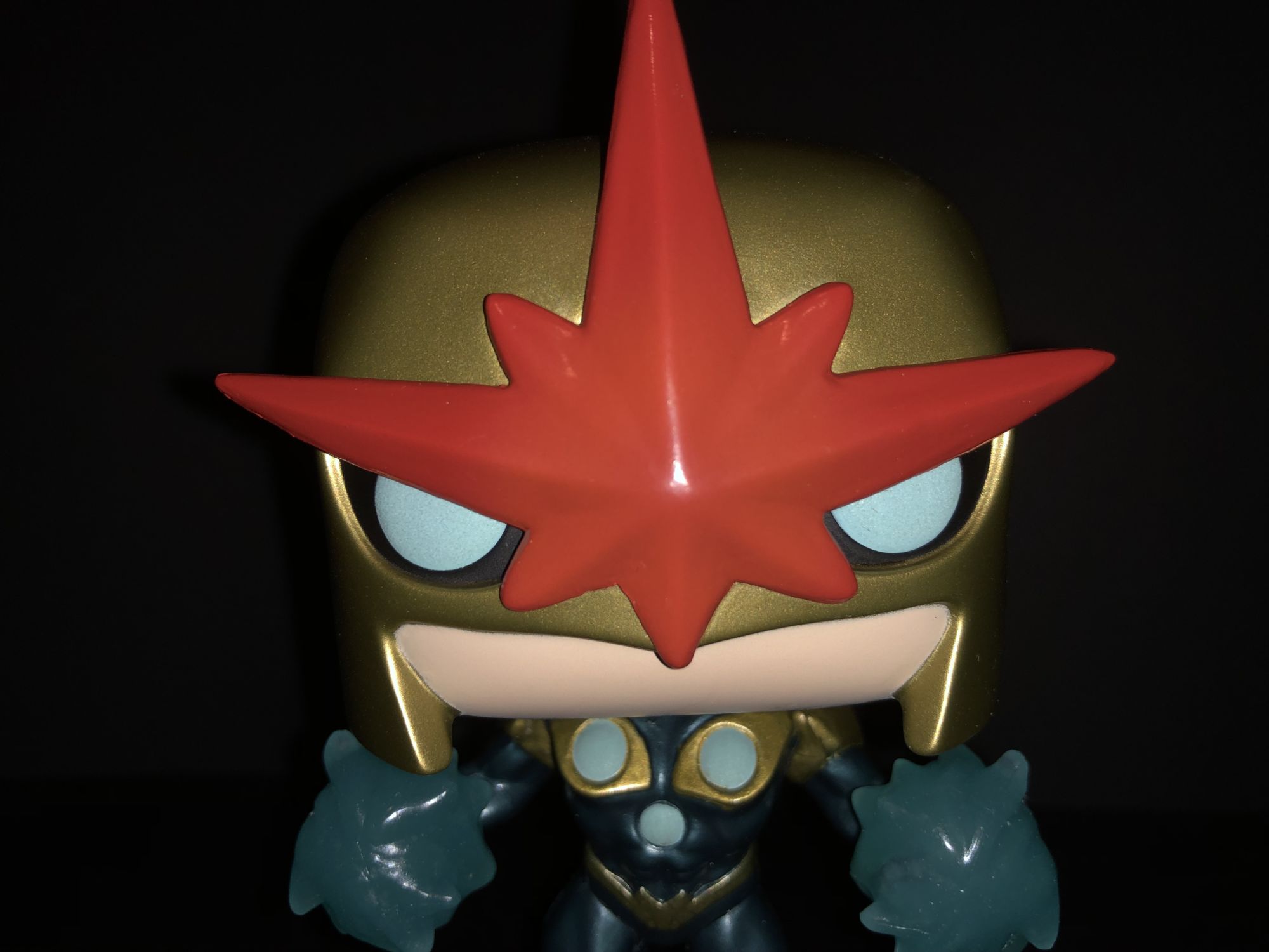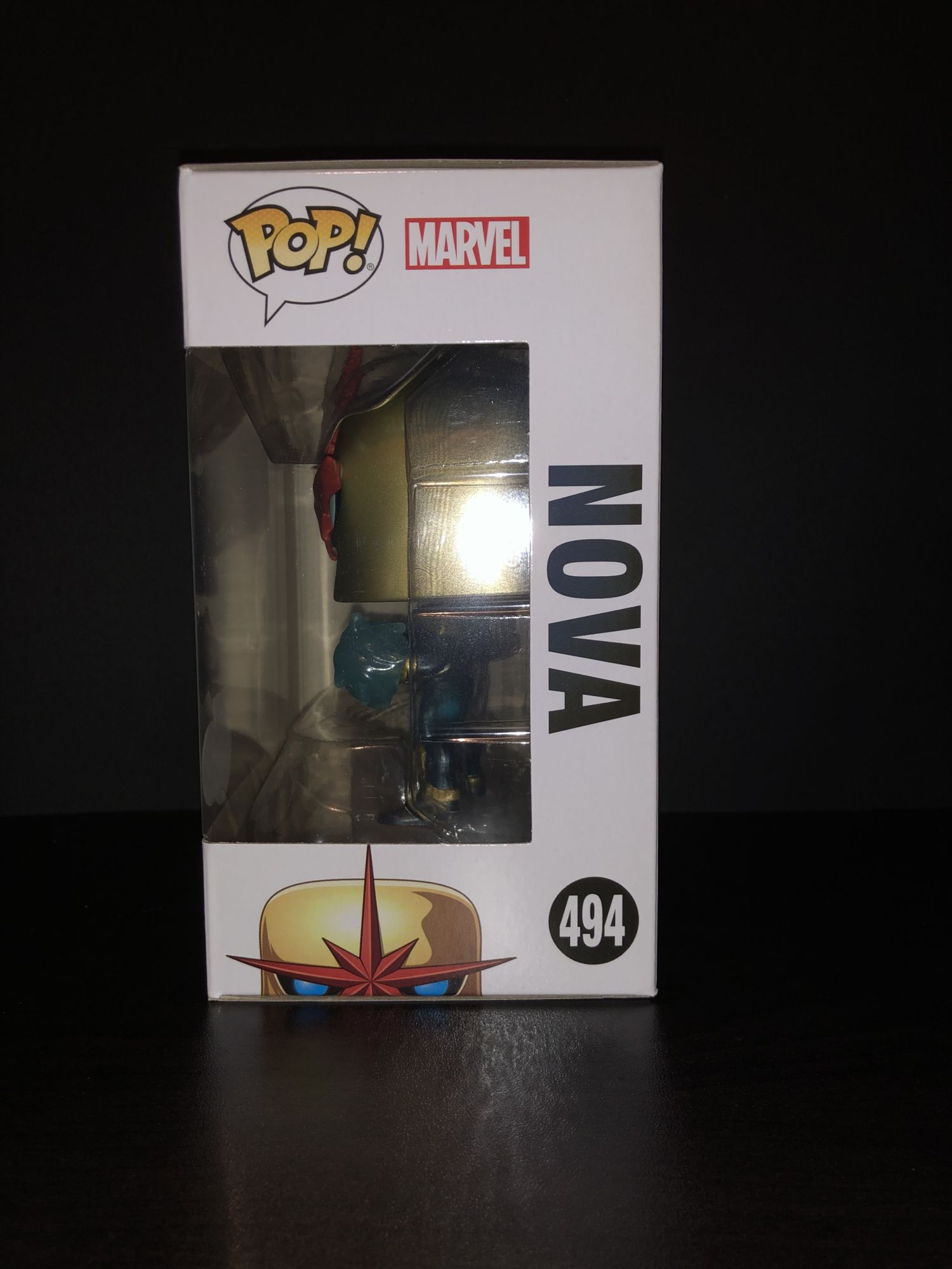As for Nova himself, it is a pretty badass Pop design. The fists outward with the cosmic energy surrounding his hands. He does include a base to stand him up as well. The helmet design is perfect great from the comics. I did notice a couple in-store missing some paint or scuff marks on the lower part of the red star on the helmet. Luckily this one doesn't have any issue. But be on the lookout Nova Corps if wanting one for yourself.