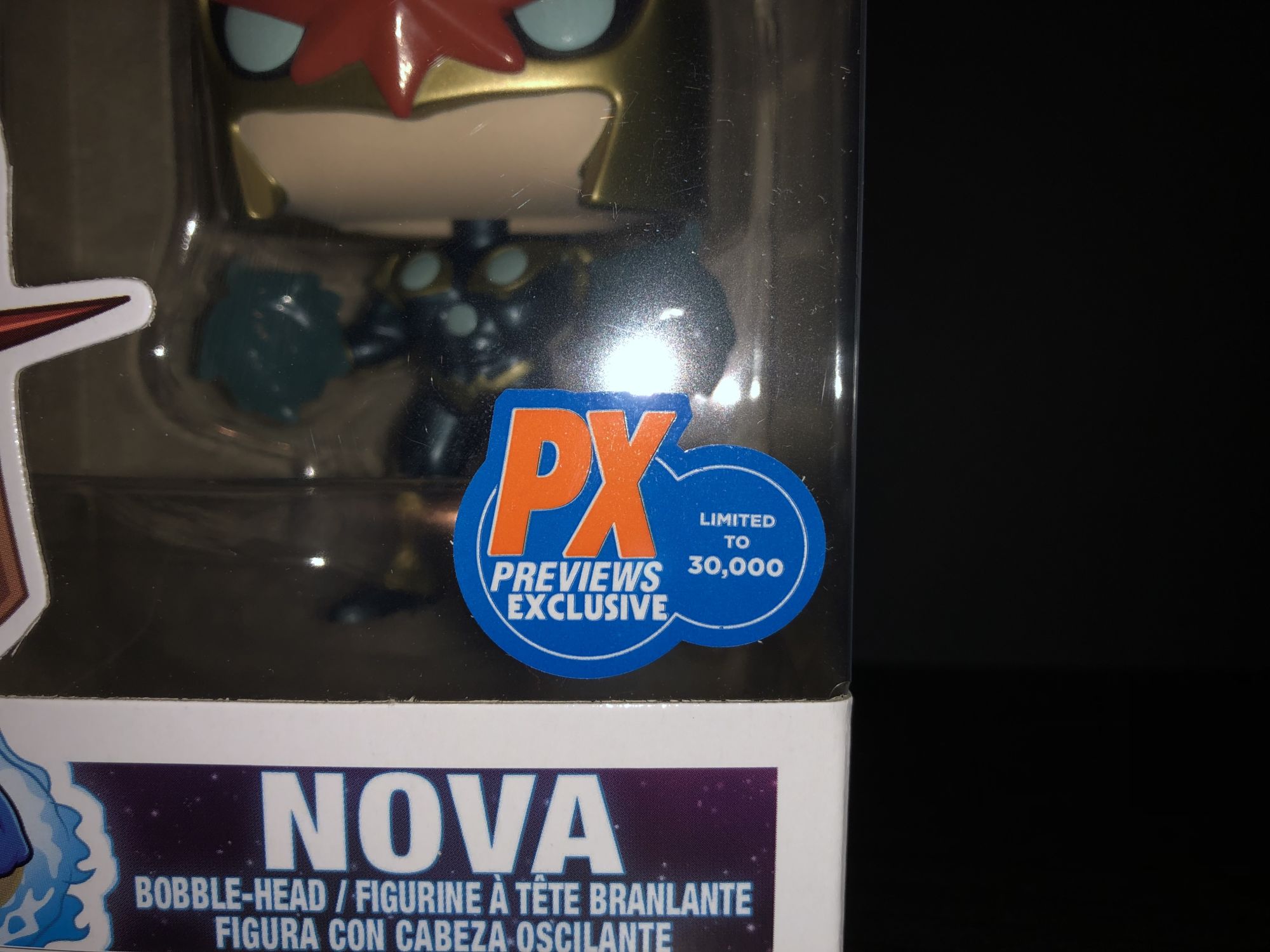 You always gotta start with the packaging. It's a big piece of a lot of collectors, especially in the Funko world. Only major parts to point out are the back which just features the name Nova. As well as the PX Exclusive sticker that says 30,000 LE. That isn't really all the special but it still means it won't be produced after 30K. So that's always a plus with a limited edition figure.