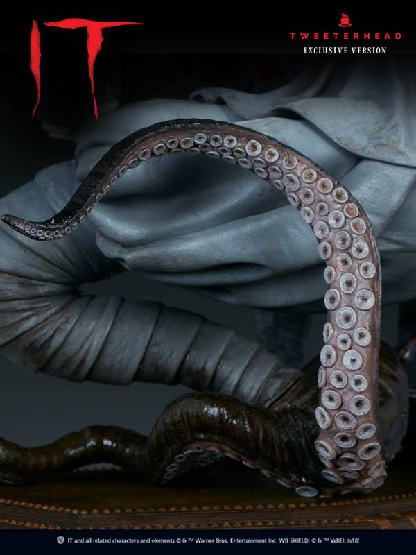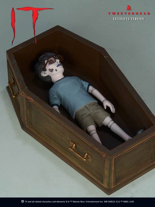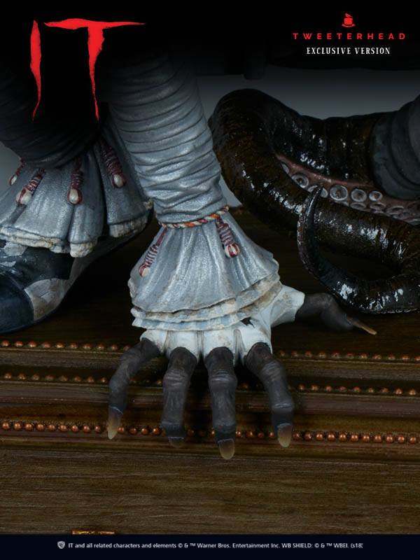 Pennywise collectors have two new items to be excited about adding to their horror collections. Both are based on the 2017 film. First, Tweeterhead will have two versions of a Pennywise maquette available. You can pose him with or without his trademark balloon, and the two versions both stand around 13 inches tall. He is posed on the coffin from Richie's hallucination in the film, and the Tweeterhead exclusive version actually comes with the dead Richie inside. He also comes with swap out hands, swap out tentacle feet, and more. Both versions, the regular and the exclusive, go up for order today.