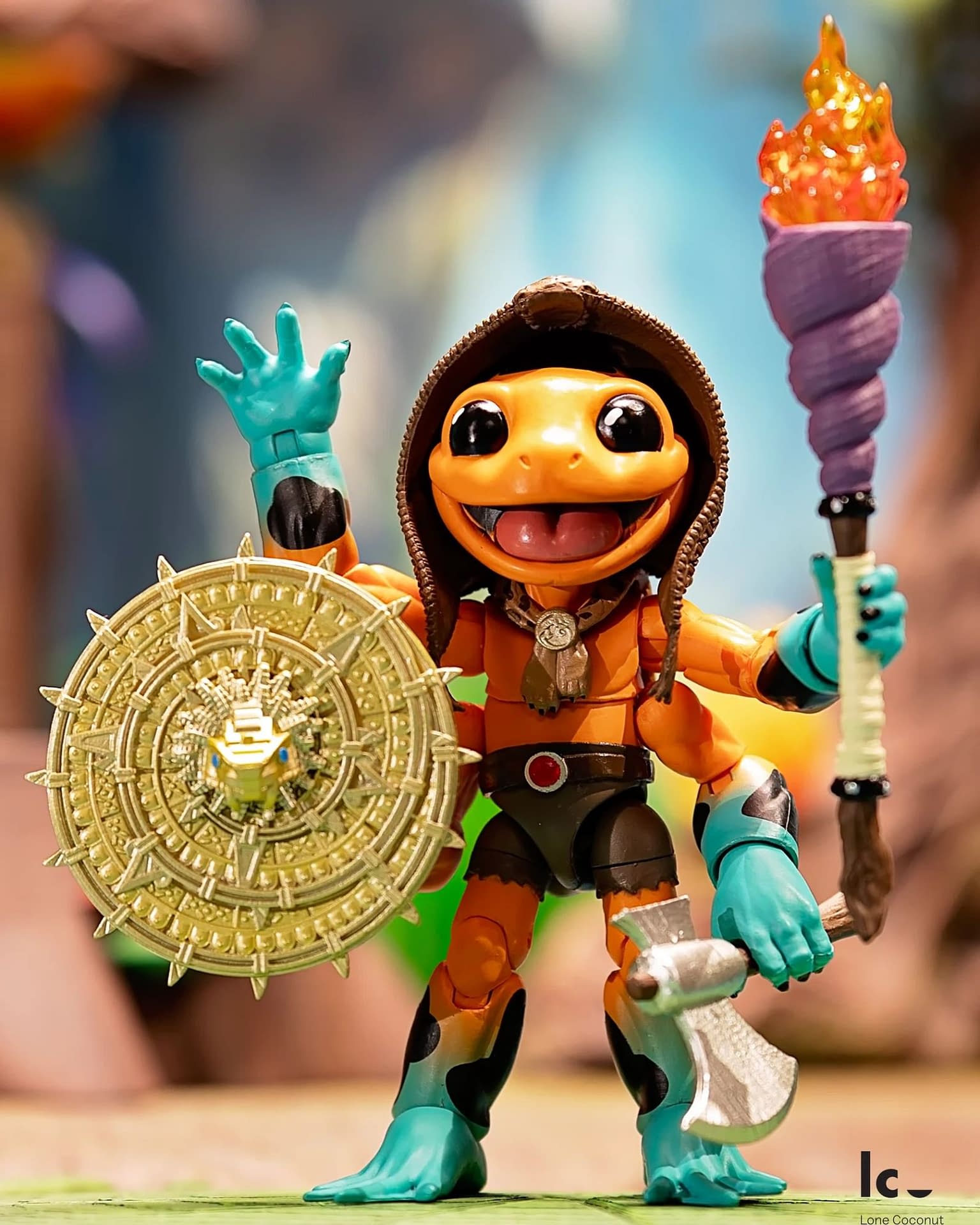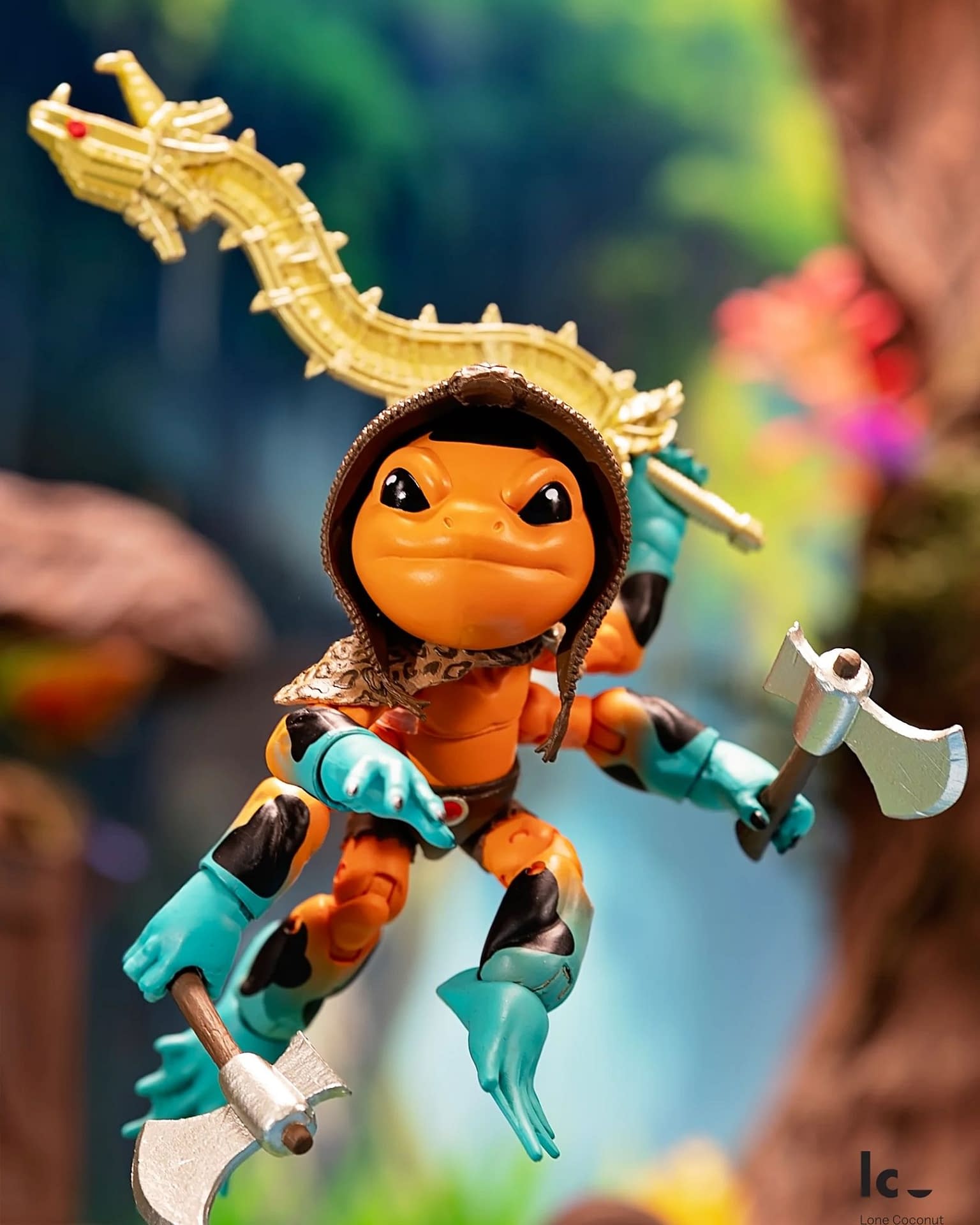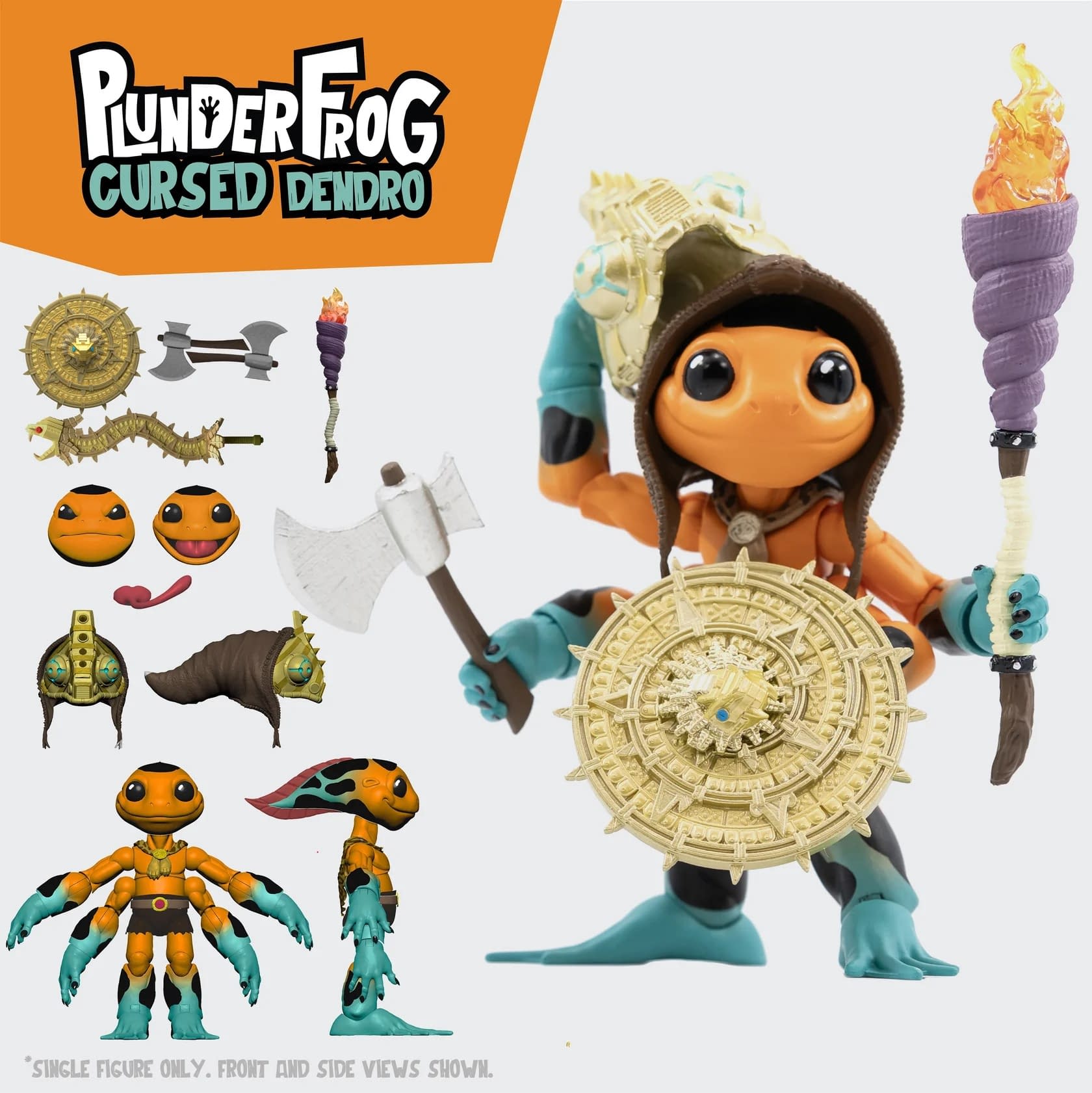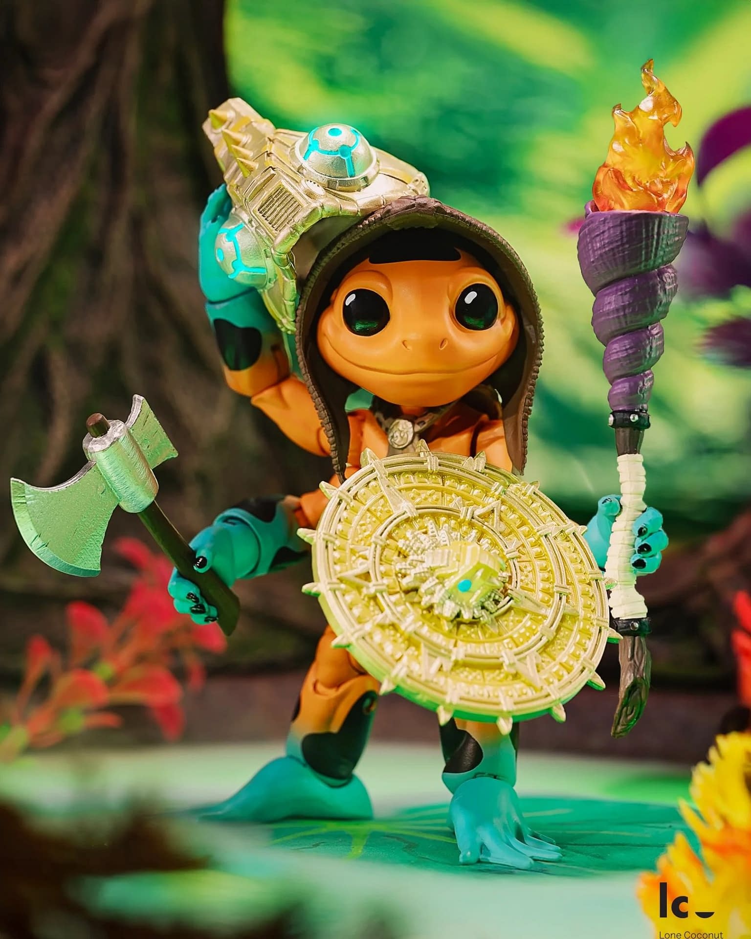 Beware the arrival of the PlunderFrog Cursed Dendro, a powerful leader and warrior of their island. The PlunderFrogs are reclusive mystics who seemingly trade with the other members of the Plunderlings line, but they will protect ancient relics from falling into the wrong hands. This orange-and-teal frog is beautifully detailed and will come with three swappable heads, interchangeable tongues, and a variety of weapons. Lone Coconut was sure to include some cursed accessories, such as a mask, a sword, a shield, two axes, and a torch. The first wave of PlunderFrogs has sold out, so stay tuned for restocks through Lone Coconut and BBTS at $34.99.
