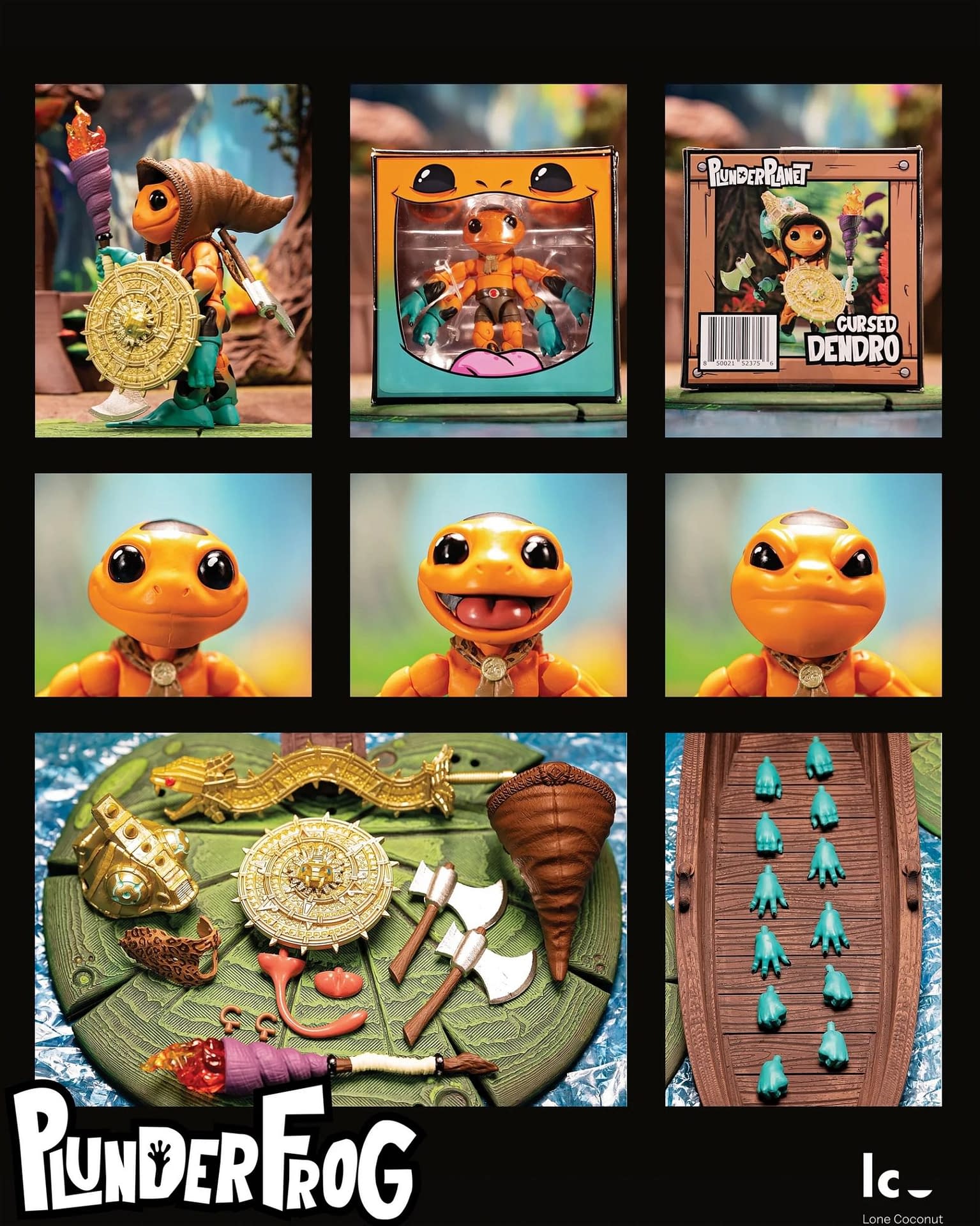 "The PlunderPlanet is a fantasy action figure line with a tropical twist. These greedy, adorable pirates travel from island to island looking for treasure and mischief. The Plunderfrog are reclusive mystics who trade with the Plunderfolk to fuel their rituals and experiments. Cursed Dendro is a wise and powerful leader amongst the Plunderfrog and guards their island fiercely. While he trusts outsiders, he will trade for artifacts from the age of the Plunderking, determined to restore their ancient power and keep them out of the wrong hands."