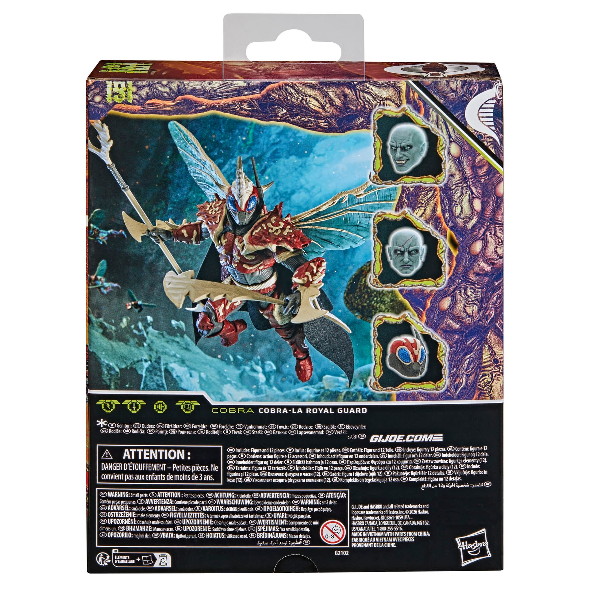 "New to the G.I. JOE Classified Series line, Cobra-La Royal Guard comes ready for adventure, with multiple points of articulation for high poseability. This Cobra-La Royal Guard figure contains 12 character-inspired accessory pieces including 2 wings, 2 helmeted and 1 unmasked alternate heads, spear, removable shoulder armor, swappable bioorganic arm blade gauntlets, sword, and weapon accessory;plusa removable soft goods cape."