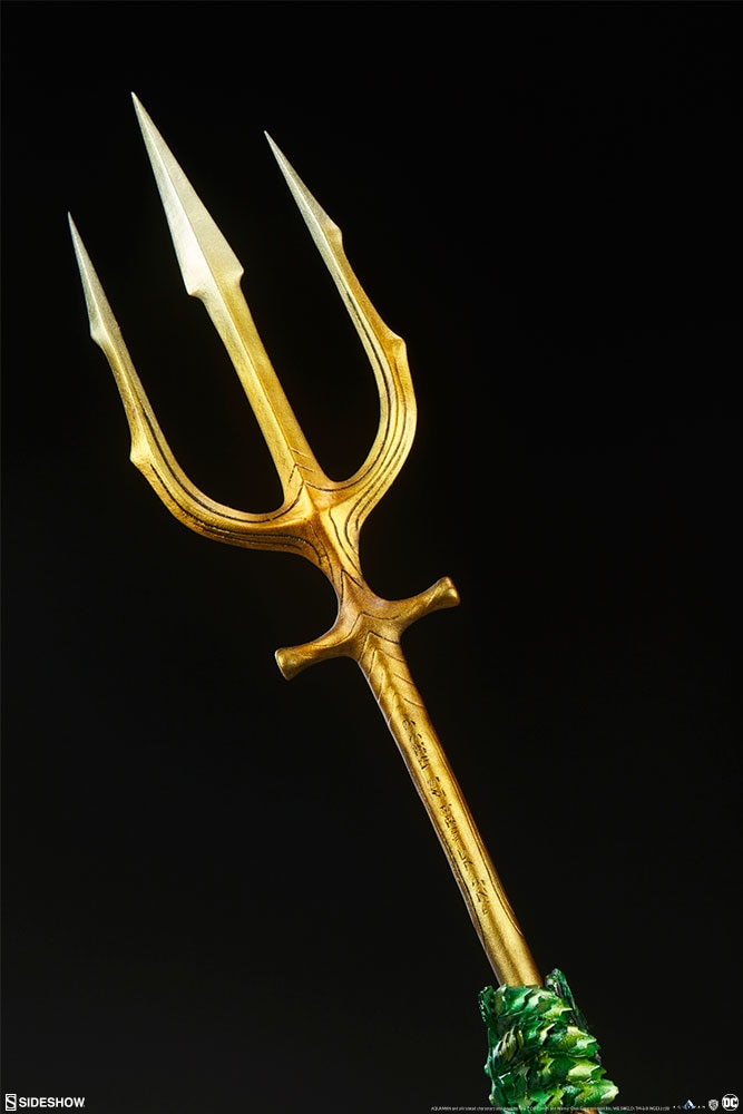 The Aquaman Premium Format™ Figure features an orange metallic suit sculpted with incredibly detailed scale armor, paired with sculpted green metallic gloves and leg armor. In his right hand, Aquaman clutches a shining golden trident intricately inscribed with Atlantean text, and at his hips sculpted golden tassets and a belt add to Arthur Curry's battle-readiness. The figure also wears textured green fabric pants and boot elements carefully tailored to complete the costume inspired by Aquaman's most iconic, colorful look.