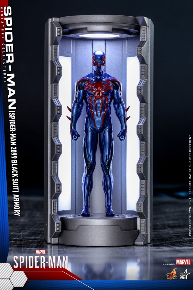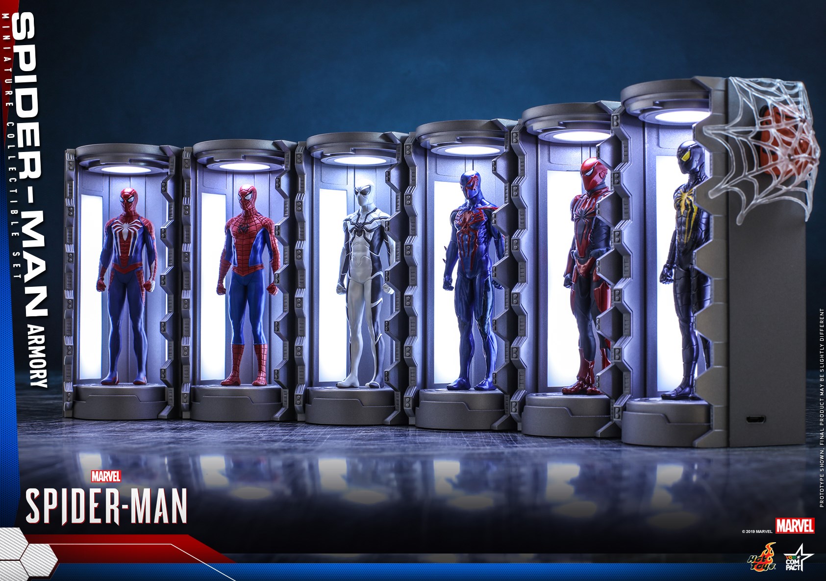 Turning Spidey's highly stylized suits, as they appeared in the critically acclaimed and bestselling video game, to unique displays, Hot Toys latest LED light up Marvel's Spider-Man Spider-Man Armory Miniature Collectible line-up features the fan-favorite web-slinger in the Advanced Suit, Classic Suit, Future Foundation Suit, Spider-Man 2099 Black Suit, Spider Armor – MK III Suit, and Anti-Ock Suit with luminous reflective patterns as Spidey suits are displayed heroically upright in the reimagined armory. Each Armory Collectible measures approximately 12cm tall, whereas each Spider-Man mini-figure is approximately 8.5cm tall. Collectibles are available individually.