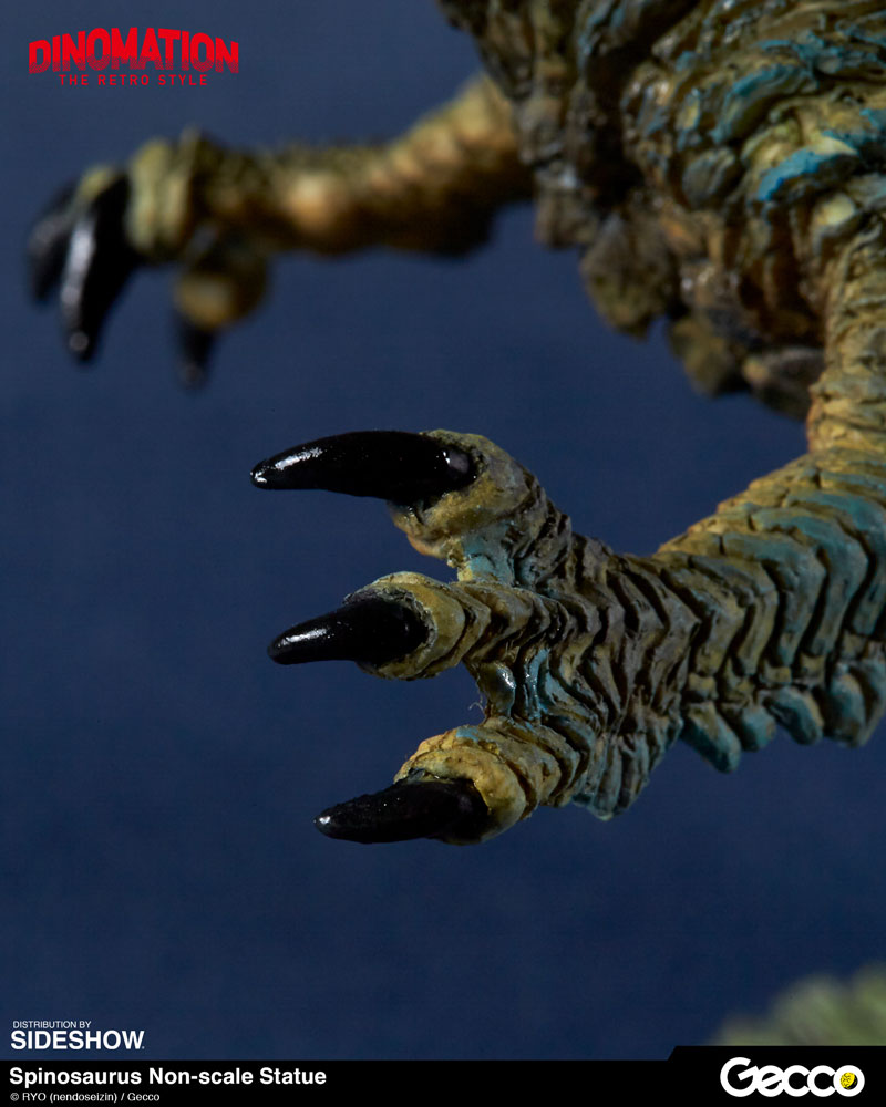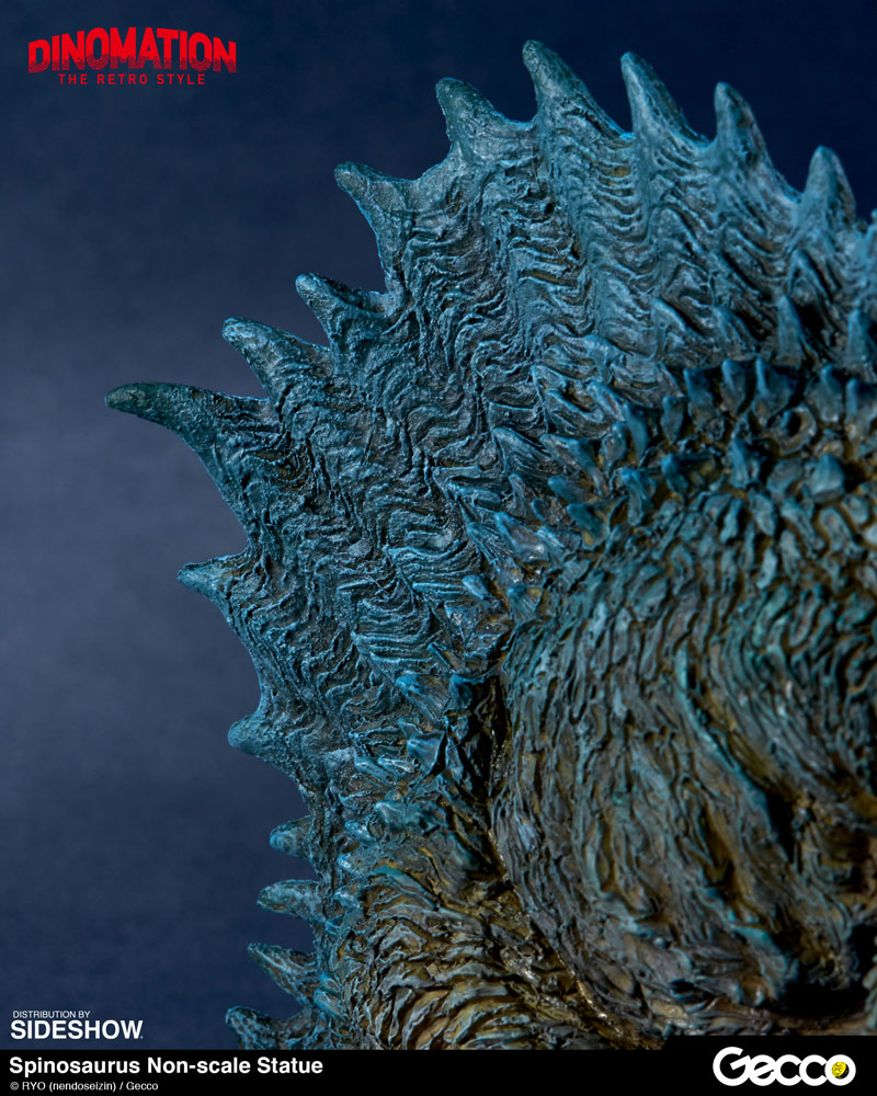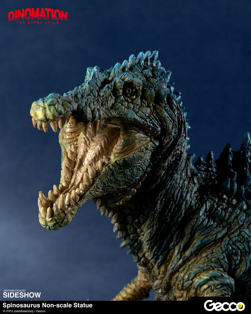 Gecco finally lets dinosaurs walk the Earth once again as they bring the Spinosaurus back to life. Last year Gecco started a new series of statues that are solidifying that memory of classic stop motion animation style dinosaur films. With graphics so limited back in the day some films feature claymation monsters especially dinosaurs. We have already seen the T-Rex get his statue and now the Spinosaurus gets his turn. Fun Fact 349: We do not actually know what a Spinosaurus looks like as the partial skeleton found in the Sahara was destroyed during a bombing in WWII. Gecco does what they can with this beautiful Denotation statue and from the detail and color is a very refreshing take on classic dinosaur scene.