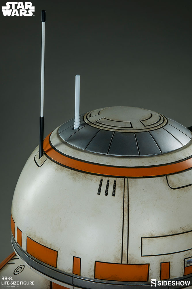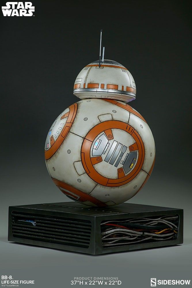 The BB-8 Life-Size Figure captures the presence of the rolling Resistance droid who came to life for fans everywhere in Star Wars: The Force Awakens. This loveable, spherical droid measures 37" tall from the bottom of the Star Wars thematic base to the top of the antennae. BB-8 is detailed with orange and silver paneling on both his round body and head, painted with weathering effects to bring all the action of the galaxy to your collection. The fiberglass astromech has a repositionable head dome, and the body can be shifted in different positions on his base.