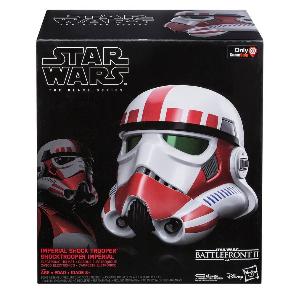 Then we have the Star Wars Incinerator trooper from the Mandalorian. This helmet features an interesting red line down the center of it that gives it a menacing shine. The battle damage design gives an interesting unique twist to the classic white helmets and they are currently online and available for purchase here. Last but not least we have the Shocktrooper helmet exclusive to GameStop from Star Wars: Battlefront II. This helmet adds a nice amount of red decals over the helmet and it goes well with the green lens you can look through. It also has a voice changer attachment that is perfect for you to disrupt rebel transmissions. You can get your own in-store at any GameStop or when they restock online and you can find them located here.